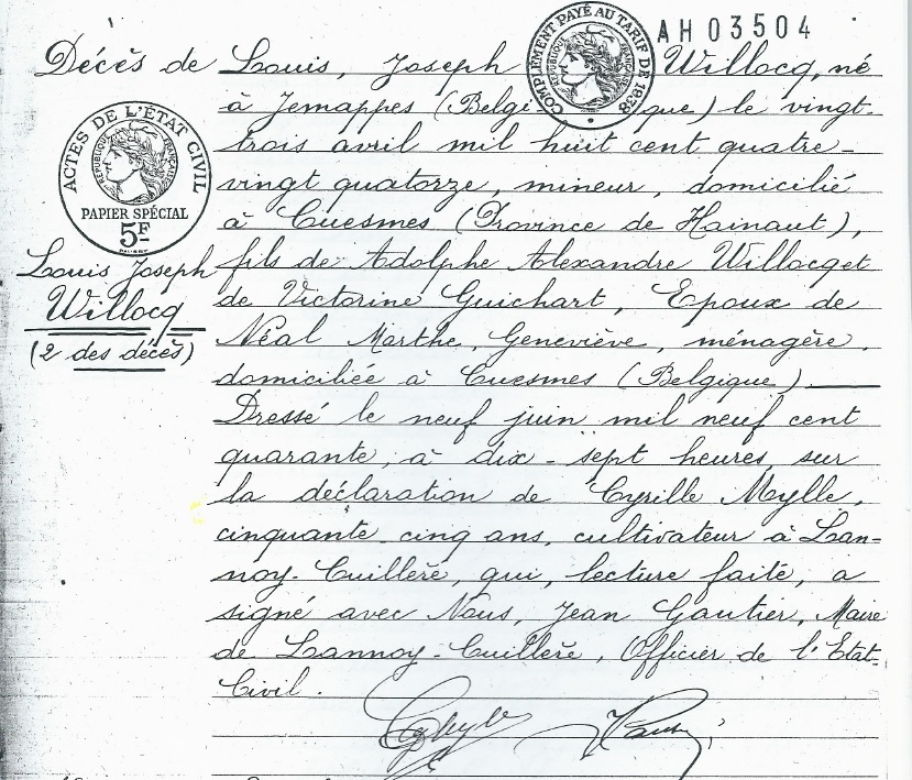 Acte de décès à Lannoy-Cuillère, Oise, FR
