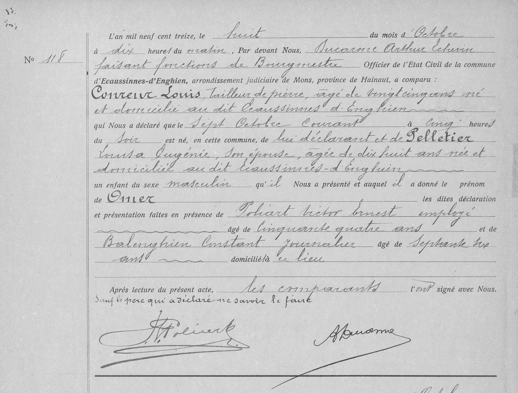 Acte de naissance à Écaussinnes-d'Enghien, HT, BE (Source [358])