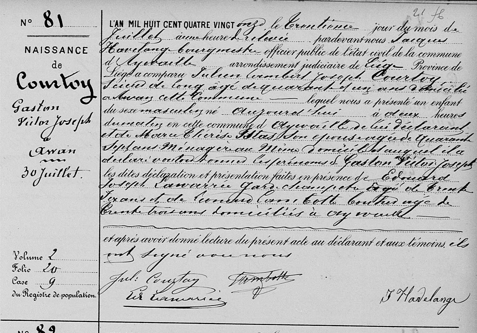 Acte de naissance à Awan (Aywaille), LG, BE (Source [358])
