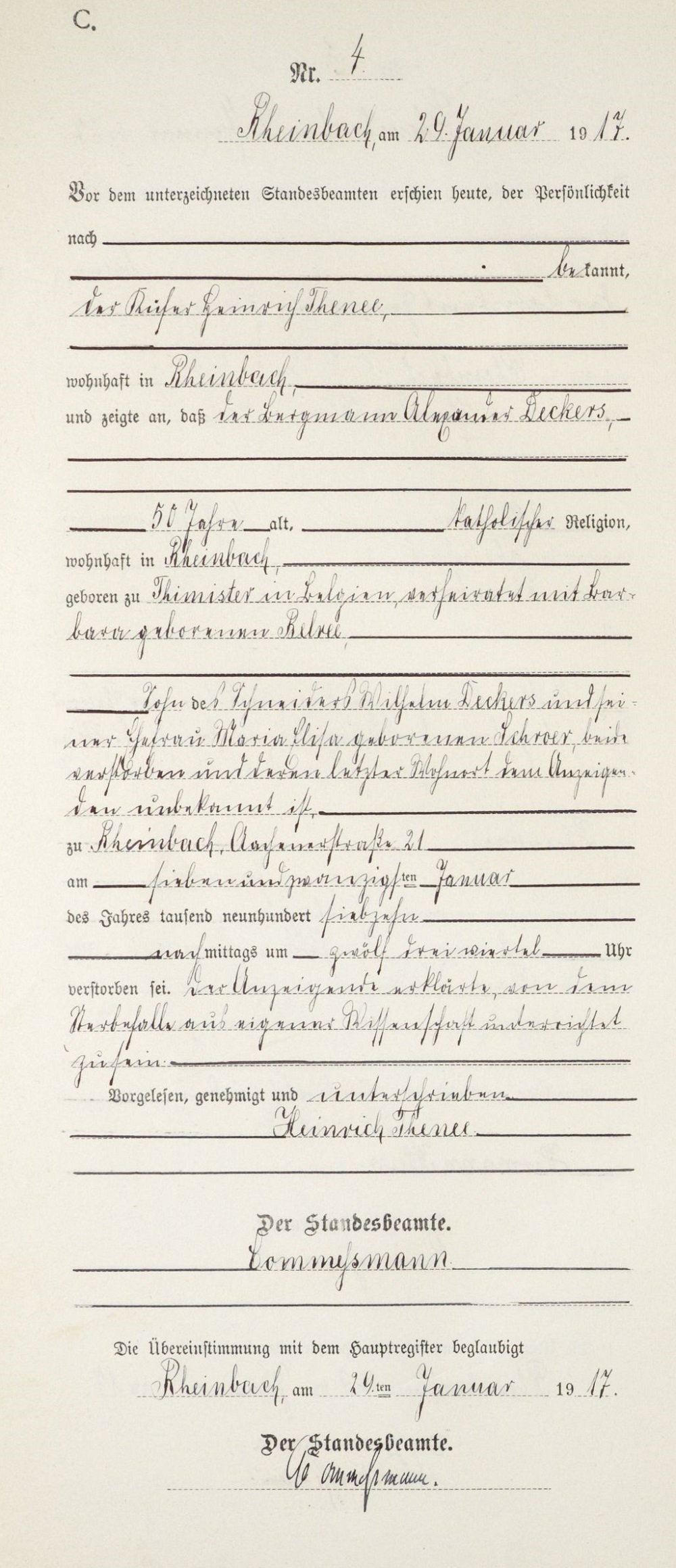 domicile est inconnu du déclarant, est décédé à Rheinbach,