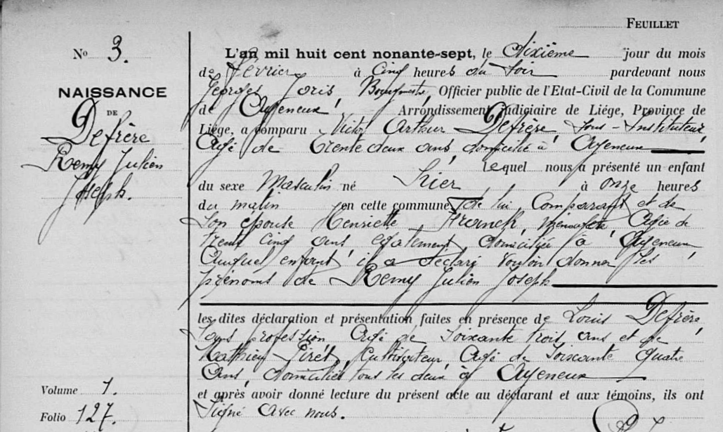 Acte de naissance à Ayeneux, LG, BE (Source [358])