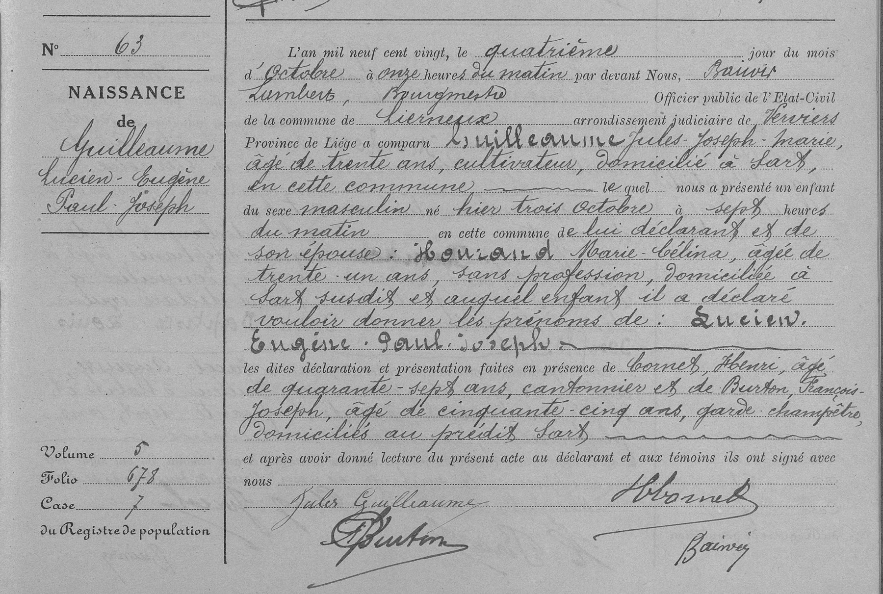 Acte de naissance à Sart (Lierneux), LG, BE (Source [358])