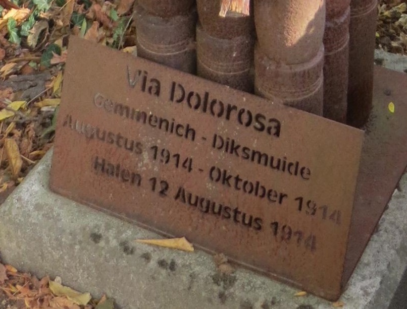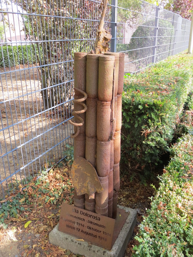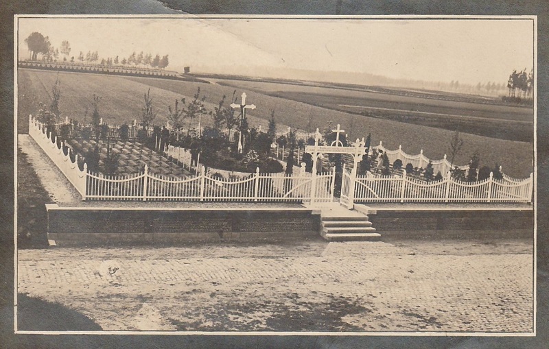 Stenen gedenkkruis onder bomen achter op de begraafplaats