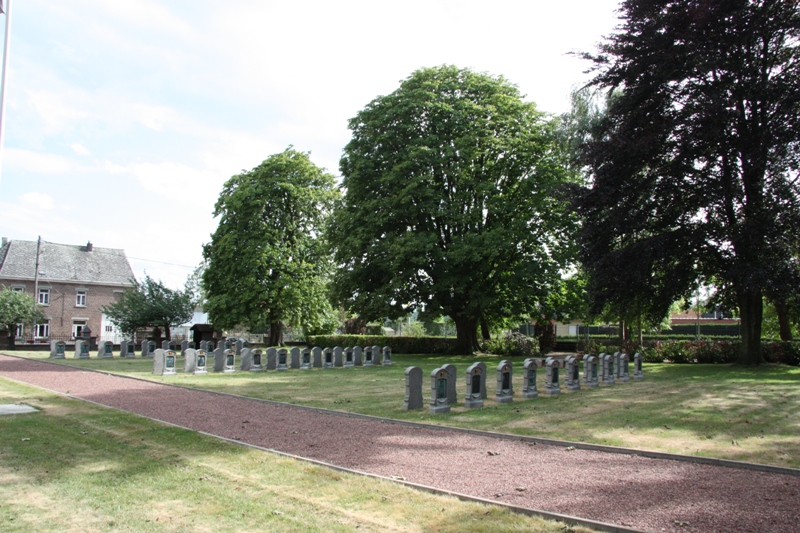Stenen gedenkkruis onder bomen achter op de begraafplaats