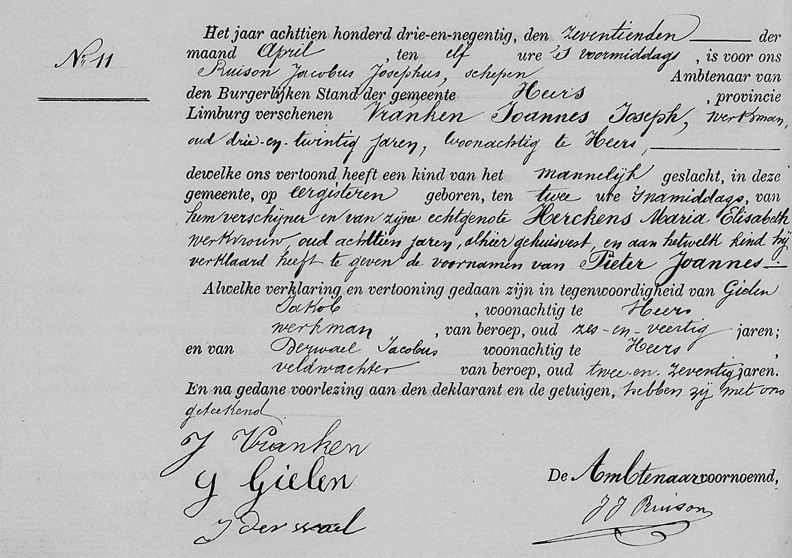 Heers, LI, BE: Geboorteakte nr 11 (1893) (Bron [358])