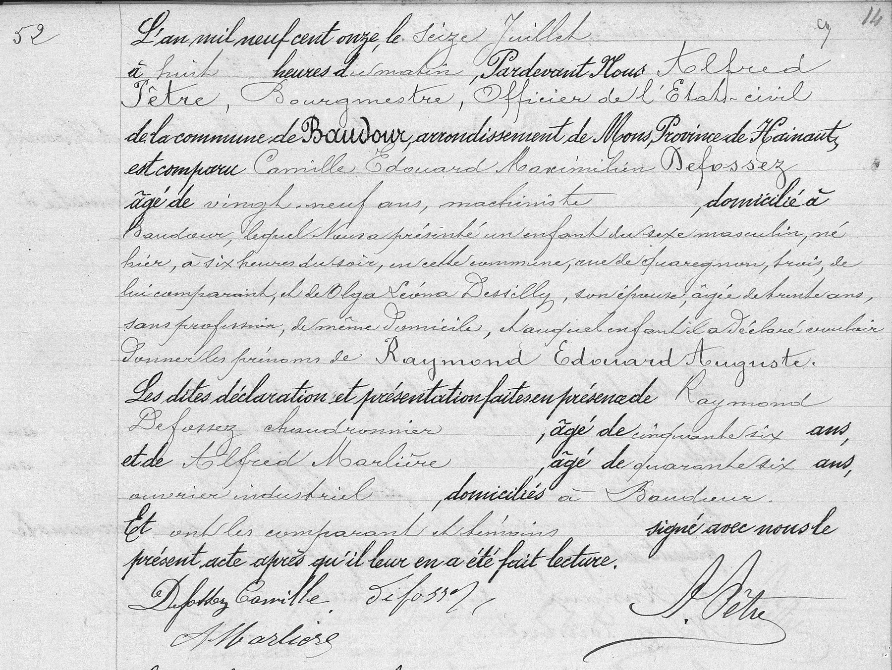 Acte de naissance à Baudour, HT, BE (Source [358])