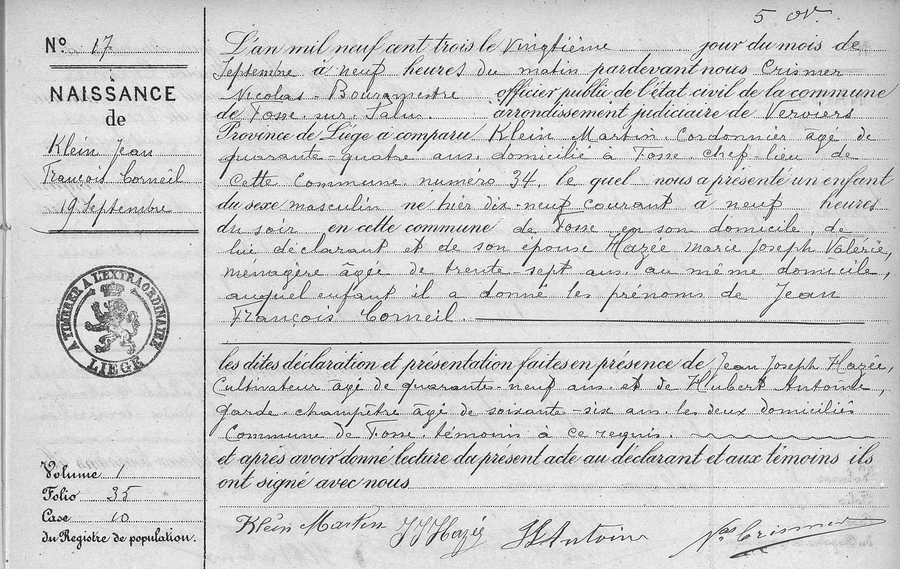 Acte de naissance à Fosse-sur-Salm (Trois-Ponts), LG, BE