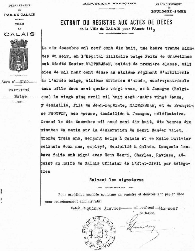 Son acte de décès à Calais, Pas-de-Calais, FR (Source [167])
