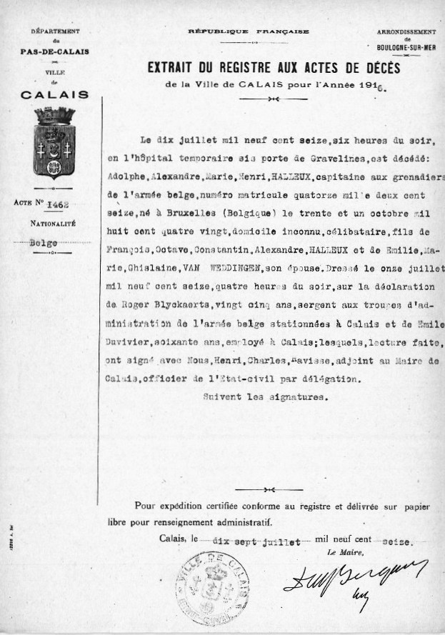 Acte de décès à Calais, Pas-de-Calais, FR (Source [167])