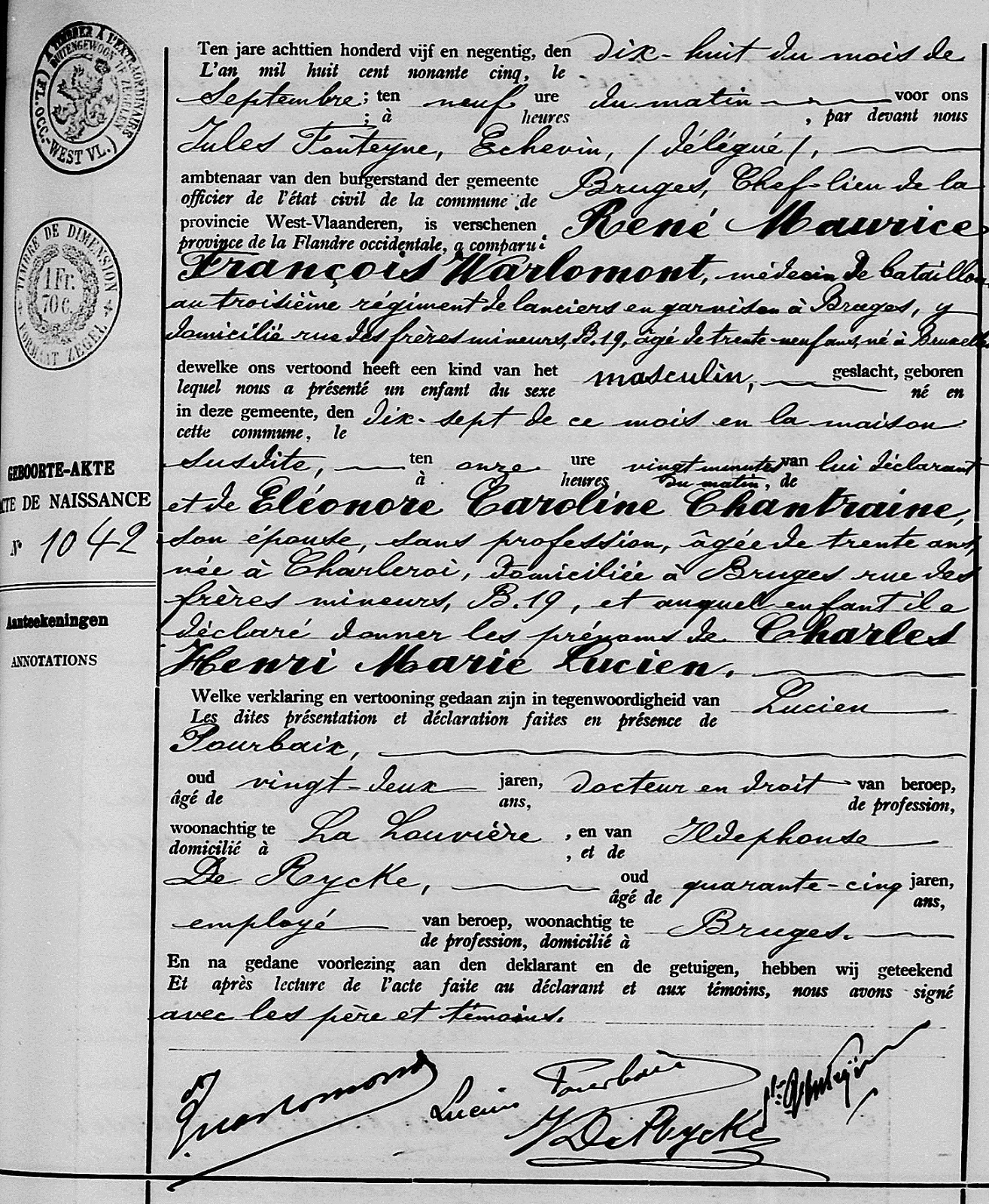 Brugge (Bruges), WV, BE: Acte de naissance n° 1042 (1895)