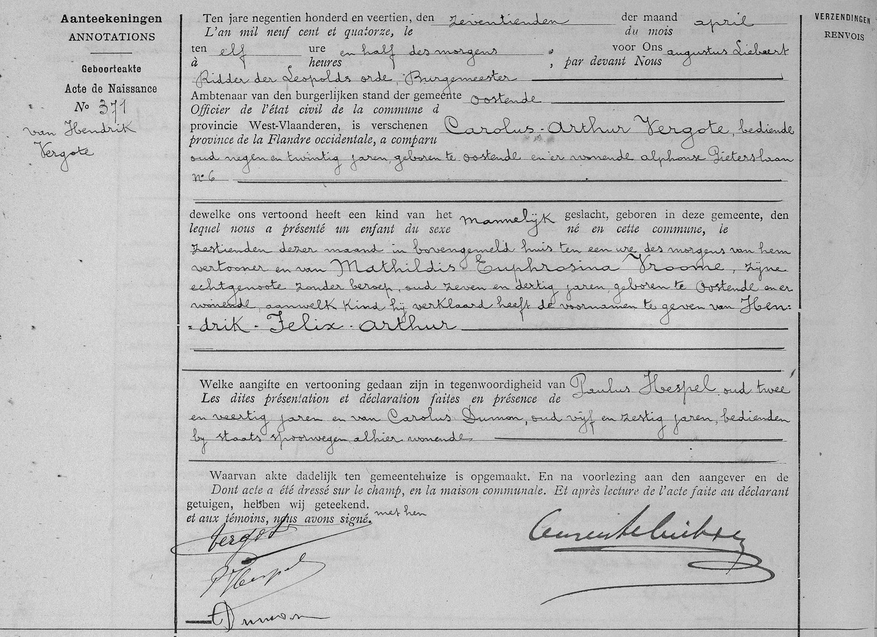 Geboorteakte te Oostende (Ostende), WV, BE (Bron [358]) (Het beeld