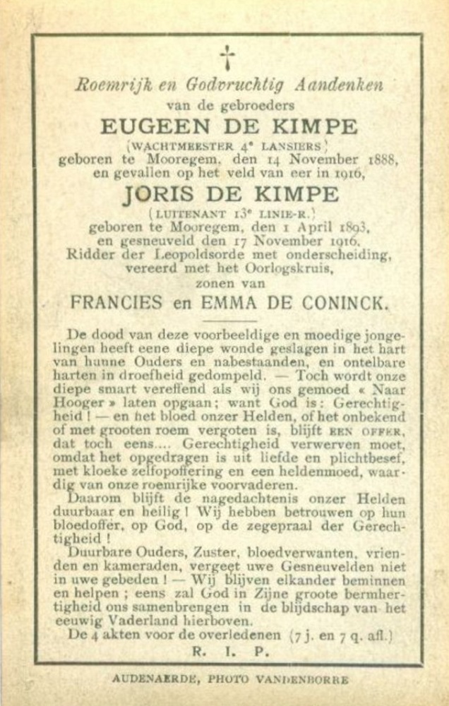 Rouwprent voor de gesneuvelden van Moregem (Collectie heemkundige
