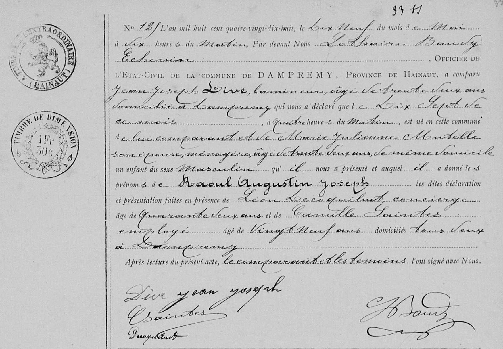 Acte de naissance à Dampremy, HT, BE (1898) (Source [358])