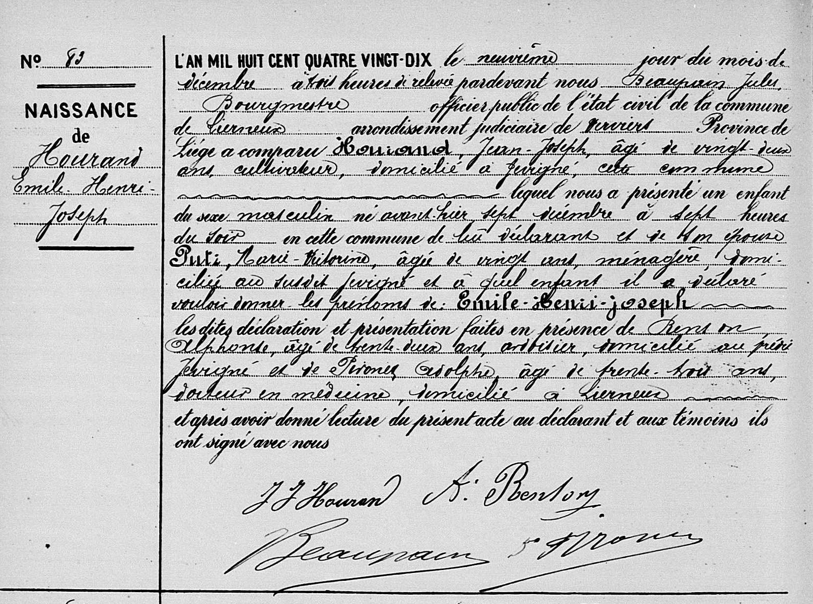 Acte de naissance à Lierneux, LG, BE (Source [358])