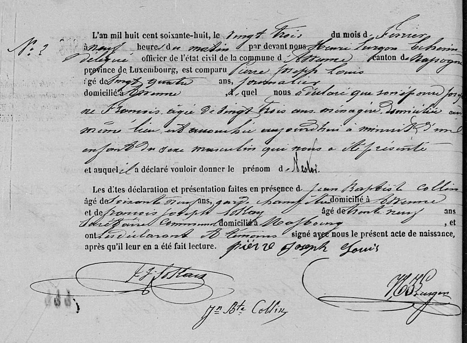 Acte de naissance à Awenne, LU, BE (Source [358])