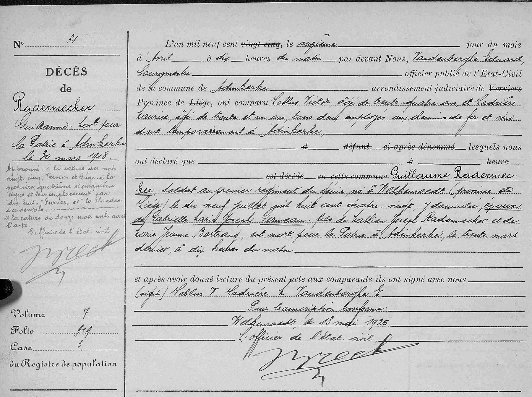 Première transcription de l'acte de décès dans les registres de