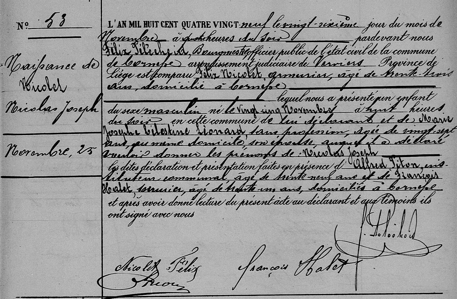 Cornesse, LG, BE: Acte de naissance n° 53 de 1889 (Source [358])