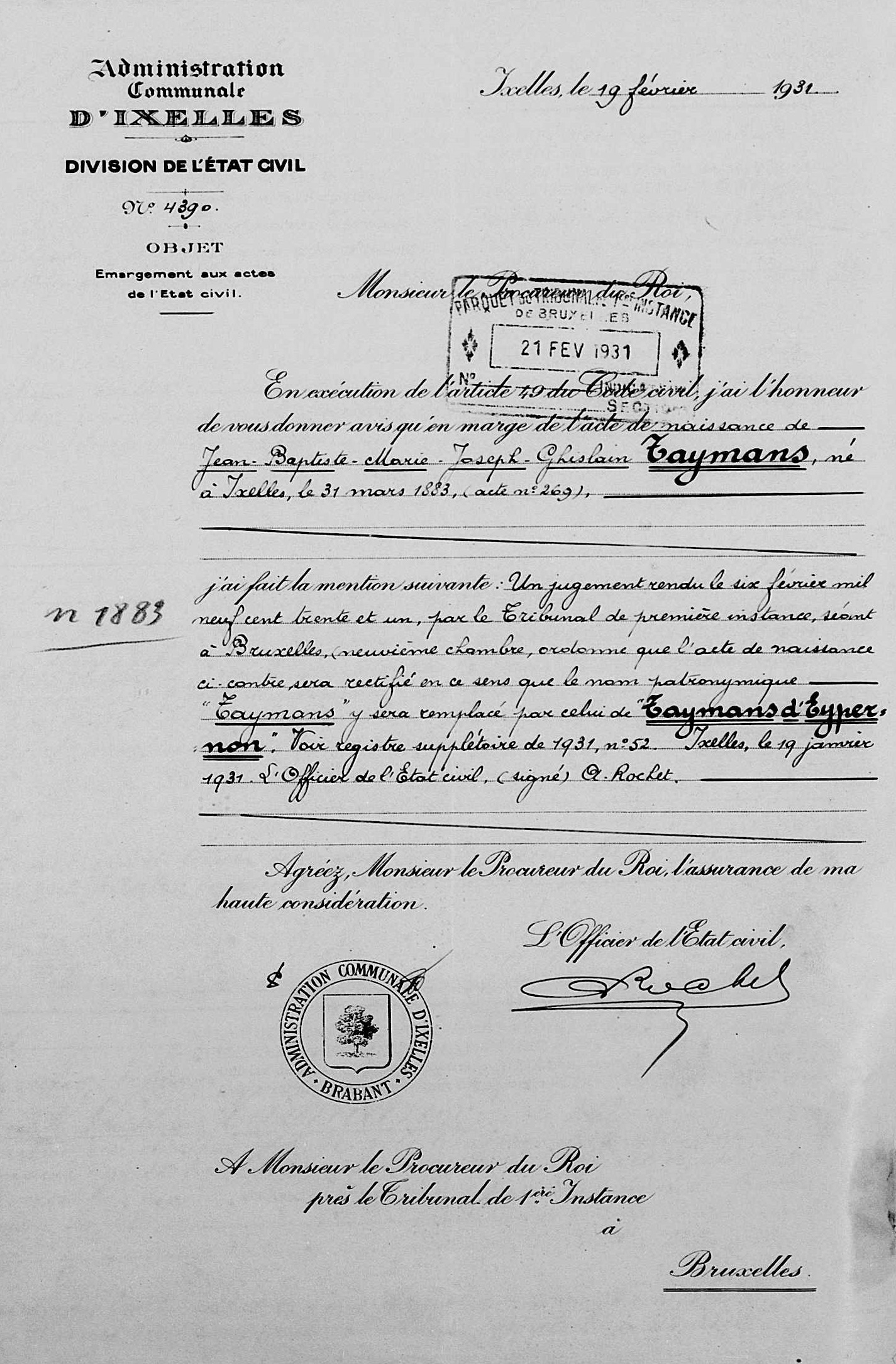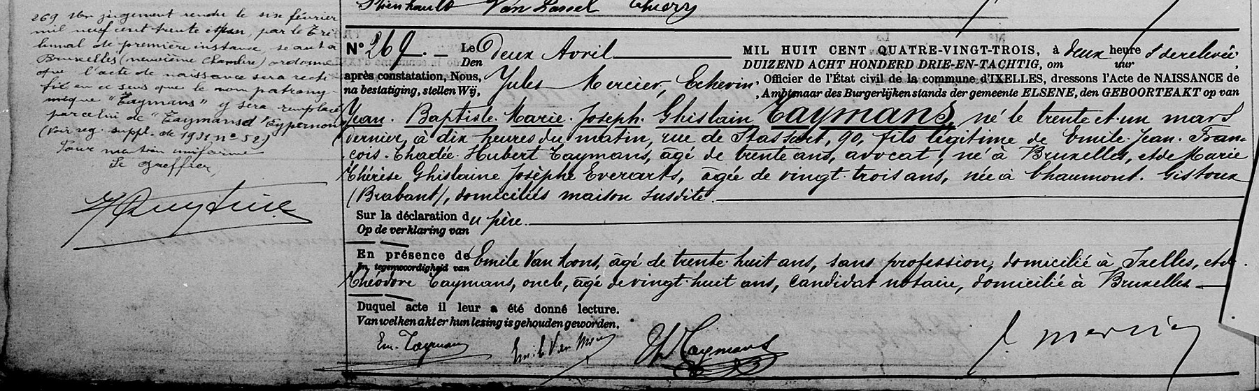 Acte de naissance à Ixelles - Elsene, BR, BE (Source [358])
