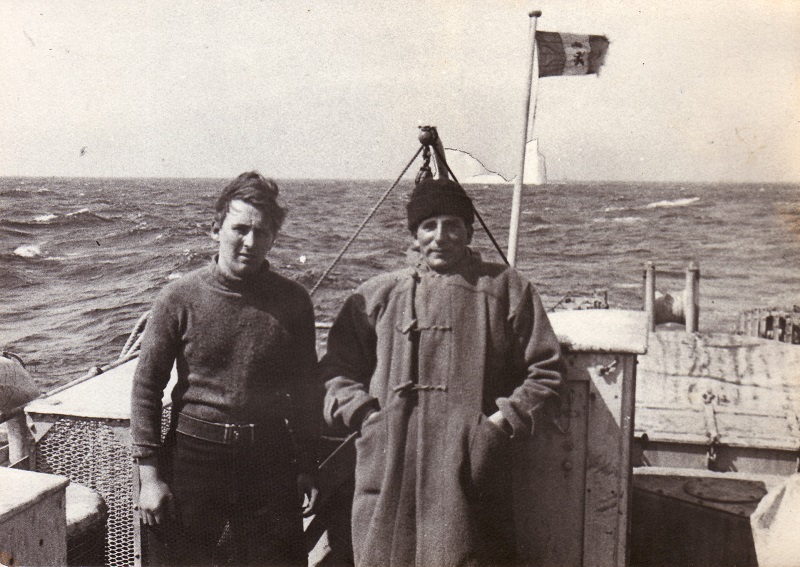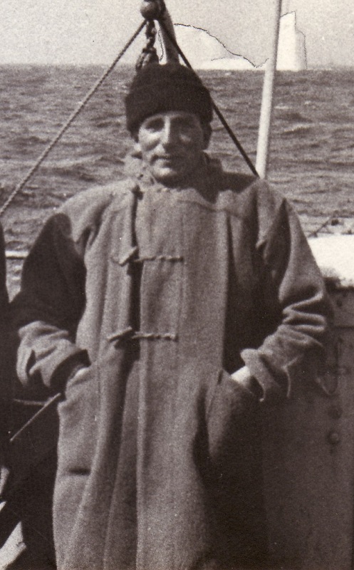 Bootsman JONSEN in duffelcoat op het achterdek ven de korvet "Buttercup"