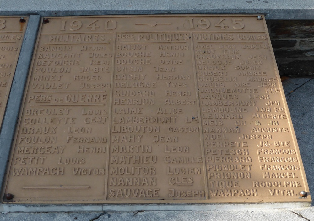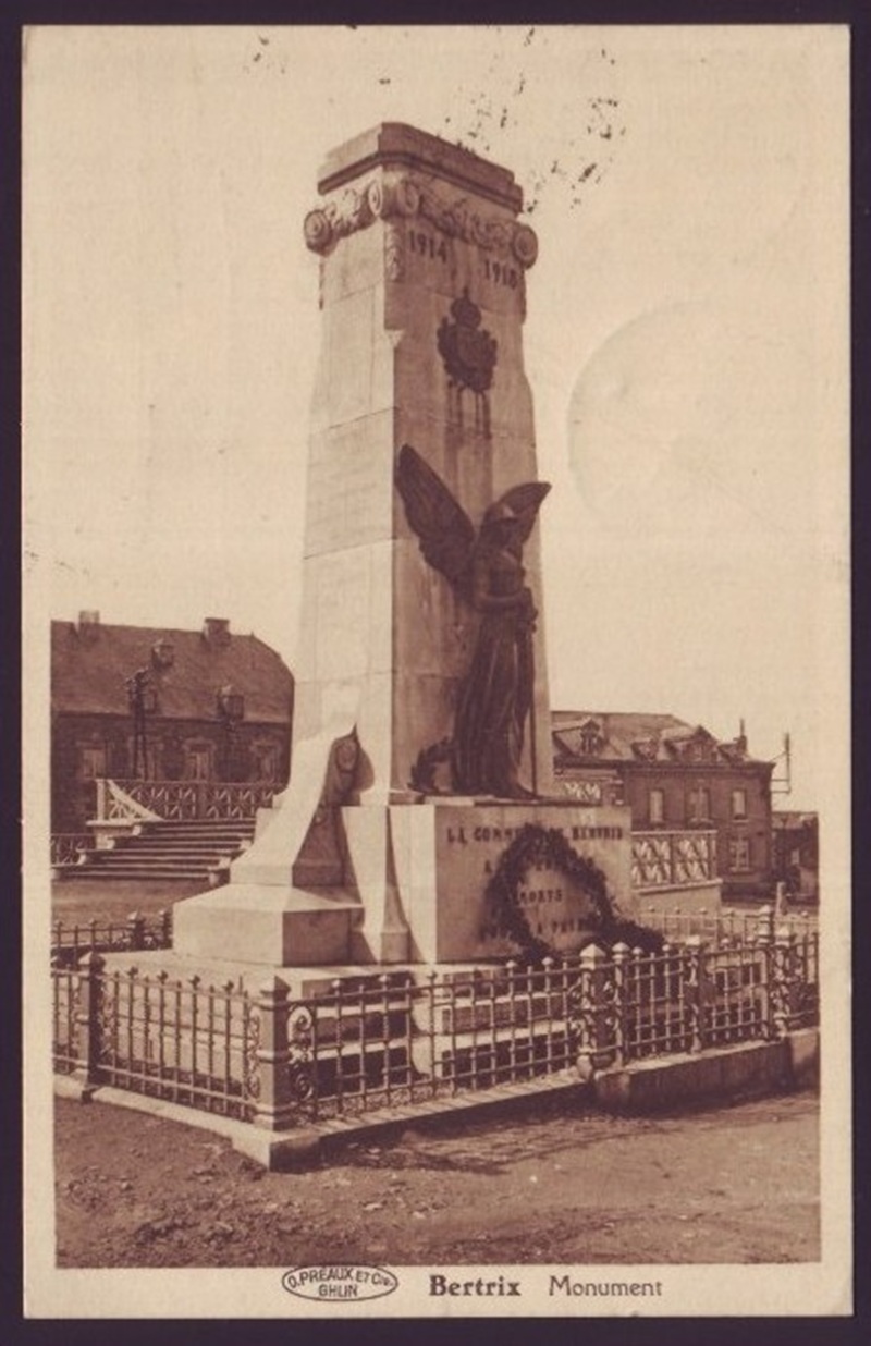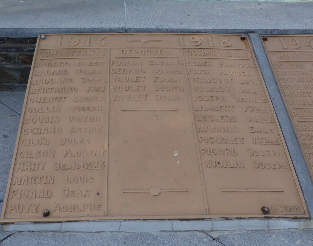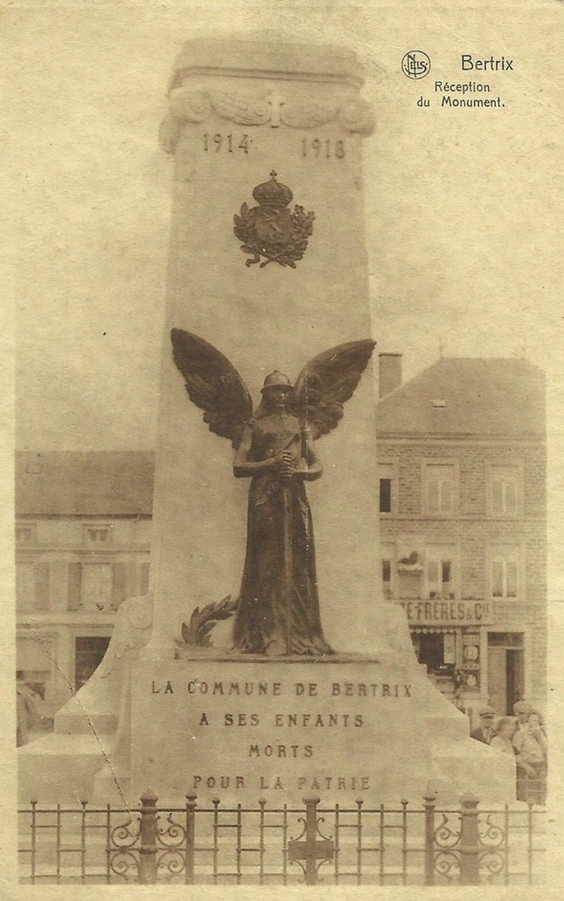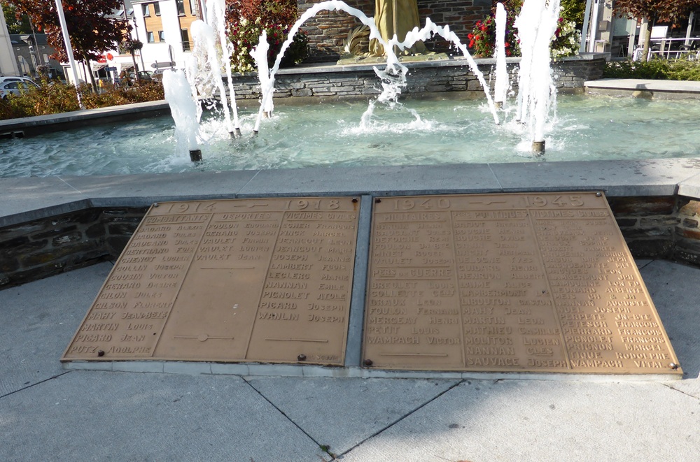 Localisation: Place des 3 Fers, le long de la N853. Coordonnées GPS: +49°51'18.1", +5°15'09.1" Inscriptions Sur la partie gauche de la plaque, au pied du bassin de la fontaine "1914 - 1918 [Sur trois colonnes] COMBATTANTS [Quatorze noms, classés par ordre alphabétique] DÉPORTÉS [Cinq noms, classés par ordre alphabétique] VICTIMES CIVILES [Onze noms, classés par ordre alphabétique]" Sur la partie droite de la plaque, au pied du bassin de la fontaine "1940 - 1945 [Sur trois colonnes] MILITAIRES [Six noms, classés par ordre alphabétique] PRISONNIERS DE GUERRE [Sept noms, classés par ordre alphabétique] PRISONNIERS POLITIQUES [Dix-sept noms, classés par ordre alphabétique] VICTIMES CIVILES [Vingt-quatre noms, classés par ordre alphabétique]" Informations complémentaires Bertrix possède un monument aux morts bien singulier. Il associe les reliquats d’un monument édifié en 1925 et les éléments d’une nouvelle installation datant de 2003. La statue en bronze vernissé de 2,50 m de hauteur, adossée à un muret récent, appartient au premier édifice, tout comme les écussons à l’arrière. La statue peu banale, représente une femme casquée (casque Adrian de 1915), ailée et armée d’une épée, évoquant la victoire. Les archives communales livrent le nom du statuaire, A. VANPETECHE, Victor TINANT étant l’architecte désigné par la commune et la députation permanente de l’entre-deux guerres, pour l’exécution des travaux (Source: Guide illustré 1914-1918) Plus d'informations concernant ces victimes |