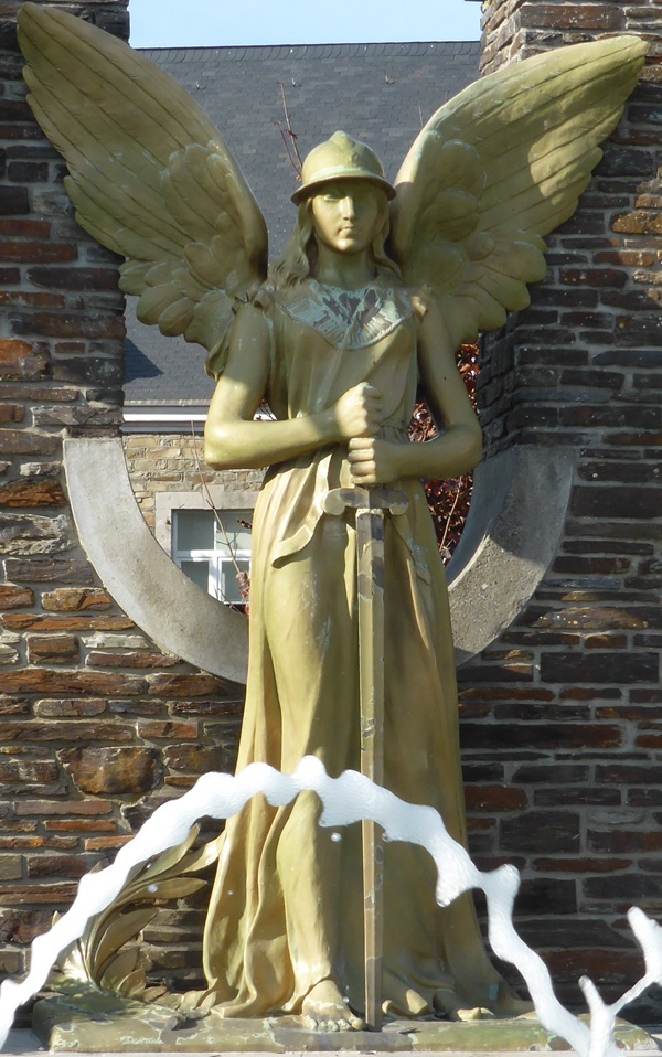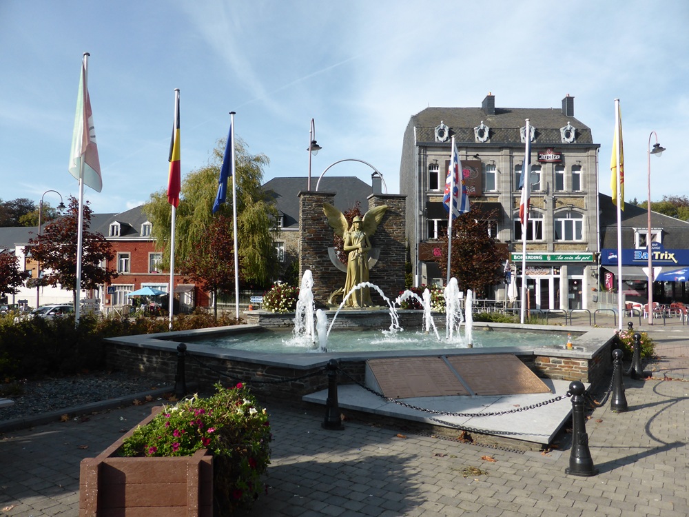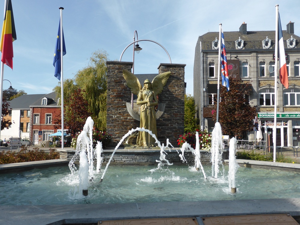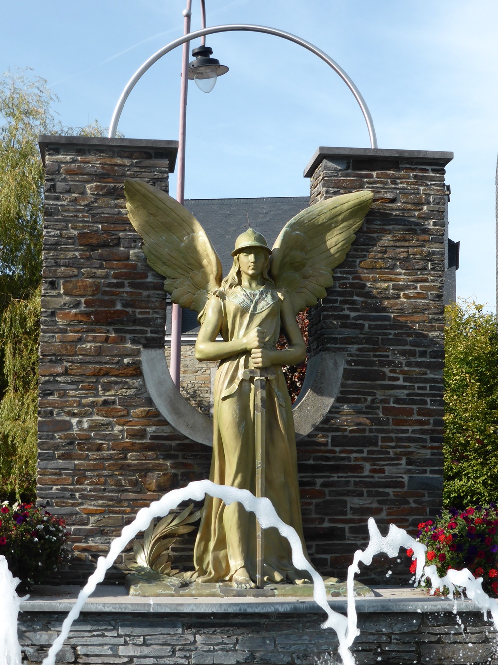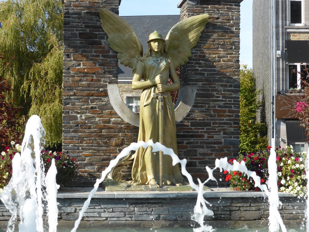 Localisation: Place des 3 Fers, le long de la N853. Coordonnées GPS: +49°51'18.1", +5°15'09.1" Inscriptions Sur la partie gauche de la plaque, au pied du bassin de la fontaine "1914 - 1918 [Sur trois colonnes] COMBATTANTS [Quatorze noms, classés par ordre alphabétique] DÉPORTÉS [Cinq noms, classés par ordre alphabétique] VICTIMES CIVILES [Onze noms, classés par ordre alphabétique]" Sur la partie droite de la plaque, au pied du bassin de la fontaine "1940 - 1945 [Sur trois colonnes] MILITAIRES [Six noms, classés par ordre alphabétique] PRISONNIERS DE GUERRE [Sept noms, classés par ordre alphabétique] PRISONNIERS POLITIQUES [Dix-sept noms, classés par ordre alphabétique] VICTIMES CIVILES [Vingt-quatre noms, classés par ordre alphabétique]" Informations complémentaires Bertrix possède un monument aux morts bien singulier. Il associe les reliquats d’un monument édifié en 1925 et les éléments d’une nouvelle installation datant de 2003. La statue en bronze vernissé de 2,50 m de hauteur, adossée à un muret récent, appartient au premier édifice, tout comme les écussons à l’arrière. La statue peu banale, représente une femme casquée (casque Adrian de 1915), ailée et armée d’une épée, évoquant la victoire. Les archives communales livrent le nom du statuaire, A. VANPETECHE, Victor TINANT étant l’architecte désigné par la commune et la députation permanente de l’entre-deux guerres, pour l’exécution des travaux (Source: Guide illustré 1914-1918) Plus d'informations concernant ces victimes |