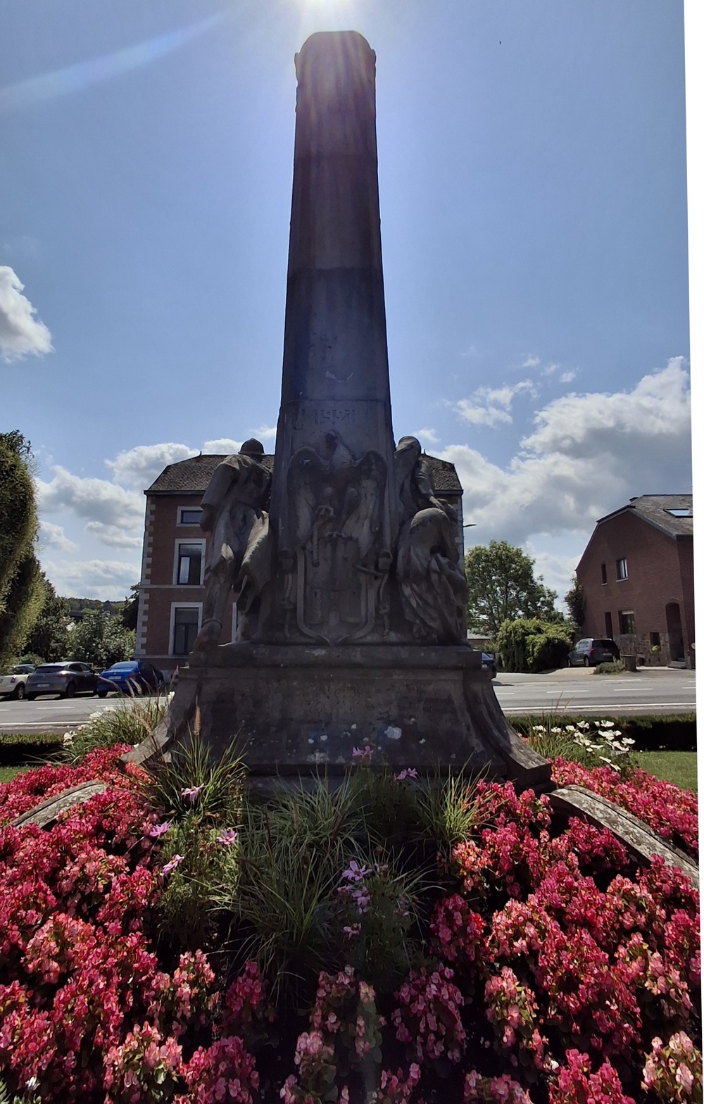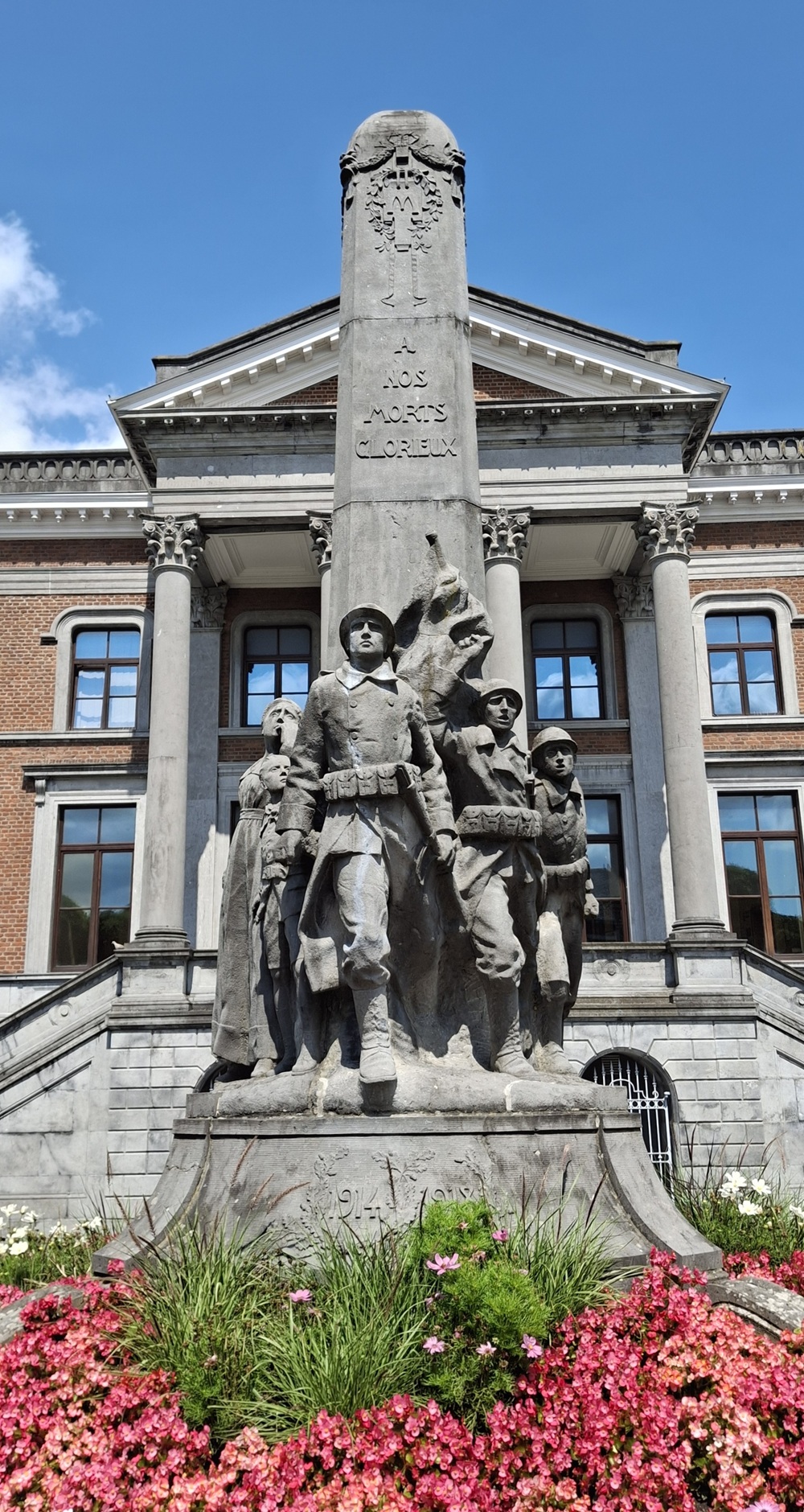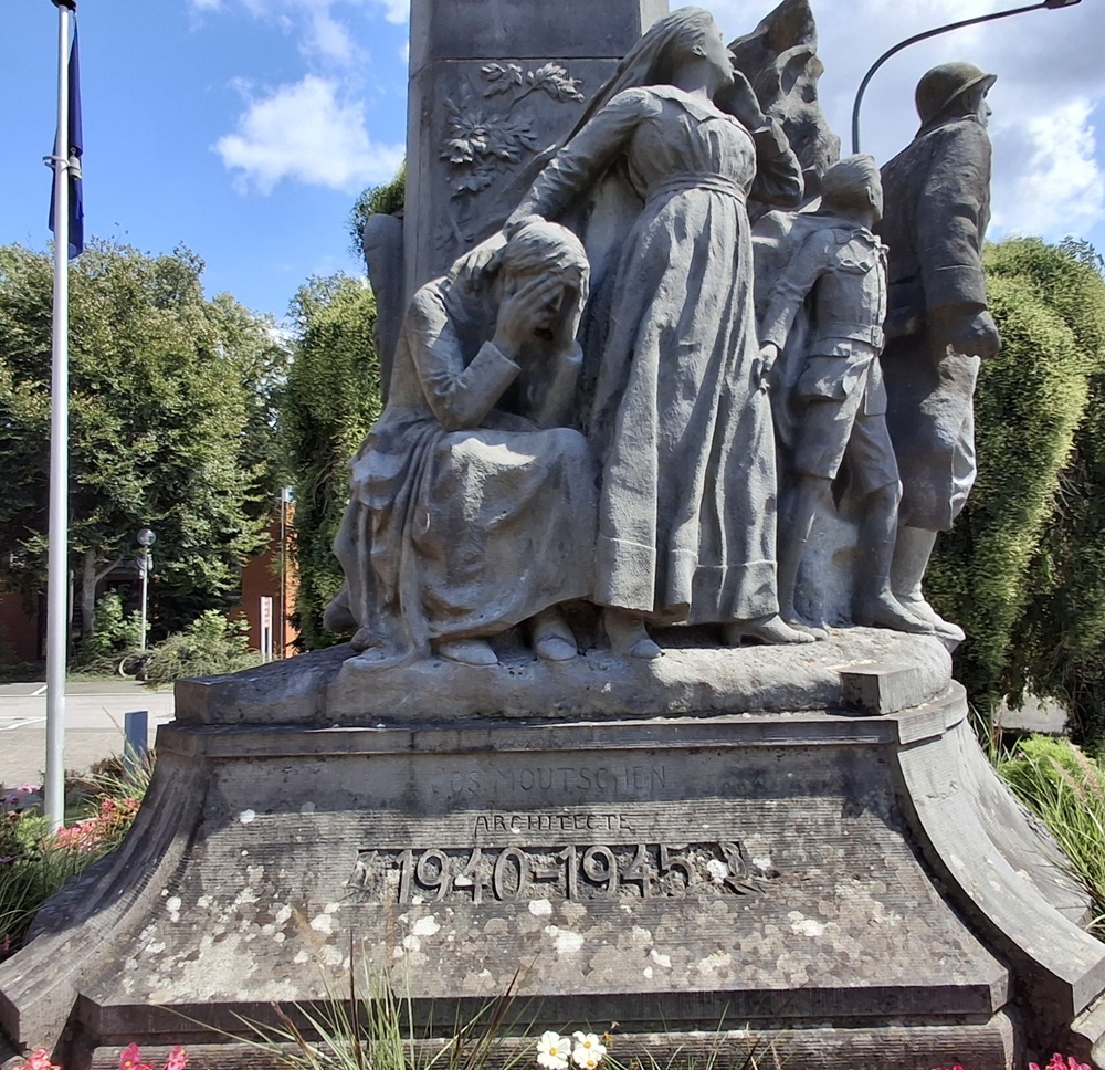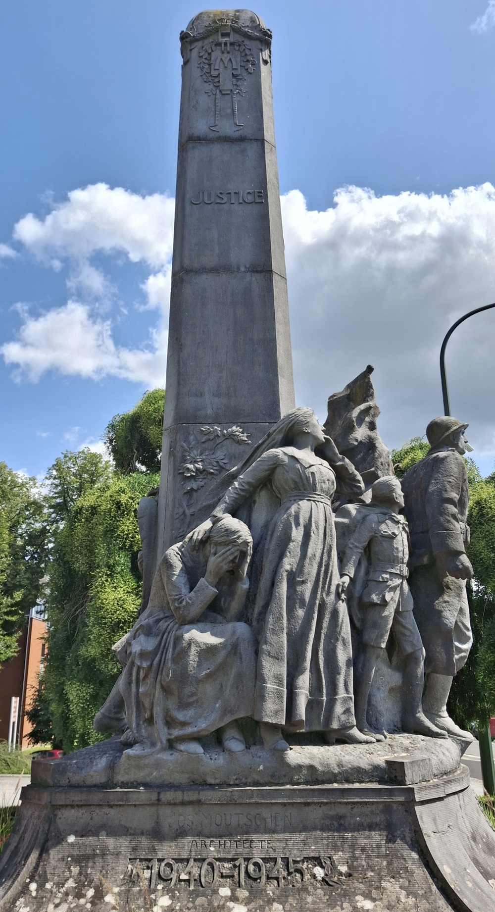 Localisation: Rue Victor Libert, devant le tribunal de Première Instance. Coordonnées GPS: +50°13'41.5", +5°20'23.9" Inscriptions Sur la face avant "À NOS MORTS GLORIEUX 1914 - 1918" Sur la face gauche "JUSTICE 1940 - 1945" Sur la face arrière "1921" Sur la face droite "LIBERTÉ 1940 - 1945" Informations complémentaires La stèle centrale est entourée de figures humaines : au premier plan et à droite, quatre soldats; à gauche deux femmes – l'une en deuil, l'autre regardant vers l'extérieur – et un garçon donnant la main au premier soldat. Au sommet de la stèle, sur les quatre faces, figurent les armoiries de Marche-en-Famenne. Statuaire: Alexis FIVET (Né à Jupille en 1882 et décédé à Liège en 1954) Architecte: Jos MOUTSCHEN Sculpteur: Firmin CLOSE Ce monument ne comporte pas de noms de victimes de guerre |