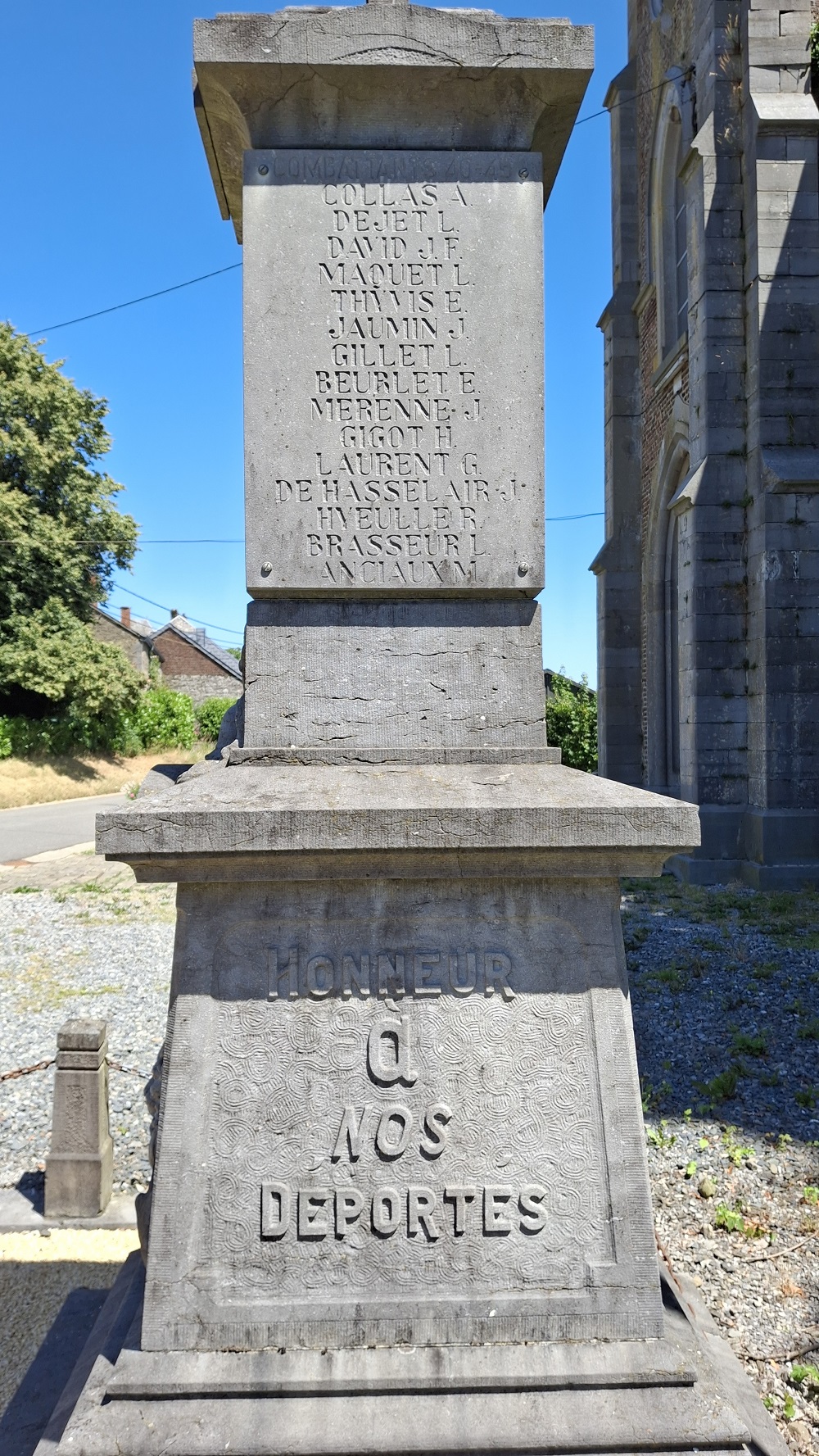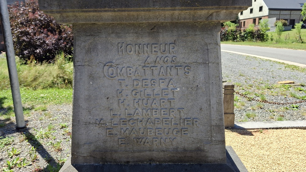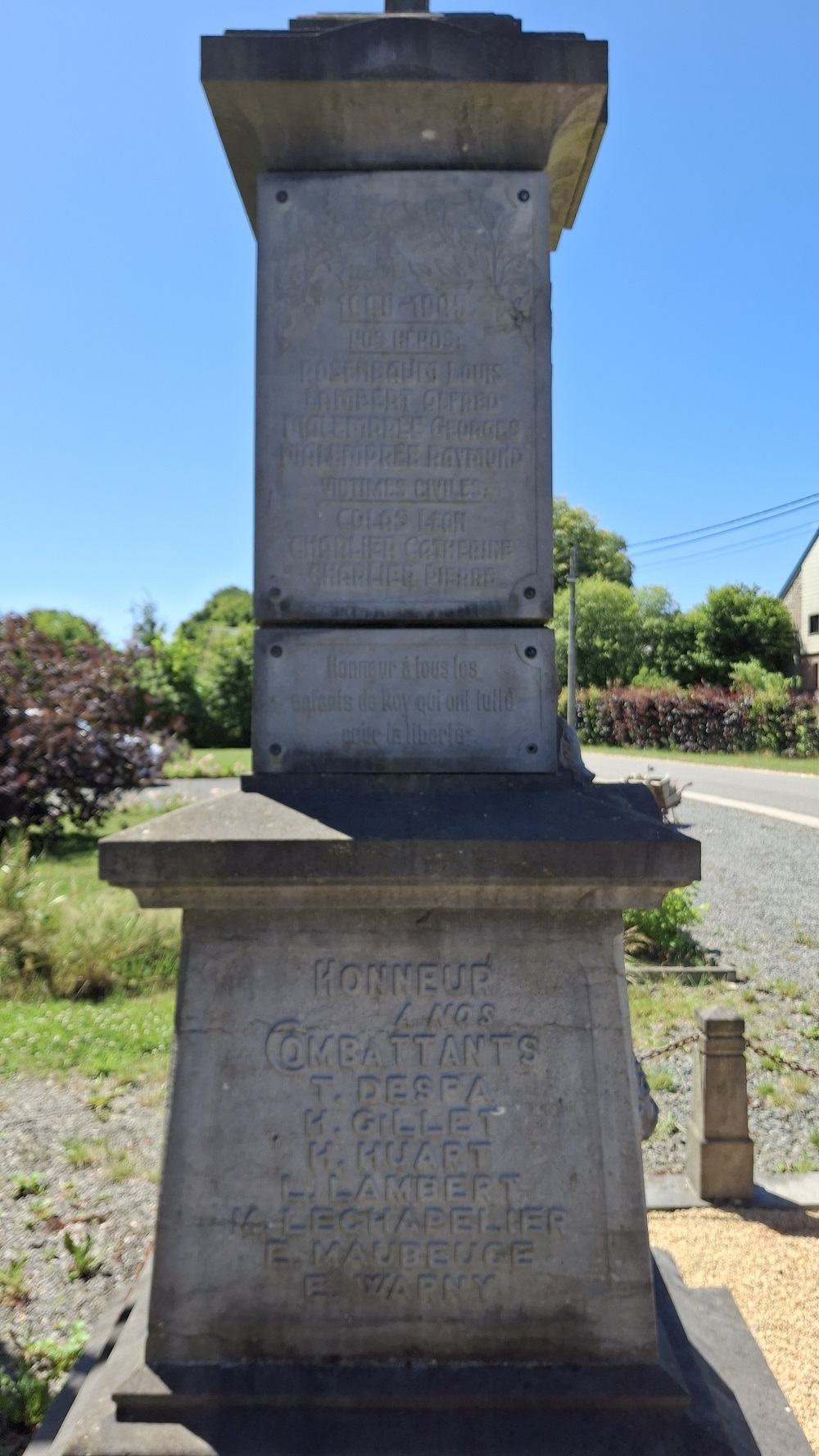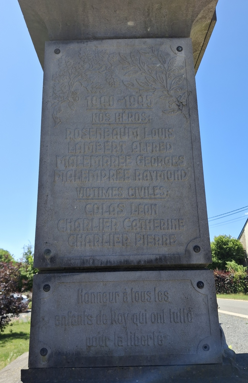 Localisation: Rue de Grusone, à côté de l'église Sainte-Barbe. Coordonnées GPS: +50°11'16.7", +5°24'33.7" Inscriptions Sur la face avant "1914-1918 À NOS HÉROS [Quatre noms avec lieu et date de décès, non classés par ordre alphabétique] ROY RECONNAISSANT" Sur le haut de la face de gauche "1940-1945 NOS HÉROS [Quatre noms, non classés par ordre alphabétique]" Sur le bas de la face de gauche "HONNEUR À NOS COMBATTANTS [Sept noms, classés par ordre alphabétique] VICTIMES CIVILES [Trois noms, classés par ordre alphabétique] HONNEUR À TOUS LES ENFANTS DE ROY QUI ONT LUTTÉ POUR LA LIBERTÉ" Sur le haut de la face de droite "COMBATTANTS 40-45 [Quinze noms, non classés par ordre alphabétique]" Sur le bas de la face de droite "HONNEUR À NOS DÉPORTÉS" Plus d'informations concernant les personnes reprises sur le monument |