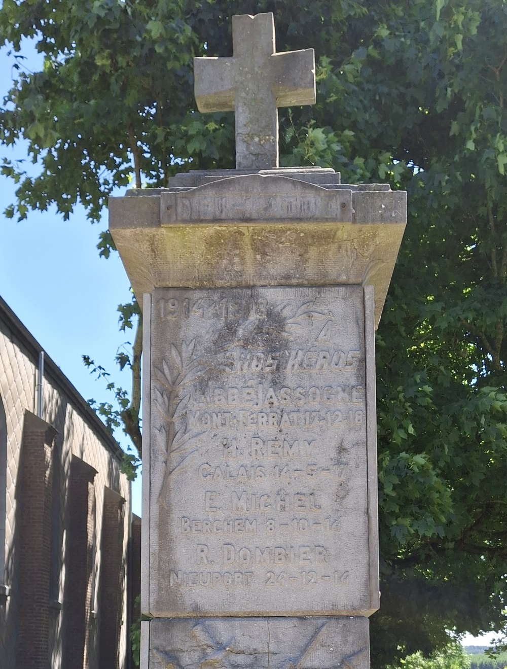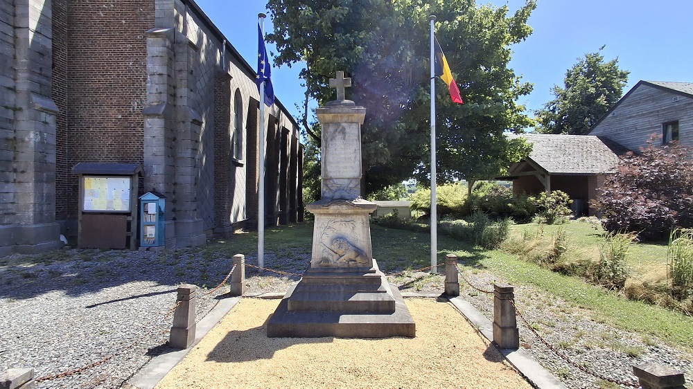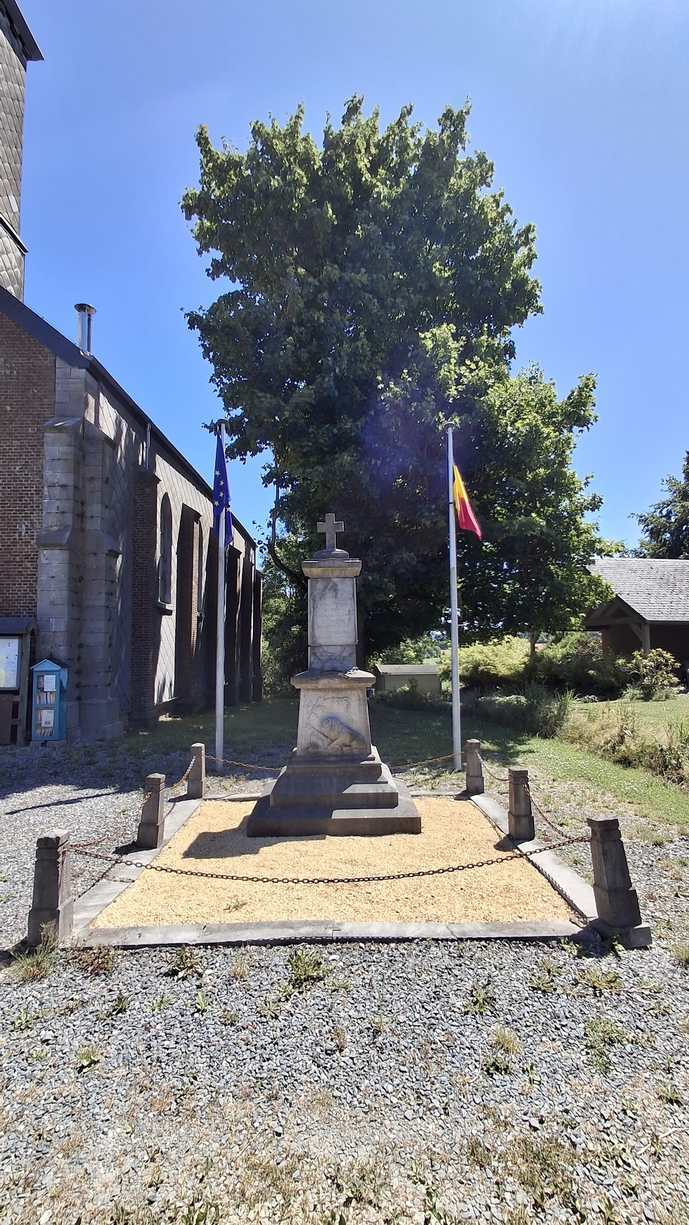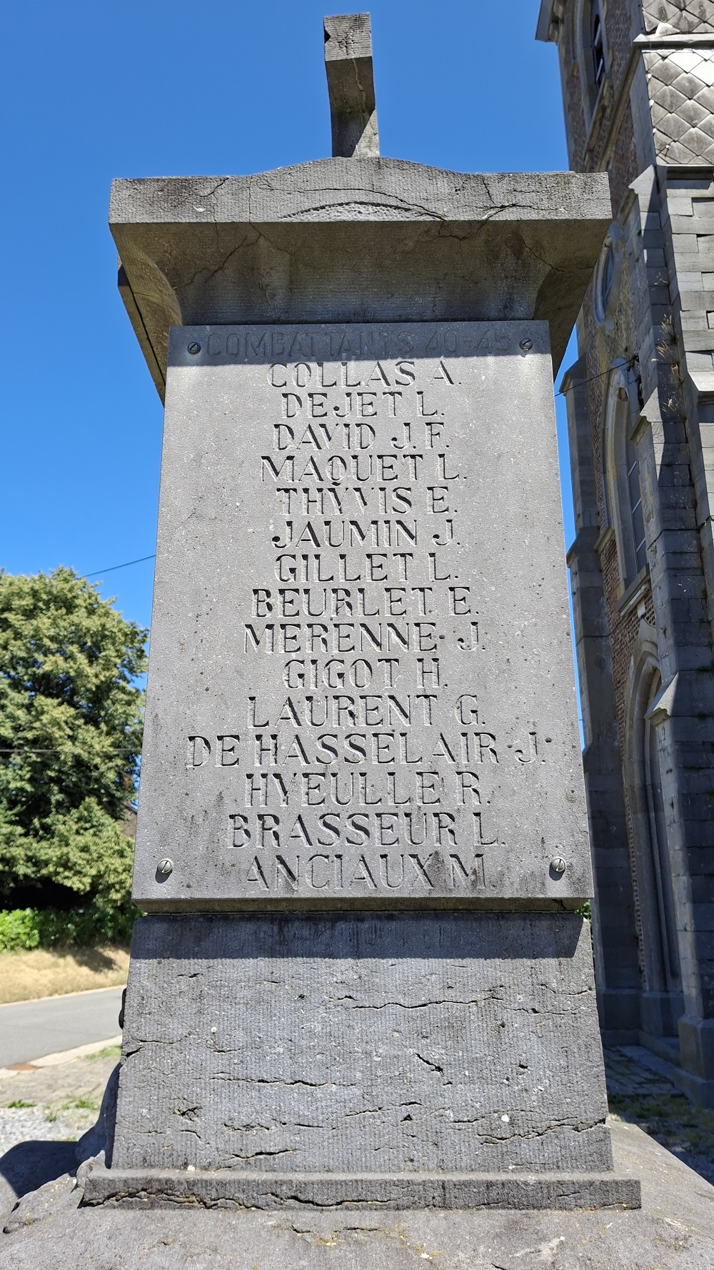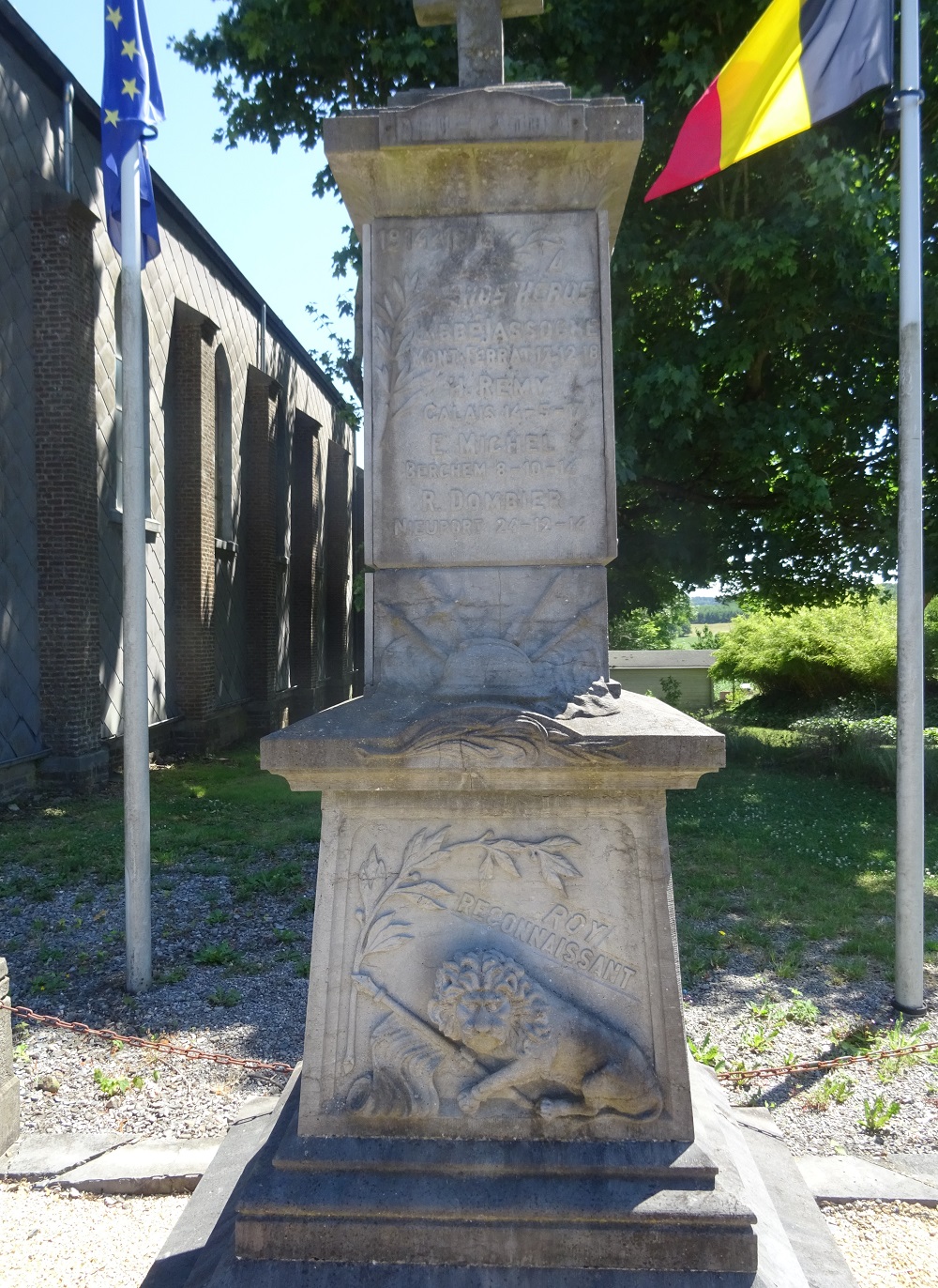 Localisation: Rue de Grusone, à côté de l'église Sainte-Barbe. Coordonnées GPS: +50°11'16.7", +5°24'33.7" Inscriptions Sur la face avant "1914-1918 À NOS HÉROS [Quatre noms avec lieu et date de décès, non classés par ordre alphabétique] ROY RECONNAISSANT" Sur le haut de la face de gauche "1940-1945 NOS HÉROS [Quatre noms, non classés par ordre alphabétique]" Sur le bas de la face de gauche "HONNEUR À NOS COMBATTANTS [Sept noms, classés par ordre alphabétique] VICTIMES CIVILES [Trois noms, classés par ordre alphabétique] HONNEUR À TOUS LES ENFANTS DE ROY QUI ONT LUTTÉ POUR LA LIBERTÉ" Sur le haut de la face de droite "COMBATTANTS 40-45 [Quinze noms, non classés par ordre alphabétique]" Sur le bas de la face de droite "HONNEUR À NOS DÉPORTÉS" Plus d'informations concernant les personnes reprises sur le monument |