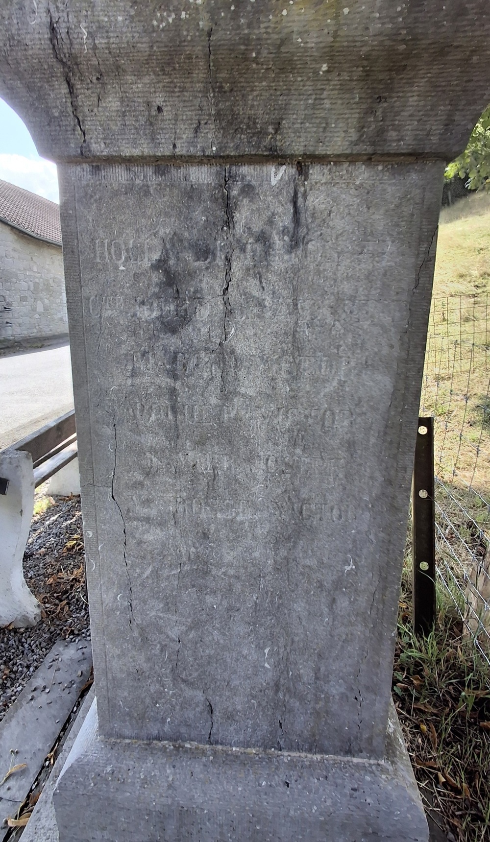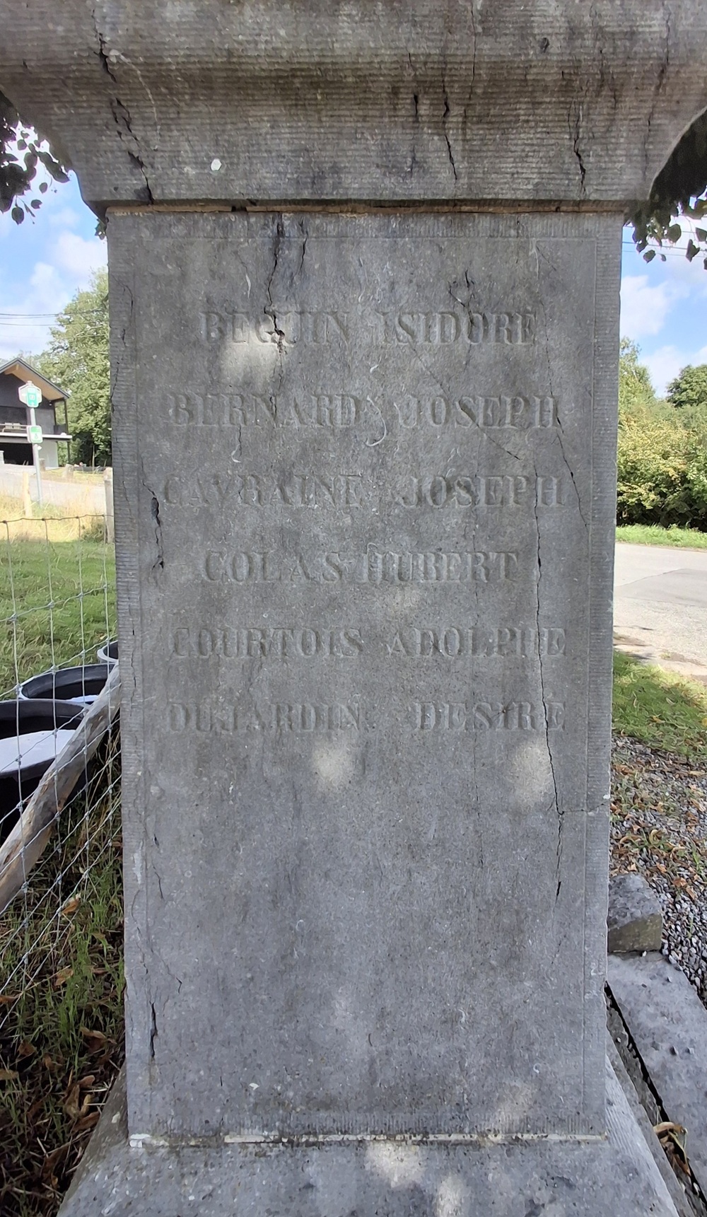 Localisation: À l'angle de la Rue des Longs Bâtis et du Champ des Hêtres. Coordonnées GPS: +50°21'17.6", +5°25'18.1" Inscriptions Sur la face avant "À NOS HÉROS [Quatre noms, avec lieu et date de décès, classés par ordre alphabétique]" Sur la face de gauche "[Six noms, classés par ordre alphabétique]" Sur la face de droite "[Six noms, classés par ordre alphabétique]" Informations complémentaires Malheureusement, avec le temps et le non entretien du monument, certains noms et certaines informations sont devenues (quasi) illisibles. Plus d'informations concernant ces victimes |