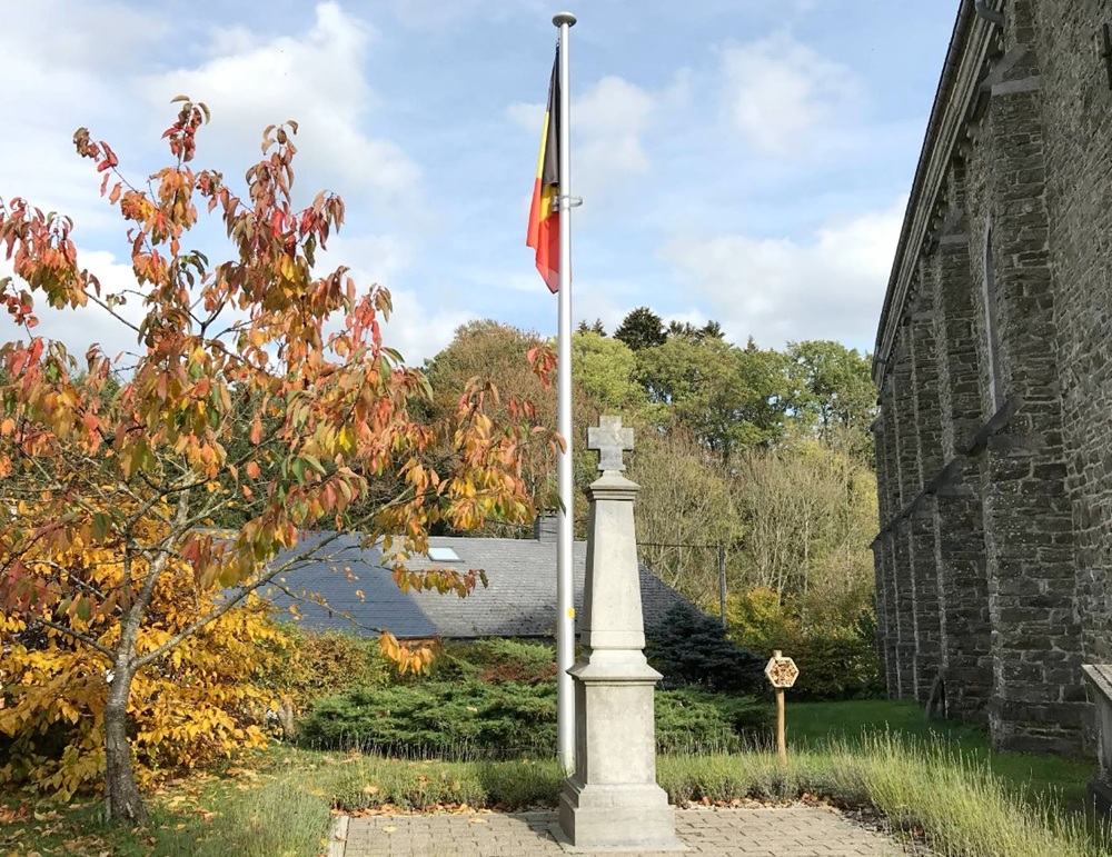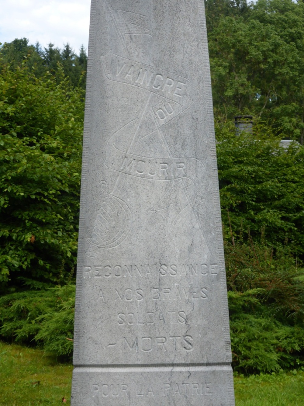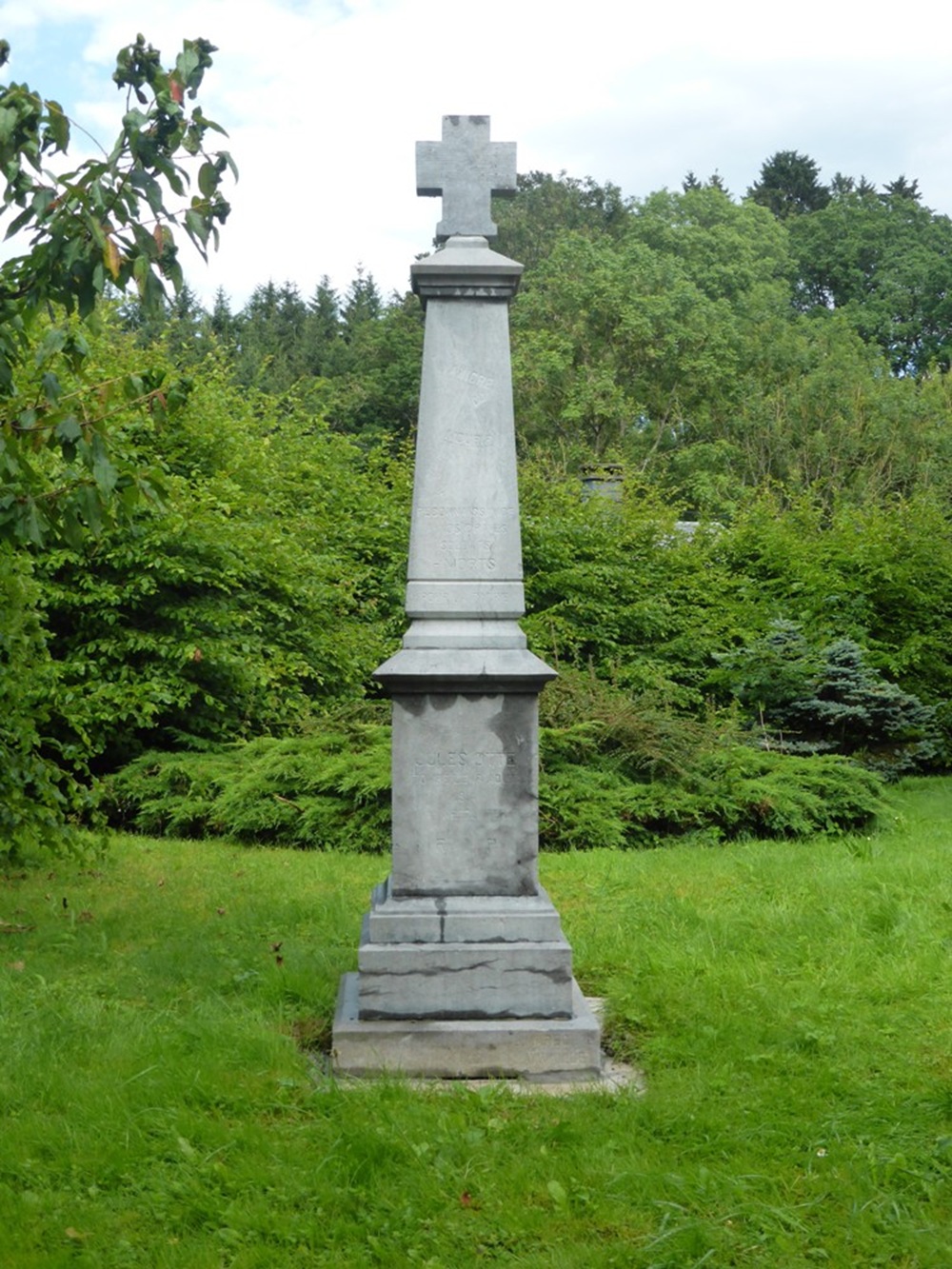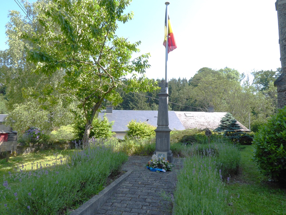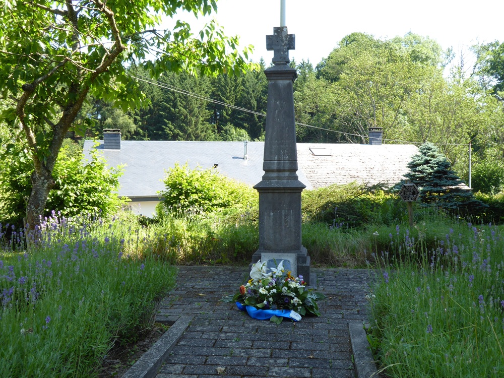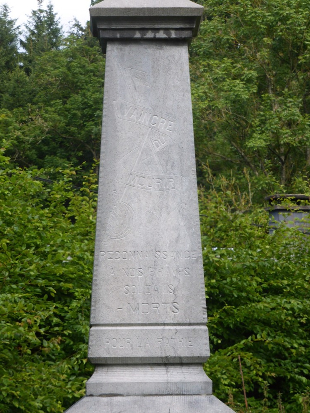 Localisation: Rue du Tilleul, sur la pelouse bordant l'église Saint-Lambert et Saint-Pierre Coordonnées GPS: +50°09'58.7", +5°43'07.4" Inscriptions Sur la partie supérieure de la face avant [Sous une croix, un dessin représente un drapeau, une épée et une bannière avec l'inscription :] "VAINCRE OU MOURIR RECONNAISSANCE À NOS BRAVES SOLDATS MORTS POUR LA PATRIE" Sur la partie inférieure de la face avant "[Un nom avec date et lieu de décès] R.I.P." Sur une des faces latérales "[Un nom avec date et lieu de décès] R.I.P." Sur l'autre face latérale "[Un nom avec date et lieu de décès] R.I.P." Plus d'informations concernant ces victimes |