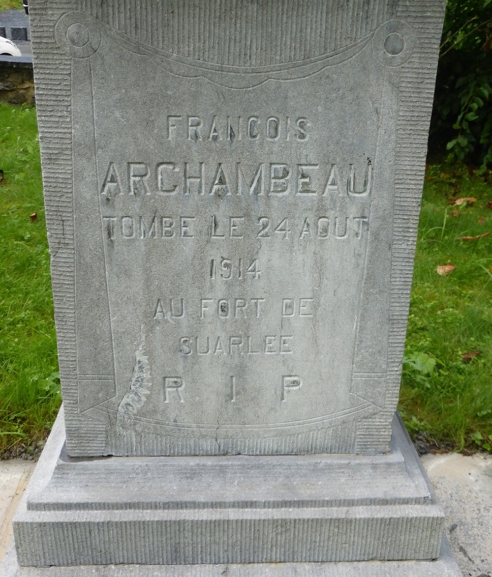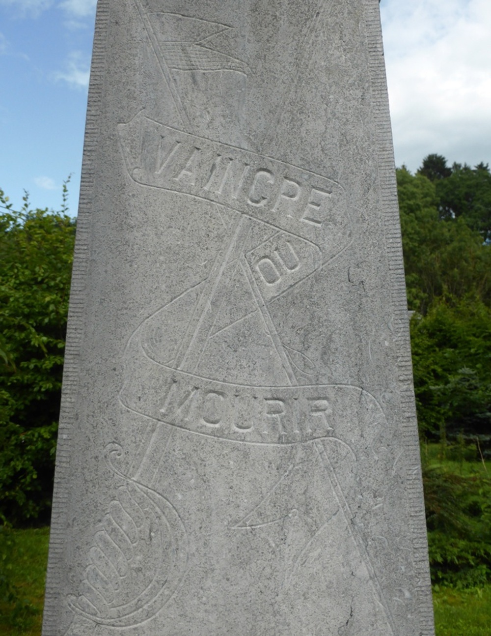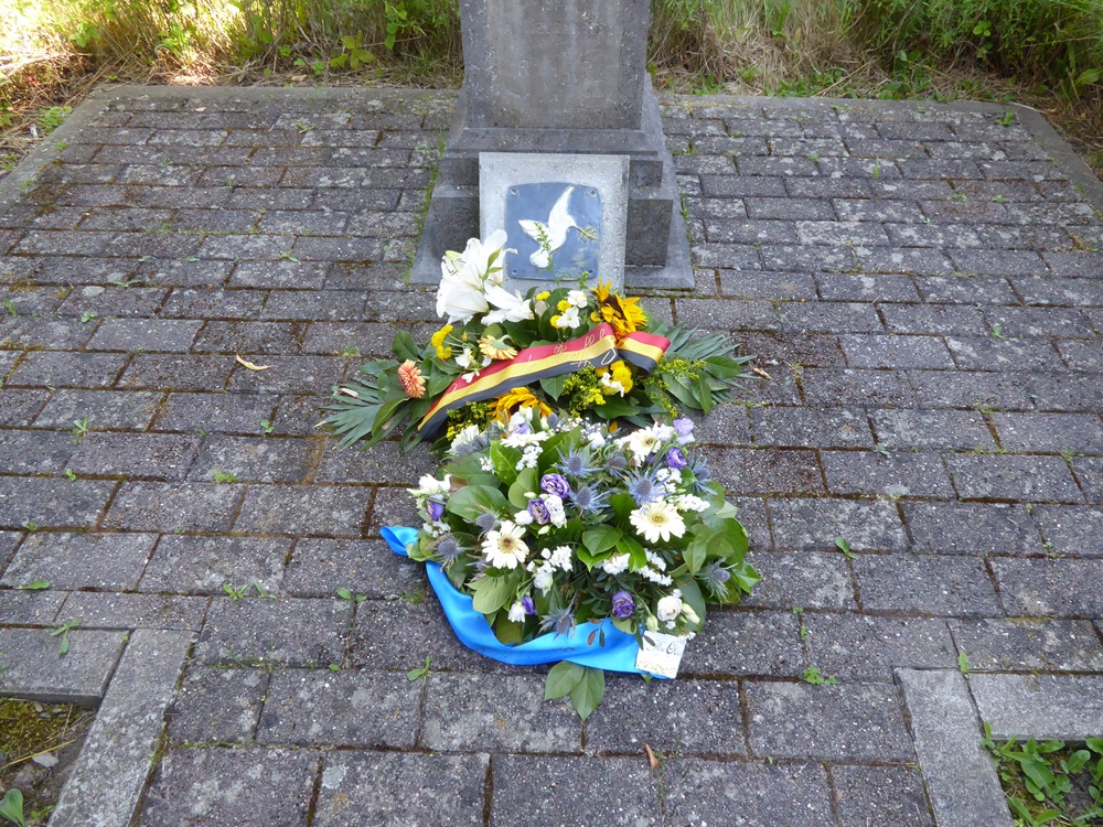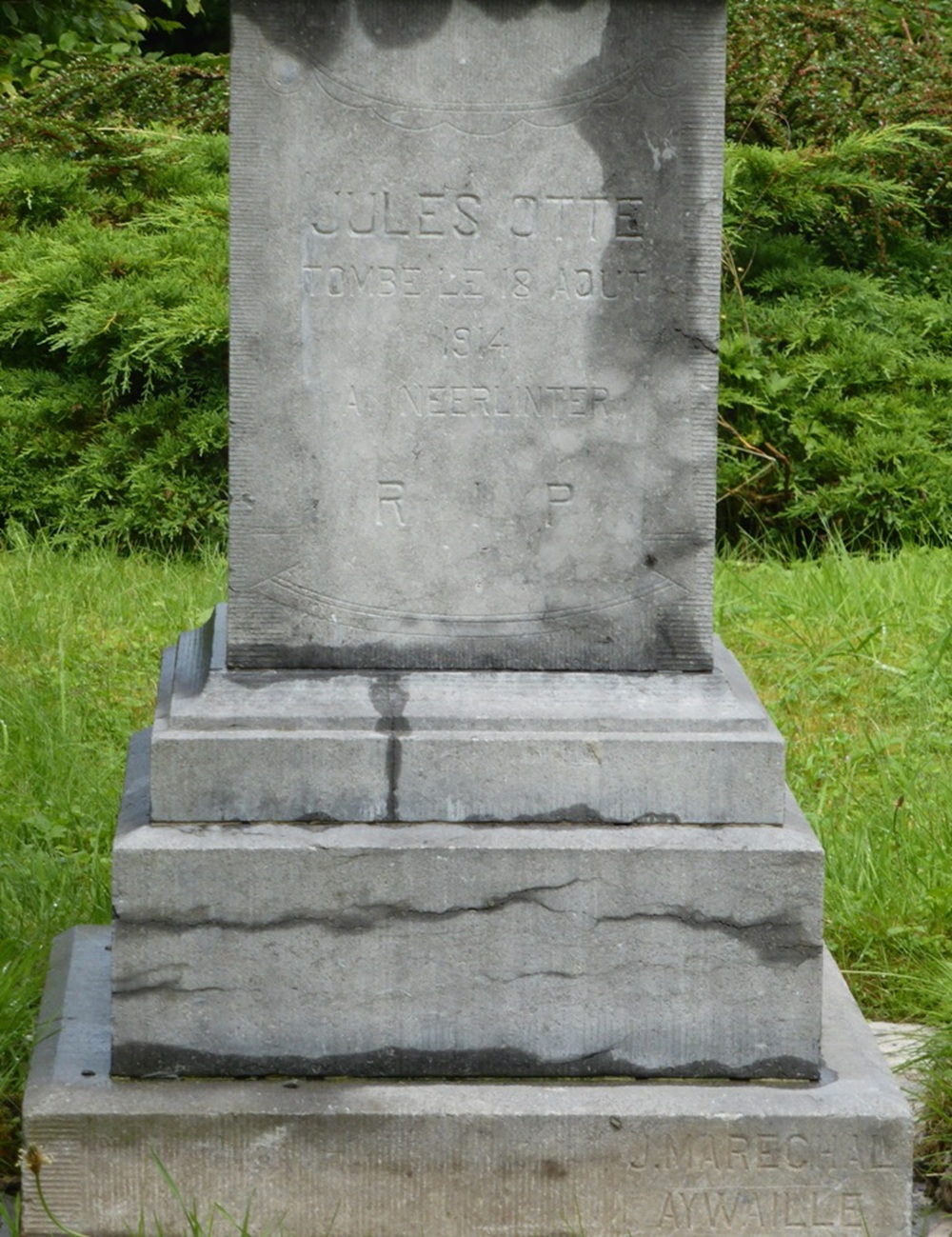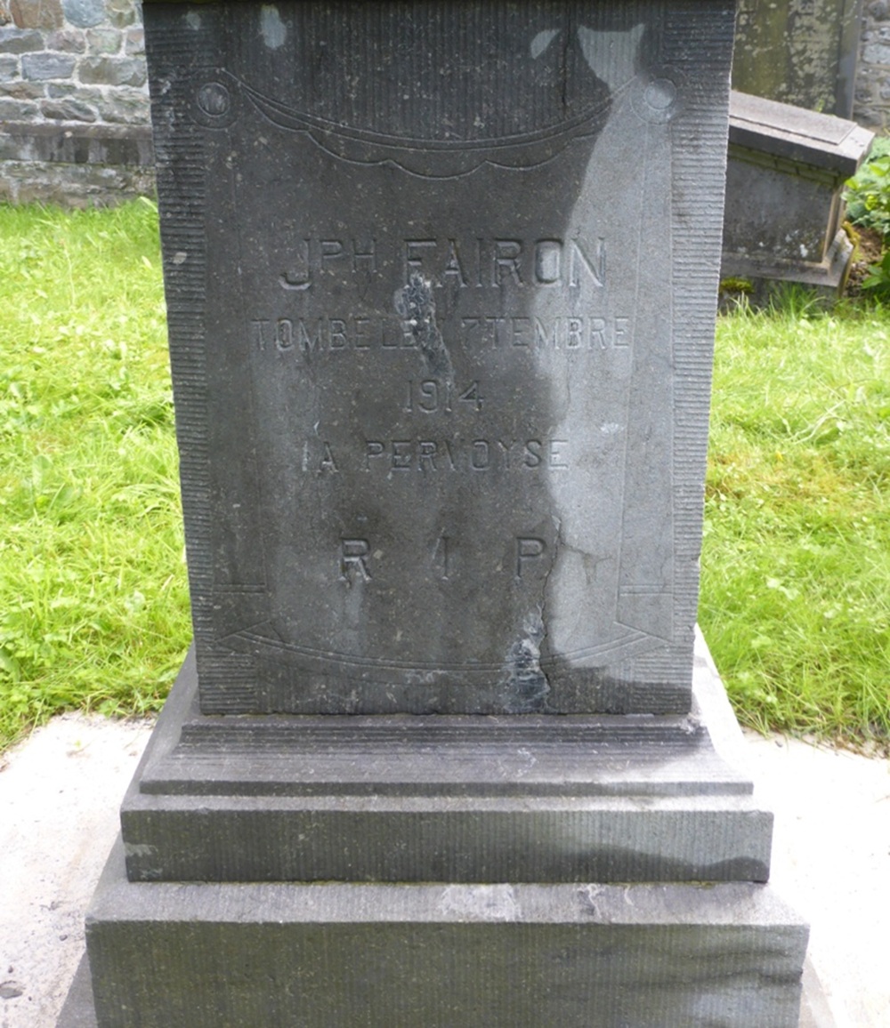 Localisation: Rue du Tilleul, sur la pelouse bordant l'église Saint-Lambert et Saint-Pierre Coordonnées GPS: +50°09'58.7", +5°43'07.4" Inscriptions Sur la partie supérieure de la face avant [Sous une croix, un dessin représente un drapeau, une épée et une bannière avec l'inscription :] "VAINCRE OU MOURIR RECONNAISSANCE À NOS BRAVES SOLDATS MORTS POUR LA PATRIE" Sur la partie inférieure de la face avant "[Un nom avec date et lieu de décès] R.I.P." Sur une des faces latérales "[Un nom avec date et lieu de décès] R.I.P." Sur l'autre face latérale "[Un nom avec date et lieu de décès] R.I.P." Plus d'informations concernant ces victimes |