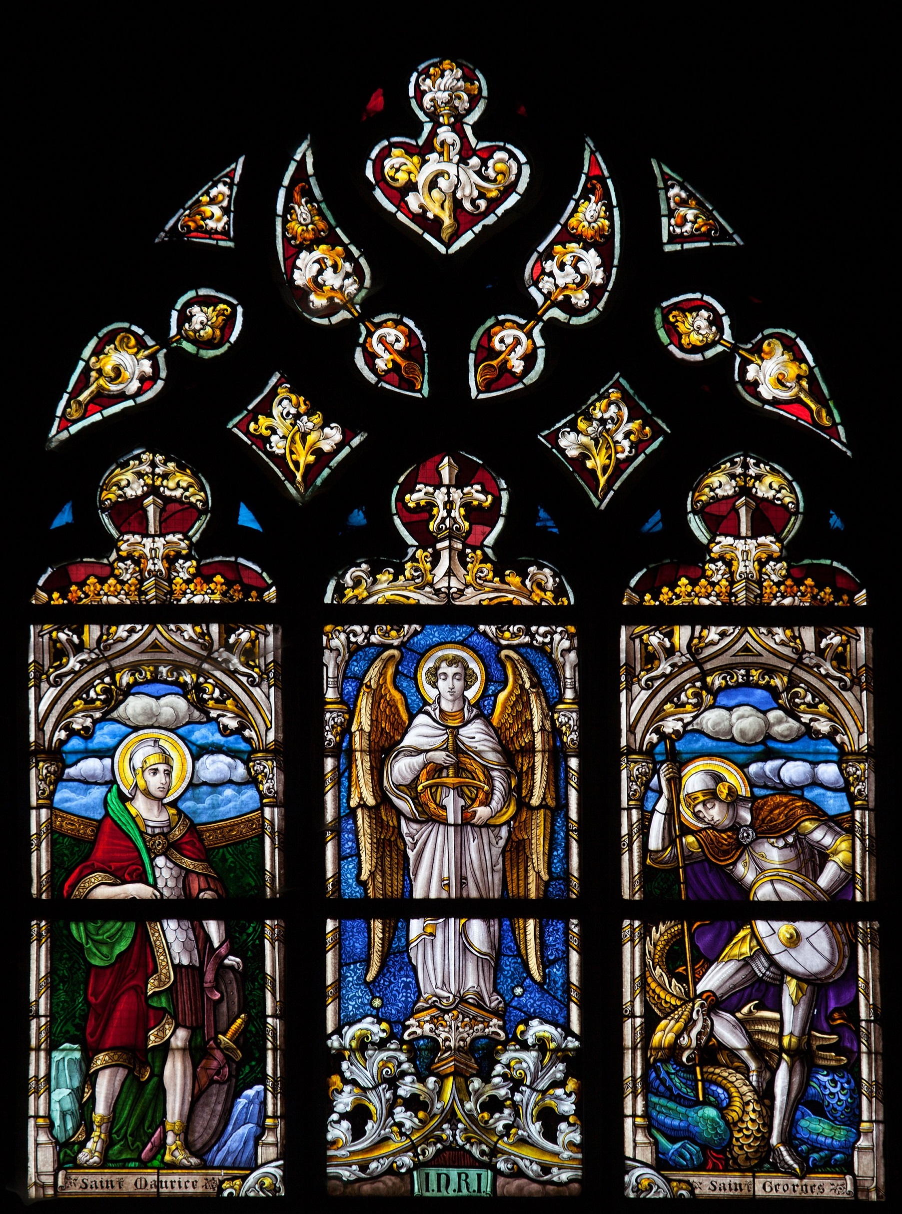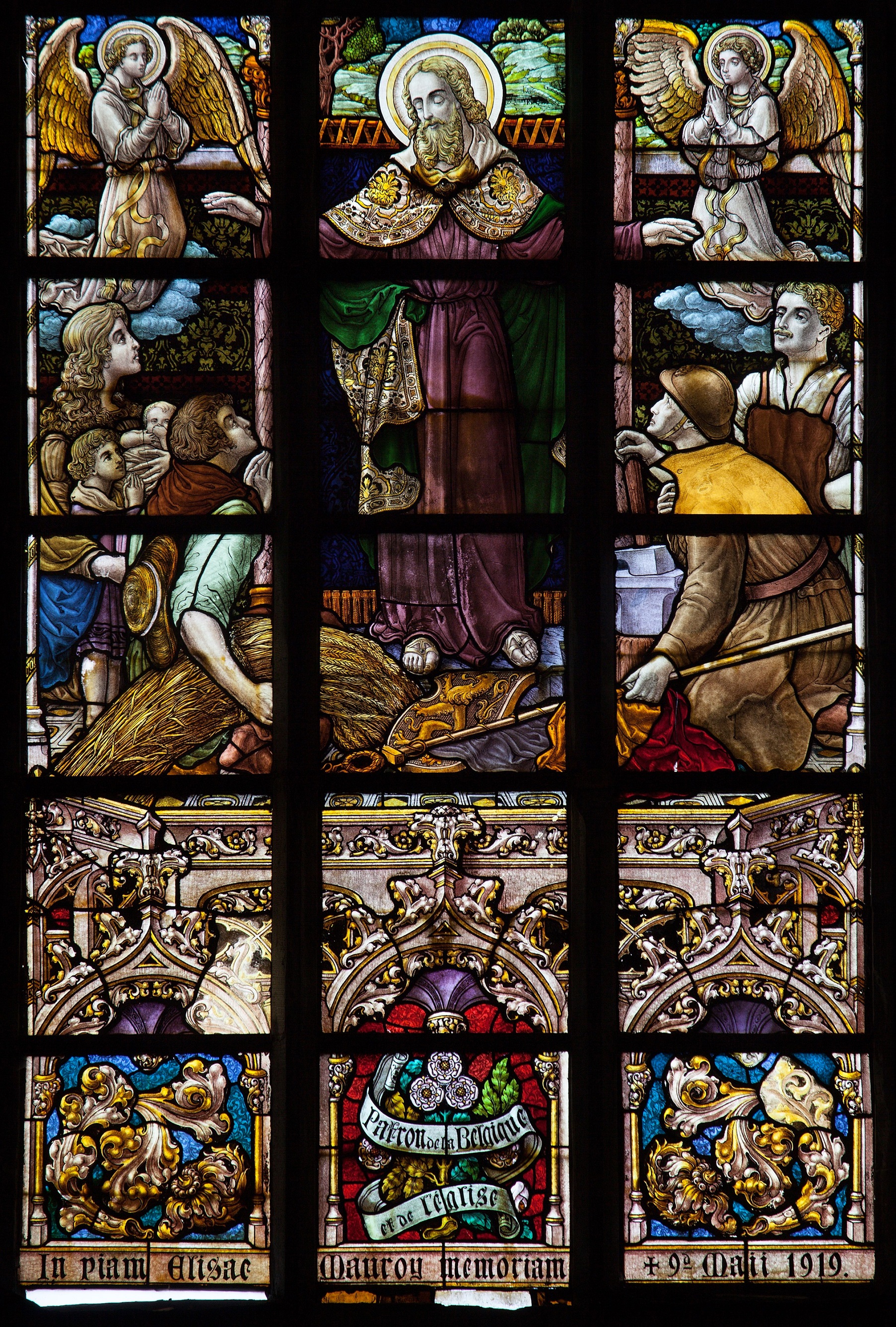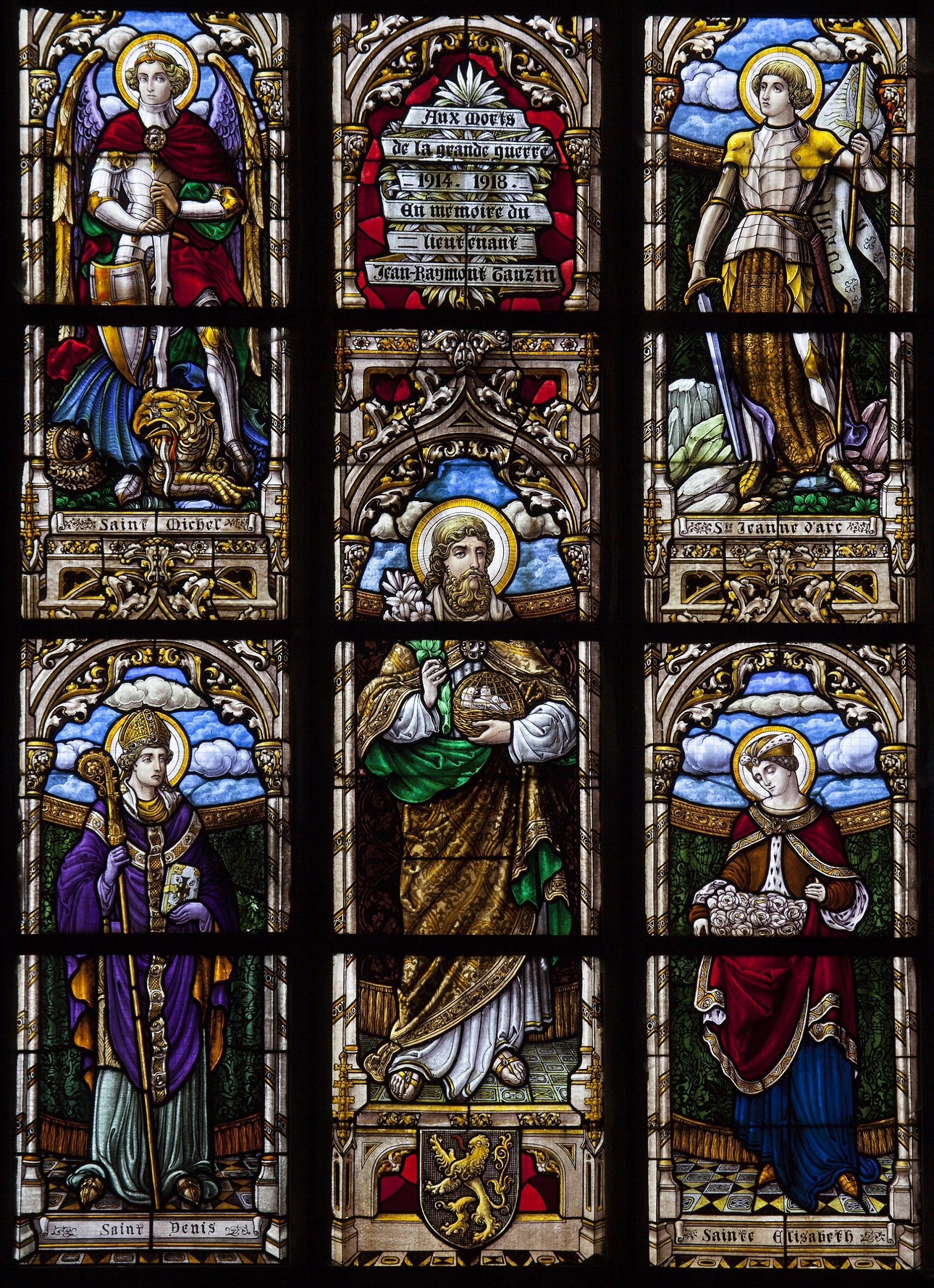 Localisation: Collégiale Saint-Ursmer (chapelle du côté sud et bras méridional du transept), à l'intersection de la rue Haute et de la rue Saint-Moustier. Coordonnées GPS: +50°24'32.8", +4°09'55.8" Inscriptions Vitrail 1 "SAINT MAURICE - I.N.R.I. - SAINT GEORGES AUX MORTS DE LA GRANDE GUERRE 1914 - 1918 EN MÉMOIRE DU LIEUTENANT JEAN-RAYMONT TAUZIN SAINT MICHEL - STE JEANNE D'ARC SAINT DENIS - SAINTE ELISABETH" Vitrail 2 "PATRONUS ECCLESIAE PATRON DE LA BELGIQUE ET DE L'ÉGLISE IN PIAM ELISAE MAUROY MEMORIAM + 9 MAII 1919." Description Vitrail 1 Calvaire et saints (Source [492). Vitrail 2 Au registre supérieur, saint Joseph (Patronus Ecclesiae) tient Jésus sur ses genoux, accompagné de saint Michel, du pape Pie IX (qui a proclamé saint Joseph patron de l'Église universelle en 1870) et d'un ange présentant une maquette de la basilique Saint-Pierre de Rome. Au registre inférieur, saint Joseph patron de la Belgique (Patron de la Belgique et de l'Église), avec une famille paysanne, un forgeron et un militaire tenant le drapeau belge (Source [492). Réalisation : Atelier GANTON-DEFOIN, vers 1920 (Source [492]). Dimensions : environ 5 mètres de hauteur (Source [492]). Plus d'informations concernant les personnes mentionnées sur ces vitraux |