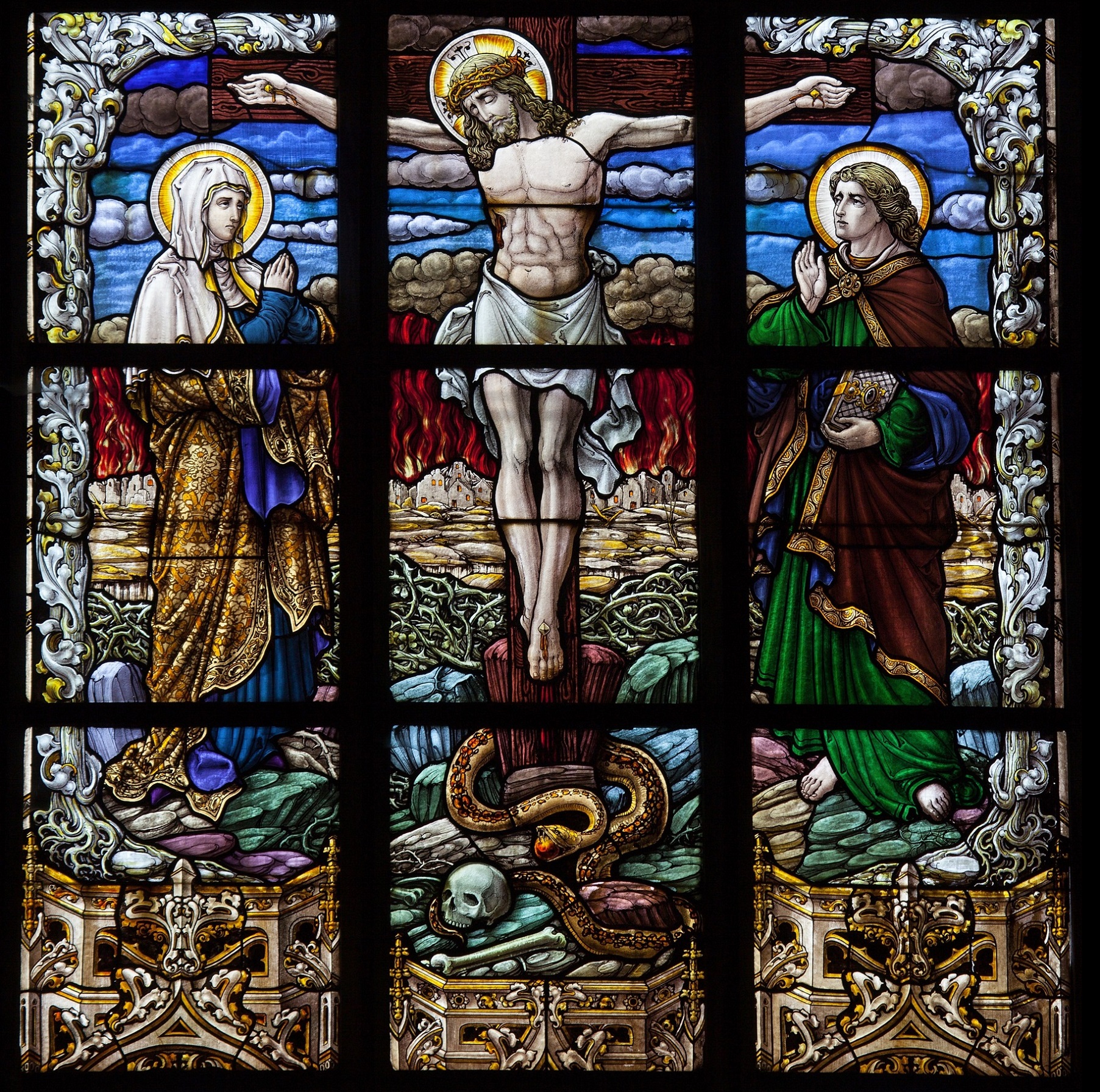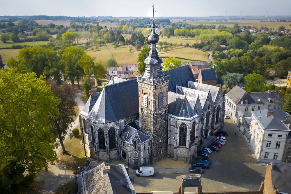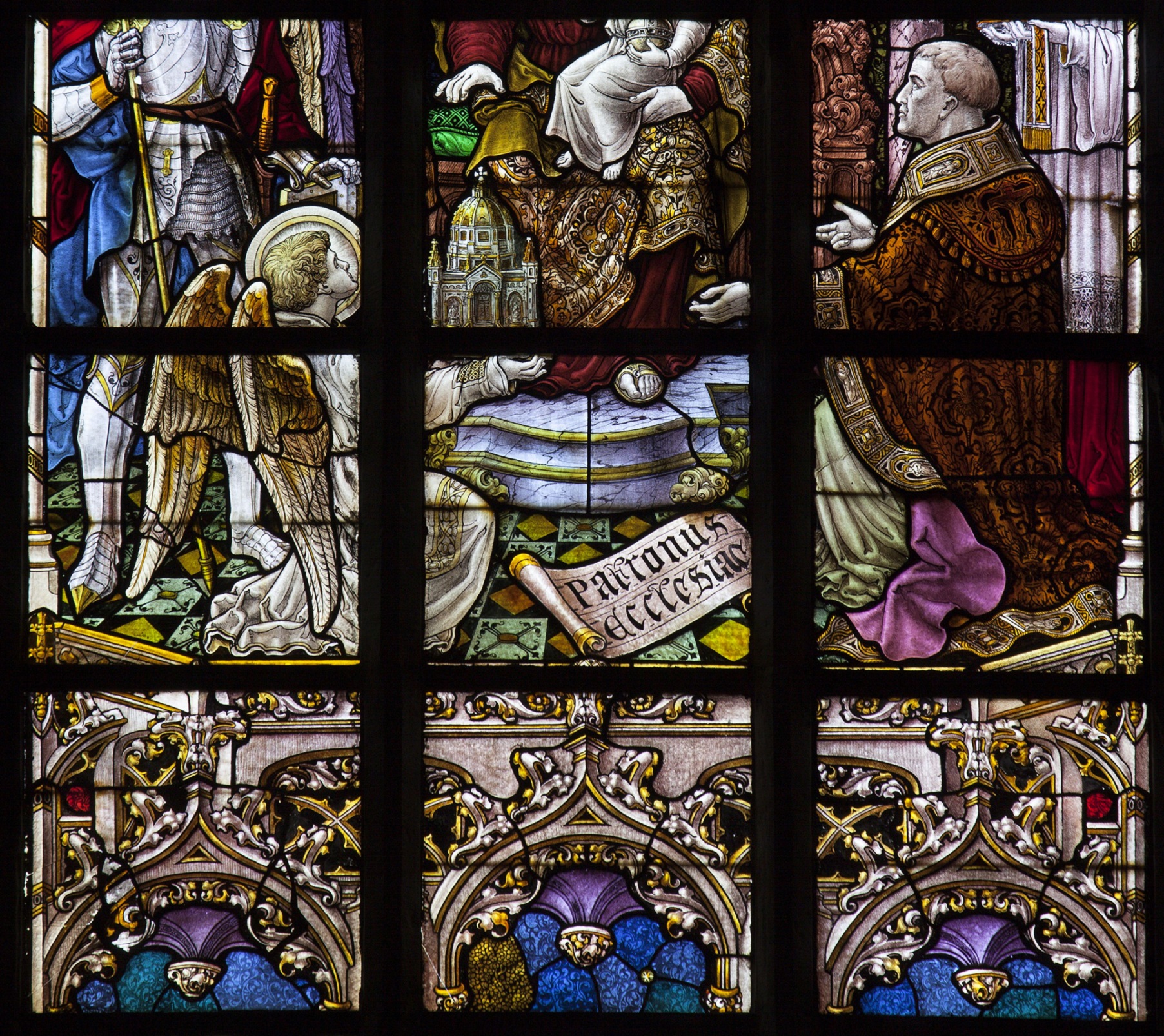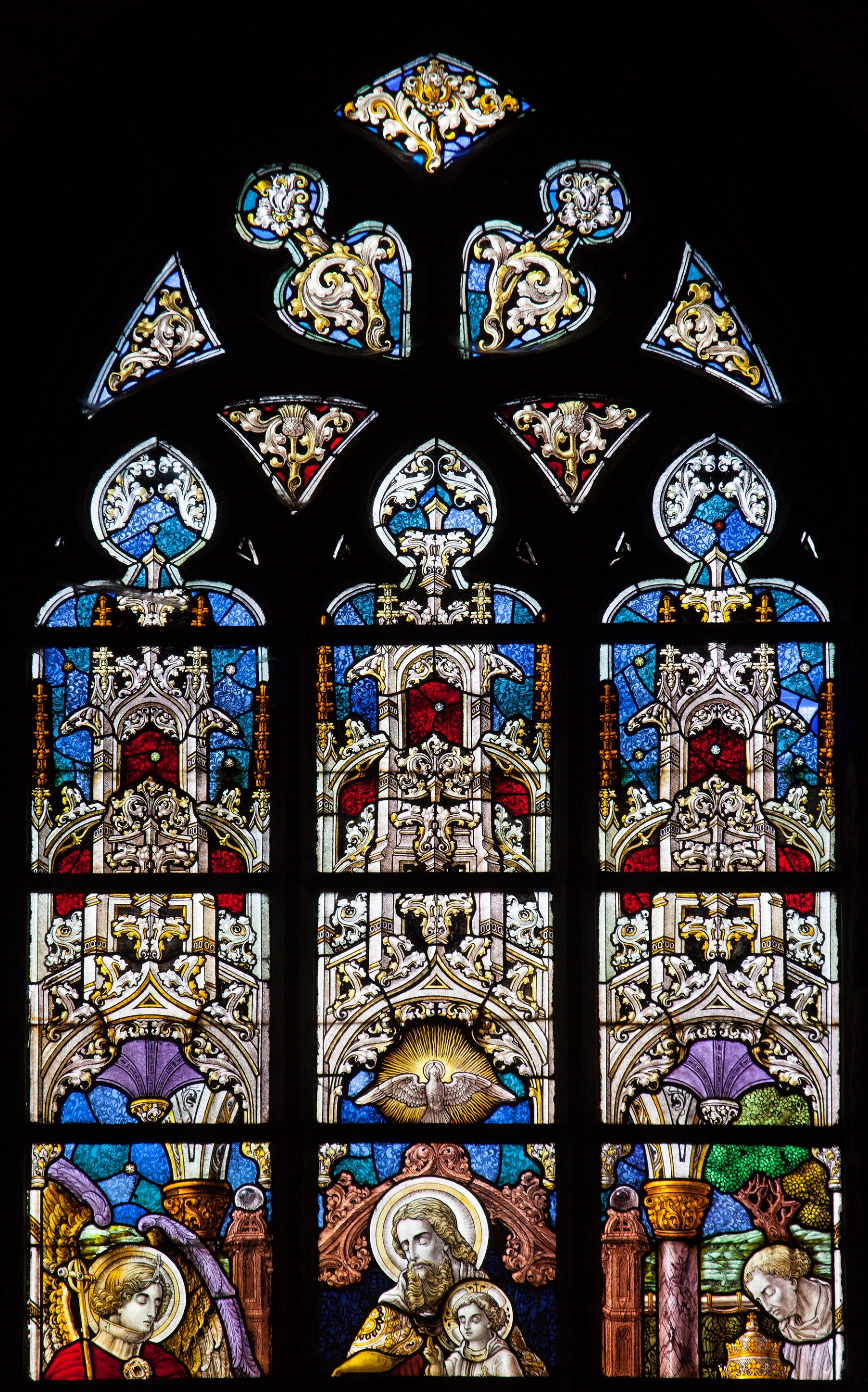 Localisation: Collégiale Saint-Ursmer (chapelle du côté sud et bras méridional du transept), à l'intersection de la rue Haute et de la rue Saint-Moustier. Coordonnées GPS: +50°24'32.8", +4°09'55.8" Inscriptions Vitrail 1 "SAINT MAURICE - I.N.R.I. - SAINT GEORGES AUX MORTS DE LA GRANDE GUERRE 1914 - 1918 EN MÉMOIRE DU LIEUTENANT JEAN-RAYMONT TAUZIN SAINT MICHEL - STE JEANNE D'ARC SAINT DENIS - SAINTE ELISABETH" Vitrail 2 "PATRONUS ECCLESIAE PATRON DE LA BELGIQUE ET DE L'ÉGLISE IN PIAM ELISAE MAUROY MEMORIAM + 9 MAII 1919." Description Vitrail 1 Calvaire et saints (Source [492). Vitrail 2 Au registre supérieur, saint Joseph (Patronus Ecclesiae) tient Jésus sur ses genoux, accompagné de saint Michel, du pape Pie IX (qui a proclamé saint Joseph patron de l'Église universelle en 1870) et d'un ange présentant une maquette de la basilique Saint-Pierre de Rome. Au registre inférieur, saint Joseph patron de la Belgique (Patron de la Belgique et de l'Église), avec une famille paysanne, un forgeron et un militaire tenant le drapeau belge (Source [492). Réalisation : Atelier GANTON-DEFOIN, vers 1920 (Source [492]). Dimensions : environ 5 mètres de hauteur (Source [492]). Plus d'informations concernant les personnes mentionnées sur ces vitraux |