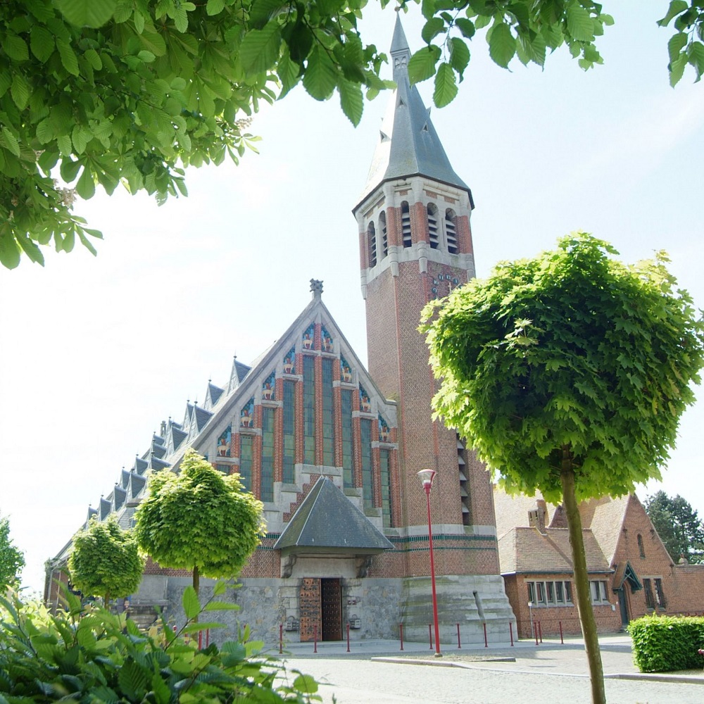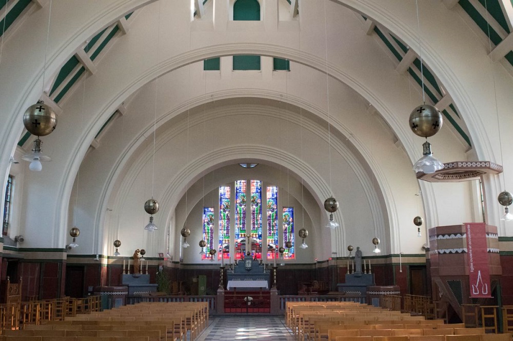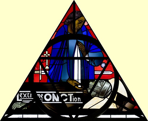 Localisation: Église Saint-Aybert (lucarne du côté nord), rue Wibault-Bouchart. Coordonnées GPS: +50°30'45.6", +3°24'55.6" Inscriptions "L'EXTRÊME ONCTION" Description Détruite par un incendie en 1918, l'église Saint-Aybert est reconstruite en 1926 dans un style art déco par l'architecte Henri LACOSTE (1885-1968). Des lucarnes triangulaires sont aménagées dans la toiture, sur trois niveaux: elles sont garnies d'une série de vitraux illustrant les sacrements. Le vitrail commémoratif de la Première Guerre mondiale illustre le sacrement de l'extrême onction. Celle-ci est administrée à un soldat dans l'environnement duquel on aperçoit le casque, une épée et une croix (Source [492]). Réalisation : Atelier Paul LECLERC, vers 1926, vraisemblablement sur un projet de l'architecte Henri LACOSTE (Source [492]). Ce vitrail ne comporte pas de noms de victimes de guerre |