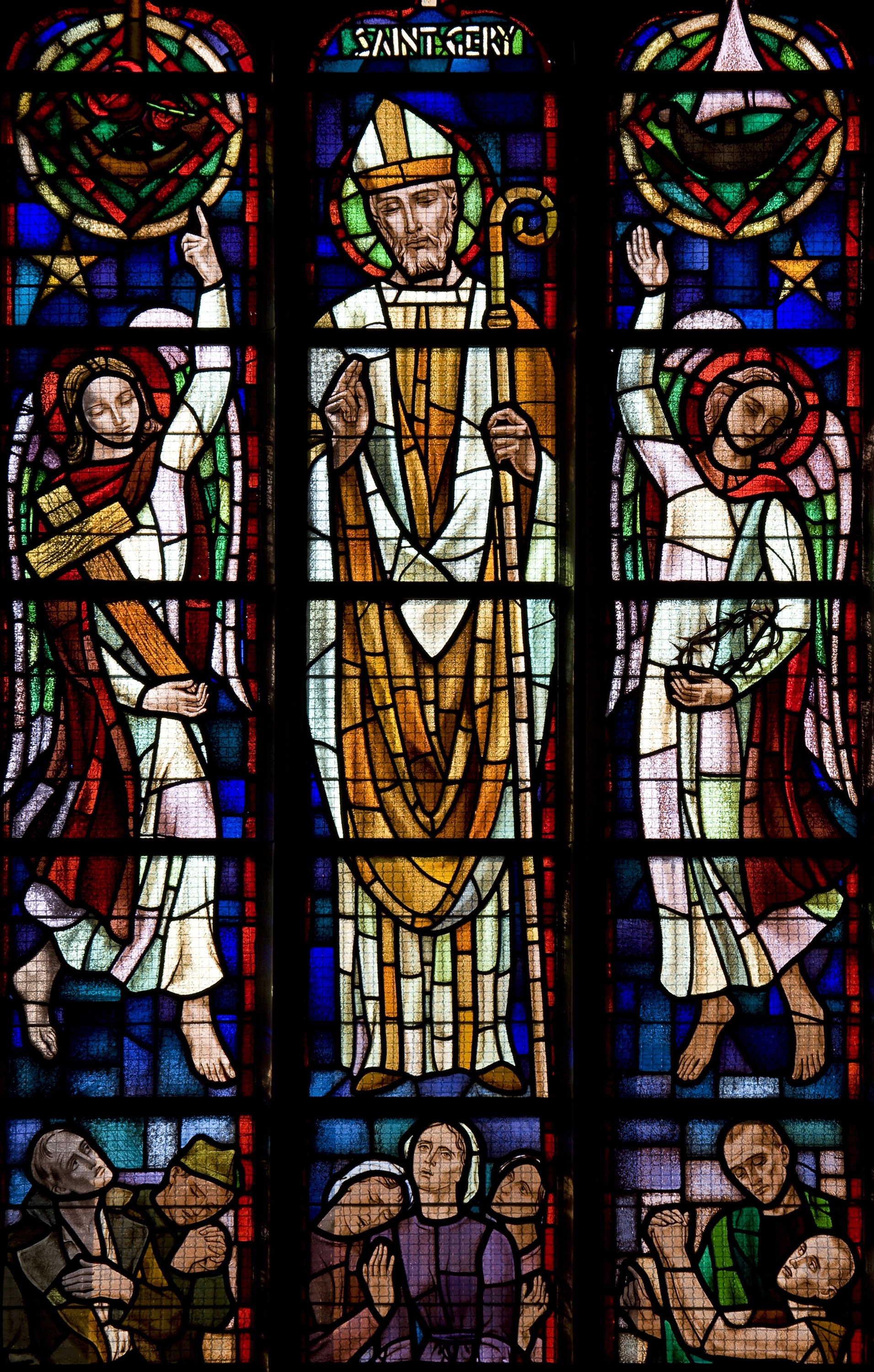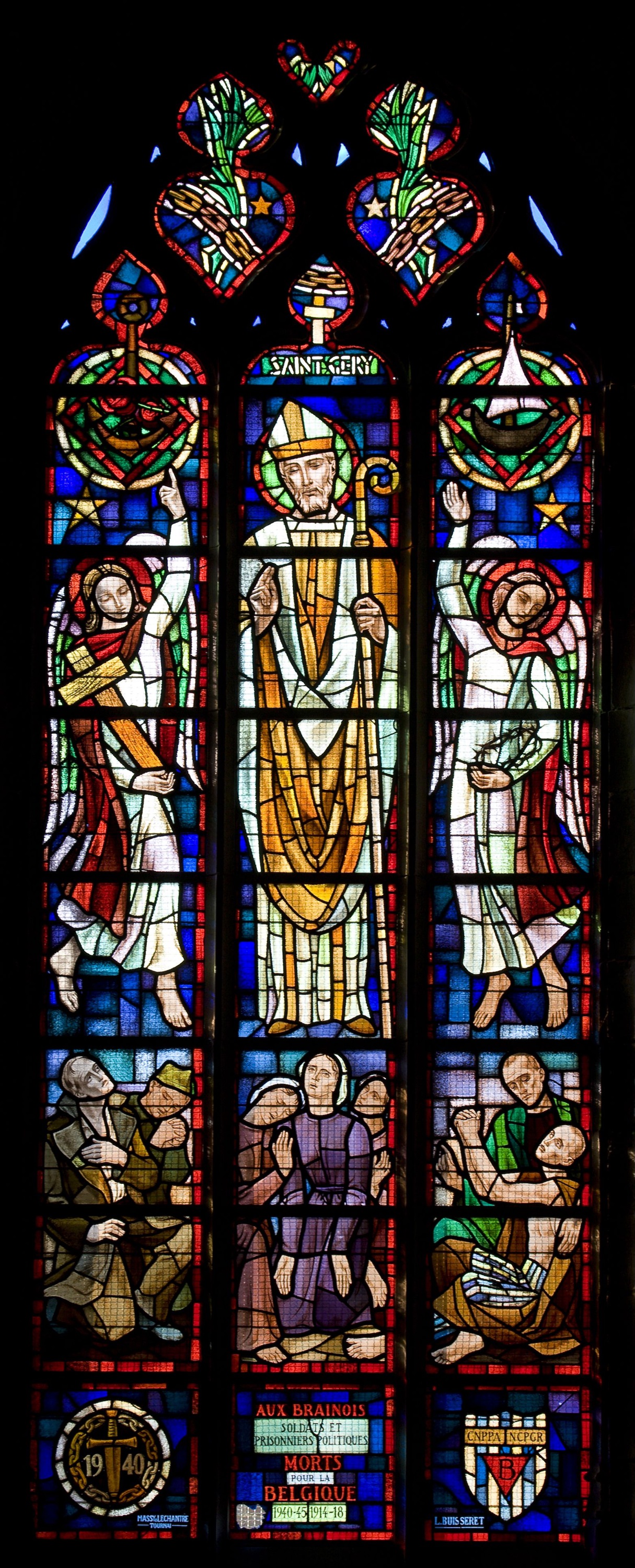 Localisation: Église Saint-Géry, au croisement des rues de Bruxelles et de l'Église. Coordonnées GPS: +50°36'46.7", +4°08'12.5" Inscriptions "SAINT-GÉRY 1940 AUX BRAINOIS SOLDATS ET PRISONNIERS POLITIQUES MORTS POUR LA BELGIQUE 1940-45 - 1914-18 CNPPA NCPGR B" Réalisation : 1953; Atelier MASSY & LECHANTRE, Tournai (signé); concepteur L. BUISSERET (signé) (Source [492]). Dimensions : Hauteur: environ 5,50 m. (Source [492]). Description Saint-Géry est entouré de deux anges portant, l'un, une croix et, l'autre, une couronne d'épines. Au registre inférieur sont agenouillés en prière à gauche des soldats, au centre des civils et à droite des prisonniers libérés. Ils surmontent l'inscription commémorative et les emblèmes de la FNAPG et de la CNPPA placés de part et d'autre de celle-ci (Source [492]). Informations complémentaires La commande de ce vitrail a été initiée par l'abbé RENARD, prisonnier politique de 1944 à 1945 (Source [492]). Ce vitrail ne comporte pas de noms de victimes de guerre |