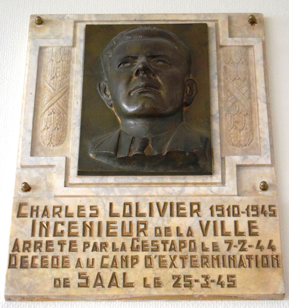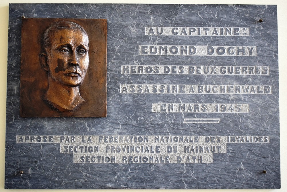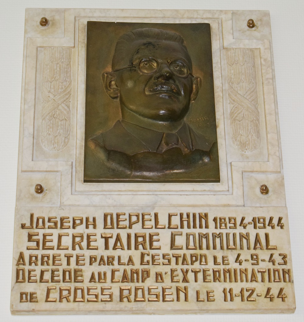 Localisation: Dans les locaux de l'administration communale de Leuze-en-Hainaut, Avenue de la Résistance 1. Coordonnées GPS: +50°36'02.7", +3°37'17.3" Inscriptions Plaque 1 "JOSEPH DEPELCHIN 1894-1944 SECRÉTAIRE COMMUNAL ARRÊTÉ PAR LA GESTAPO LE 4-9-43 DÉCÉDÉ AU CAMP D'EXTERMINATION DE GROSS ROSEN LE 11-12-44" Plaque 2 "AU CAPITAINE : EDMOND DOCHY HÉROS DES DEUX GUERRES ASSASSINÉ À BUCHENWALD EN MARS 1945 APPOSÉ PAR LA FÉDÉRATION NATIONALE DES INVALIDES SECTION PROVINCIALE DU HAINAUT SECTION RÉGIONALE D'ATH" Plaque 3 "CHARLES LOLIVIER 1910-1945 INGÉNIEUR DE LA VILLE ARRÊTÉ PAR LA GESTAPO LE 7-2-44 DÉCÉDÉ AU CAMP D'EXTERMINATION DE SAAL LE 25-3-45" Réalisation Pour DEPELCHIN et LOLIVIER : Prudent MOMIREL, 1945 (Leuze-en-Hainaut 1920 – Tournai 2002) (signé ). Pour Edmond DOCHY : Charles GADENNE, 1947 (Roubaix, 1925 - Saint-Pol-sur-Mer 2012) (signé). Plus d'informations concernant ces victimes |