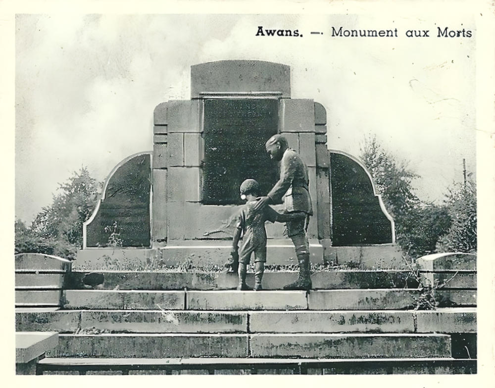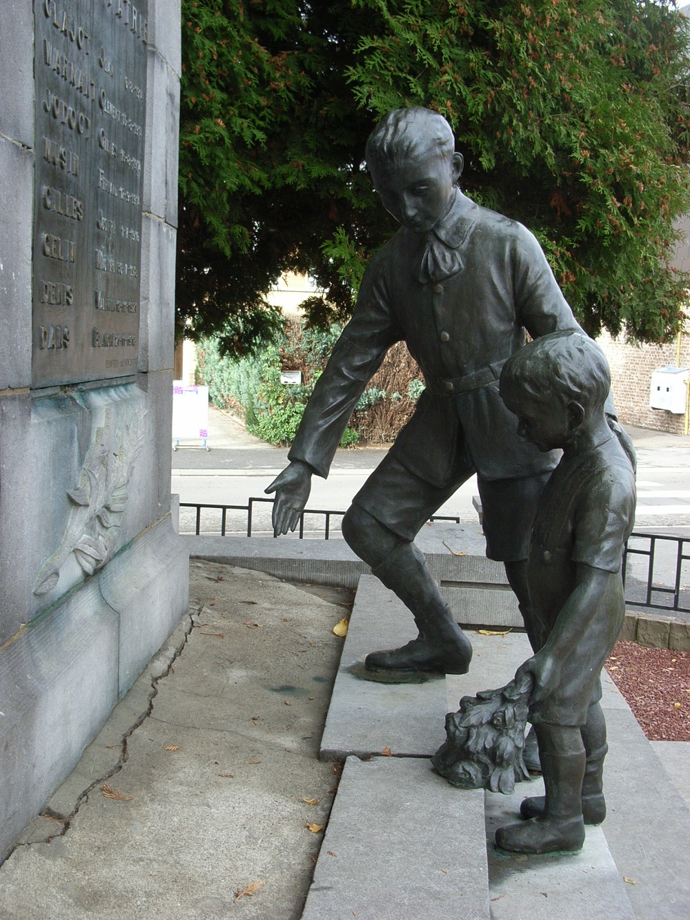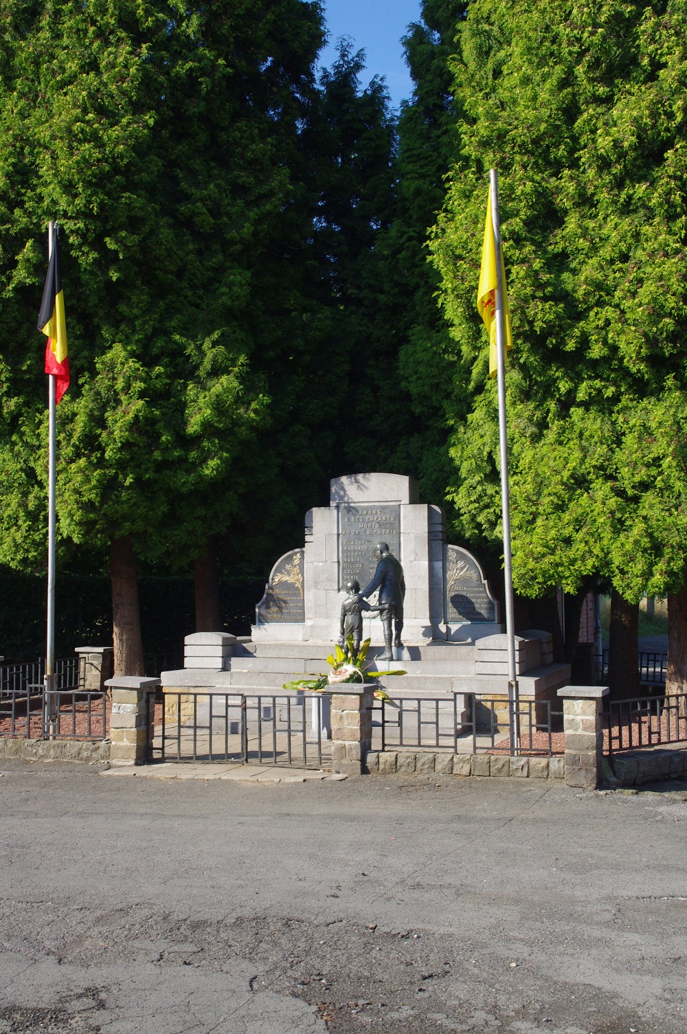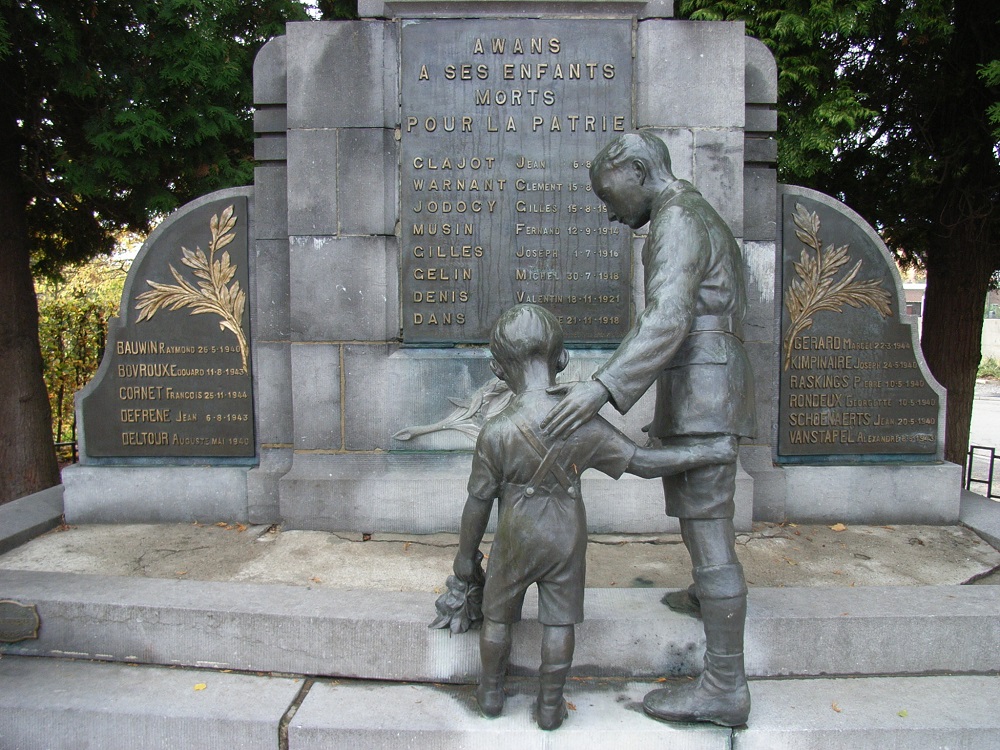 Localisation: Place communale. Coordonnées GPS: +50° 40' 1.90", +5° 27' 46.00". Inscriptions Panneau central "AWANS À SES ENFANTS MORTS POUR LA PATRIE [Huit noms de personnes décédées en 1914-1918, non classées par ordre alphabétique, avec indication de la date de décès]" Panneau gauche "[Cinq noms de personnes décédées en 1940-1945, classées par ordre alphabétique, avec indication de la date de décès]" Panneau droit "[Six noms de personnes décédées en 1940-1945, classées par ordre alphabétique, avec indication de la date de décès]" Réalisation de la statue: Bronzes d'art DEHIN Frères, Liège (signé). Voir les noms gravés sur ce monument |