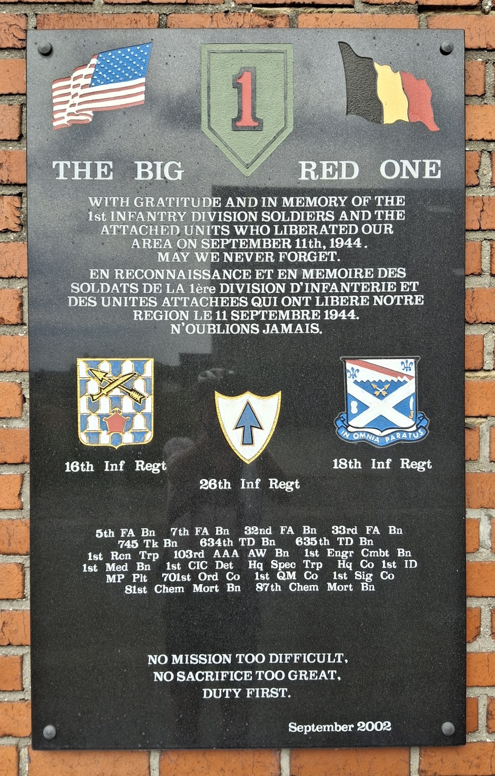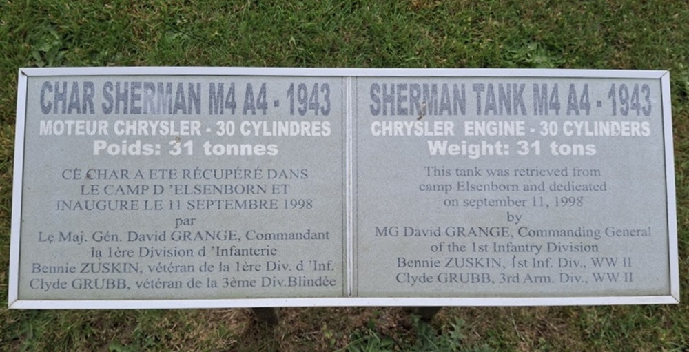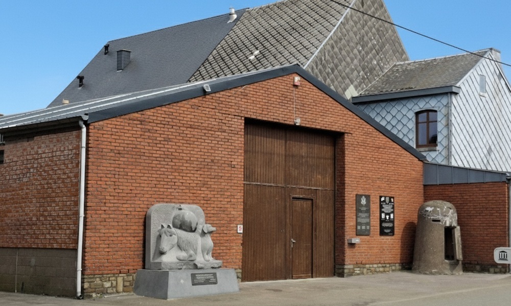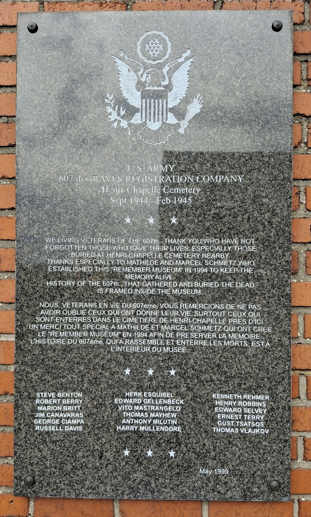 Localisation: Thier Les Béolles, sur la façade du Remember Museum 39 - 45. Coordonnées GPS: +50°40'07.4", +5°53'01.4" Inscriptions Sur la plaque de gauche "U.S. ARMY 607TH GRAVES REGISTRATION COMPANY HENRI-CHAPELLE CEMETERY SEPT 1944 - FEB 1945 WE LIVING VETERANS OF THE 607TH THANK YOU WHO HAVE NOT FORGOTTEN THOSE WHO GAVE THEIR LIVES, ESPECIALLY THOSE BURIED AT HENRI-CHAPELLE CEMETERY NEARBY. THANKS ESPECIALLY TO MATHILDE AND MARCEL SCHMETZ WHO ESTABLISHED THIS REMEMBER MUSEUM EN 1994 TO KEEP THE MEMORY ALIVE. HISTORY OF THE 607TH THAT GATHERED AND BURIED THE DEAD IS FRAMED INSIDE THE MUSEUM NOUS, VÉTÉRANS EN VIE DU 607ÈME, VOUS REMERCIONS DE NE PAS AVOIR OUBLIÉ CEUX QUI ONT DONNÉ LEUR VIE, SURTOUT CEUX QUI SONT ENTERRÉS DANS LE CIMETIÈRE DE HENRI-CHAPELLE PRÈS D'ICI. UN MERCI TOUT SPÉCIAL À MATHILDE ET MARCEL SCHMETZ QUI ONT CRÉÉ LE REMEMBER MUSEUM EN 1994 AFIN DE PRÉSERVER LA MÉMOIRE. L'HISTOIRE DU 607ÈME QUI A RASSEMBLÉ ET ENTERRÉ LES MORTS EST À L'INTÉRIEUR DU MUSÉE. 18 SIGNATURES DE VÉTÉRANS, SUR TROIS COLONNES, CLASSÉES PAR ORDRE ALPHABÉTIQUE" Sur la plaque de droite [Drapeau américain - Blason de la 1ère Division d'Infanterie - drapeau belge] WITH GRATITUDE AND IN MEMORY OF THE 1ST INFANTRY DIVISION SOLDIERS AND THE ATTACHED UNITS WHO LIBERATED OUR AREA ON SEPTEMBER 11TH, 1944. MAY WE NEVER FORGET EN RECONNAISSANCE ET EN MÉMOIRE DES SOLDATS DE LA 1ÈRE DIVISION D'INFANTERIE ET DES UNITÉS ATTACHÉES QUI ONT LIBÉRÉ NOTRE RÉGION LE 11 SEPTEMBRE 1944. N'OUBLIONS JAMAIS. [Blason du 16th Inf Regt - Blason du 26th Inf Regt - Blason du 18th Inf Regt] 5th FA Bn 7th FA Bn 32nd FA Bn 33rd FA Bn 745 Tk Bn 634th TD Bn 635th TD Bn 1st Rcn Trp 103rd AAA AW Bn 1st Engr Cmbt Bn 1st Med Bn 1st CIC Det Hq Spec Trp Hq Co 1st ID MP Plt 701st Ord Co 1st QM Co 1st Sig Co 81st Chem Mort Bn 87th Chem Mort Bn NO MISSION TOO DIFFICULT, NO SACRIFICE TOO GREAT. DUTY FIRST. SEPTEMBER 2002" Sur la plaque devant le char "CHAR SHERMAN M4 A4 - 1943 MOTEUR CHRYSLER - 30 CYLINDRES POIDS: 31 TONNES CE CHAR A ÉTÉ RÉCUPÉRÉ DANS LE CAMP D'ELSENBORN ET INAUGURÉ LE 11 SEPTEMBRE 1998 PAR LE MAJ. GÉN. DAVID GRANGE, COMMANDANT LA 1ÈRE DIVISION D'INFANTERIE BENNIE ZUSKIN, VÉTÉRAN DE LA 1ÈRE DIV. D'INF. CLYDE GRUBB, VÉTÉRAN DE LA 3ÈME DIV. BLINDÉE" Informations complémentaires Le "Remember Museum" a été inauguré le 12 juin 1944. Les hommes de la 607th Graves Registration Co. ont enterré 75000 soldats pendant la seconde guerre mondiale. (Source: Les Carnets de notre Patrimoine - Thimister-Clermont - Hors série n° 5 de 2012) Devant le musée se trouve un monument dédié aux animaux qui ont servi pendant les guerres. Pour accéder à la page du site qui lui est consacré : Monument aux animaux de la guerre Ce monument ne comporte pas de noms de victimes de guerre |