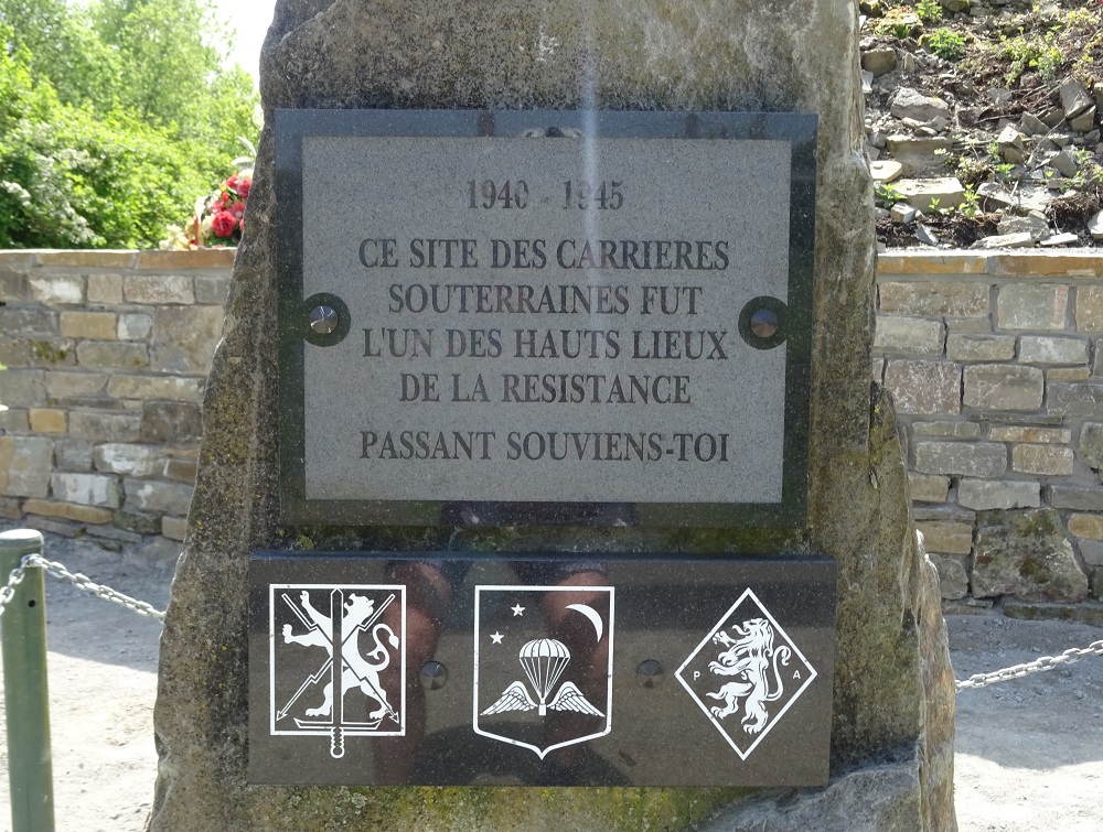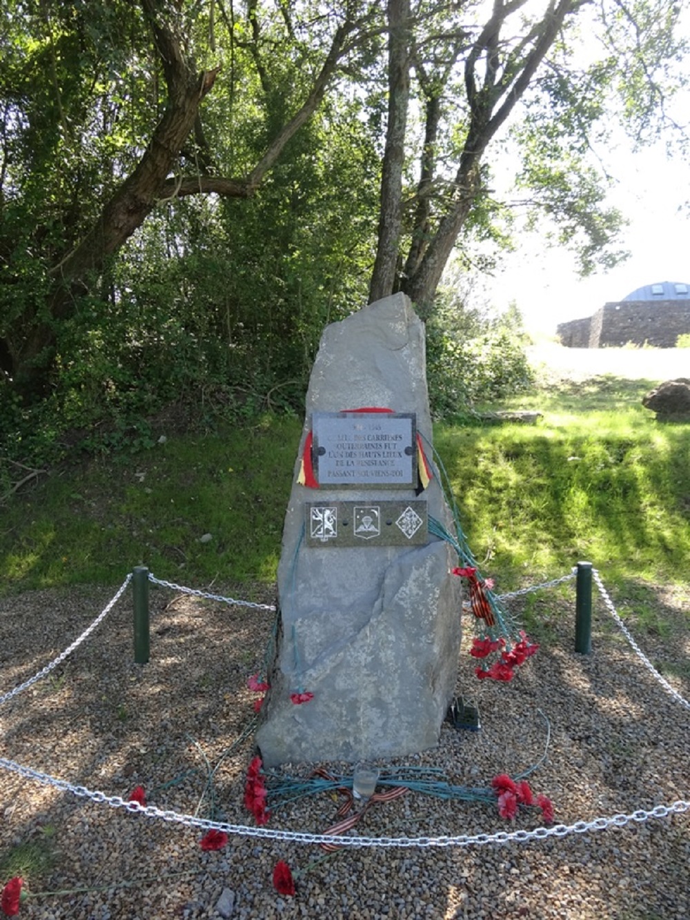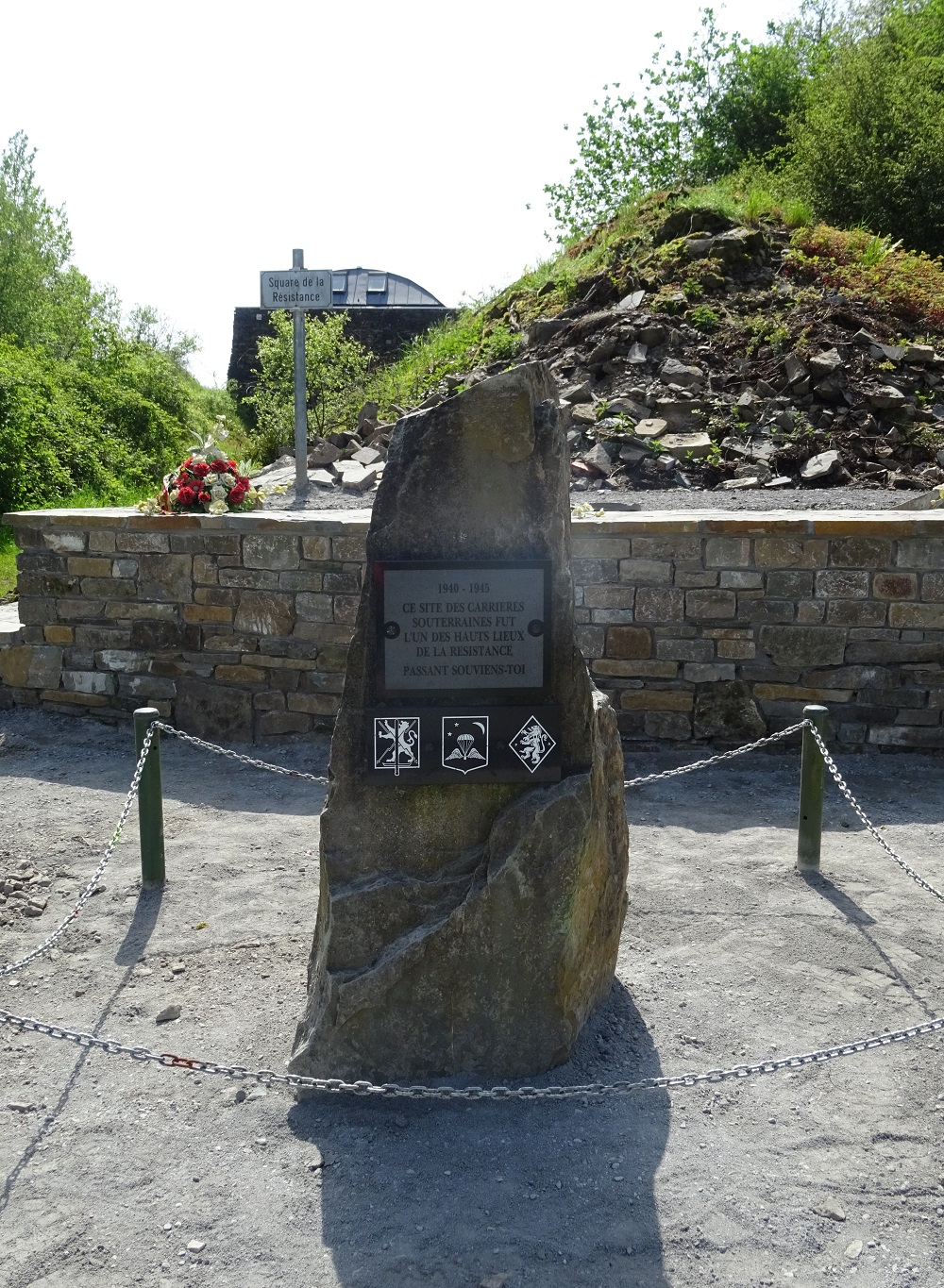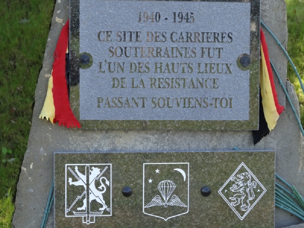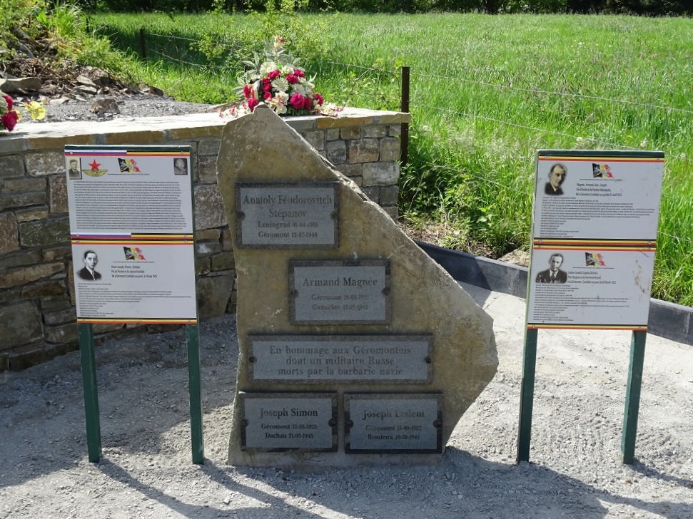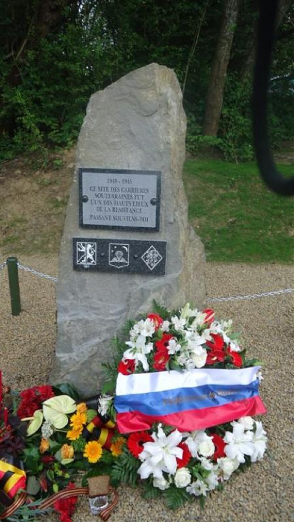 Localisation: Rue de la Carrière, devant l'entrée du Centre d'interprétation de la chauve-souris (installé en surplomb des anciennes carrières de Géromont). Coordonnées GPS: +50°28'04.01", +5°34'08.24" Inscriptions Sur le monument avant restauration "1940 - 1945 CE SITE DES CARRIÈRES SOUTERRAINES FUT L'UN DES HAUTS LIEUX DE LA RÉSISTANCE PASSANT SOUVIENS-TOI" Sur la pierre ajoutée en 2023 "EN HOMMAGE AUX GÉROMONTOIS DONT UN MILITAIRE RUSSE MORTS PAR LA BARBARIE NAZIE [Quatre noms, avec lieux et dates de naissance et de décès]" Informations complémentaires Parmi les résistants ayant opéré à cet endroit, on peut citer les agents parachutistes Jooris, Dubuisson, Magis, Monami, etc.; des Agents RUSRA ( Royale Union des Services de Renseignements et d’Action ), par exemple le Dr HENON; des partisans armés Comblinois et Russes (??) (Source: Dany COLOGNI) En 2023, le monument a été restauré et déplacé de quelques mètres, toujours devant l'entrée du Centre d'interprétation de la chauve-souris (installé en surplomb des anciennes carrières de Géromont). De plus, une seconde pierre a été ajoutée ainsi que des plaques du cercle historique des anciens sous-officiers d'Ourthe-Amblève reprenant l'historique des quatre victimes. Plus d'informations concernant les victimes |