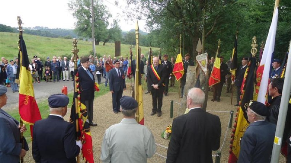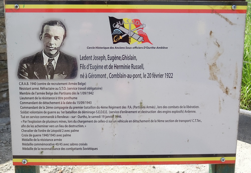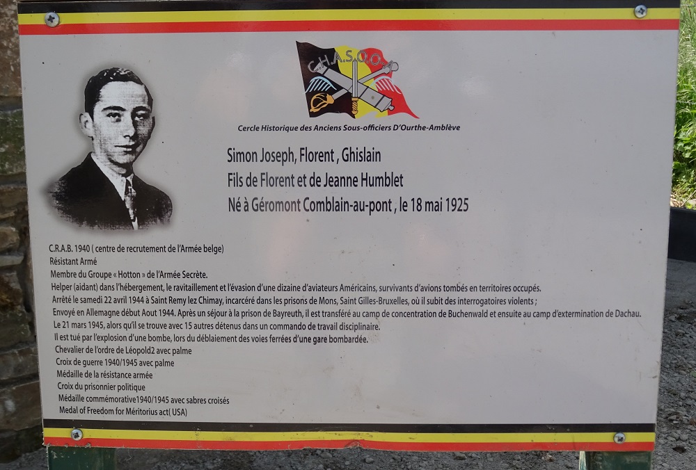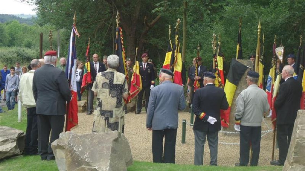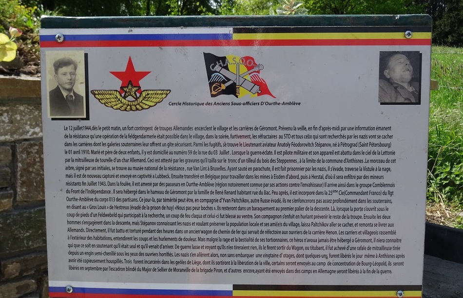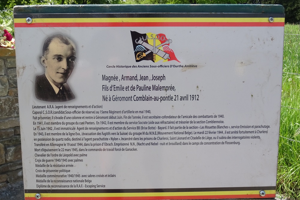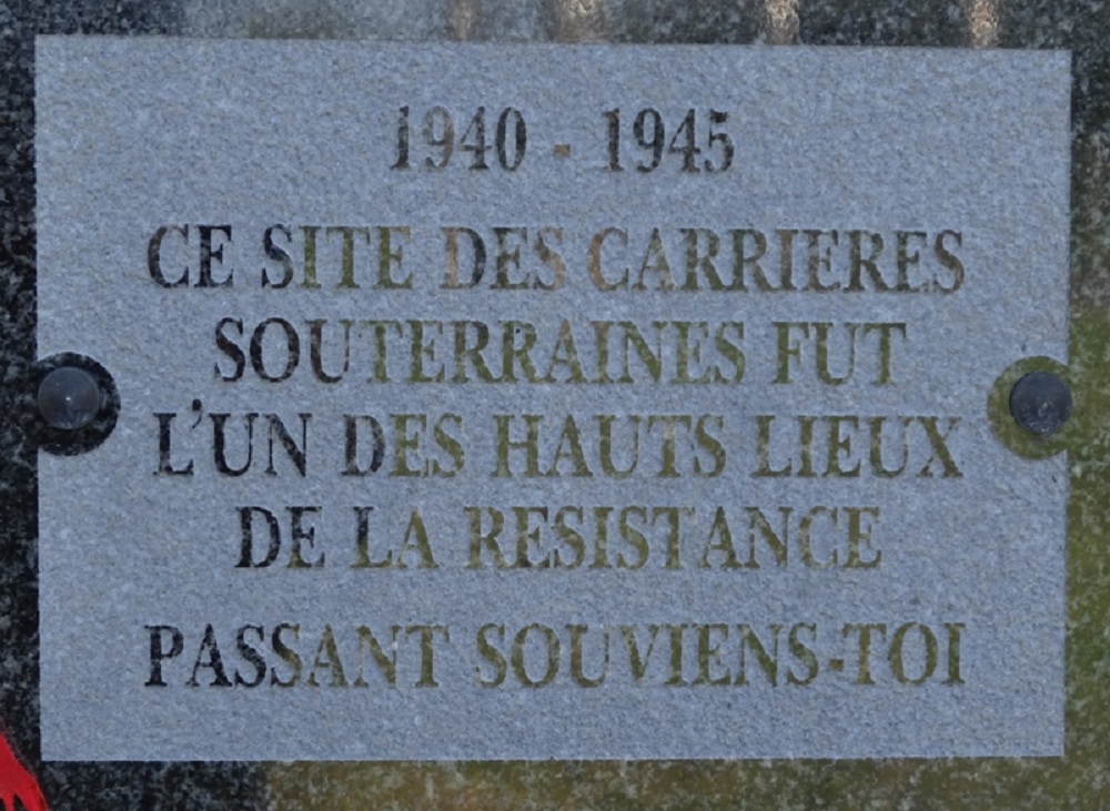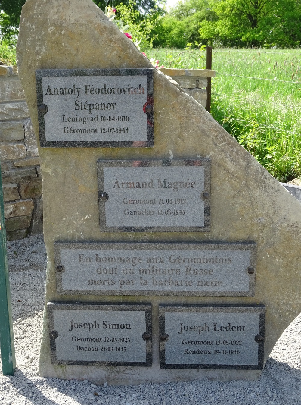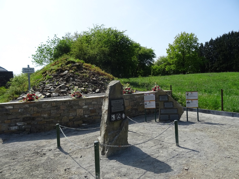 Localisation: Rue de la Carrière, devant l'entrée du Centre d'interprétation de la chauve-souris (installé en surplomb des anciennes carrières de Géromont). Coordonnées GPS: +50°28'04.01", +5°34'08.24" Inscriptions Sur le monument avant restauration "1940 - 1945 CE SITE DES CARRIÈRES SOUTERRAINES FUT L'UN DES HAUTS LIEUX DE LA RÉSISTANCE PASSANT SOUVIENS-TOI" Sur la pierre ajoutée en 2023 "EN HOMMAGE AUX GÉROMONTOIS DONT UN MILITAIRE RUSSE MORTS PAR LA BARBARIE NAZIE [Quatre noms, avec lieux et dates de naissance et de décès]" Informations complémentaires Parmi les résistants ayant opéré à cet endroit, on peut citer les agents parachutistes Jooris, Dubuisson, Magis, Monami, etc.; des Agents RUSRA ( Royale Union des Services de Renseignements et d’Action ), par exemple le Dr HENON; des partisans armés Comblinois et Russes (??) (Source: Dany COLOGNI) En 2023, le monument a été restauré et déplacé de quelques mètres, toujours devant l'entrée du Centre d'interprétation de la chauve-souris (installé en surplomb des anciennes carrières de Géromont). De plus, une seconde pierre a été ajoutée ainsi que des plaques du cercle historique des anciens sous-officiers d'Ourthe-Amblève reprenant l'historique des quatre victimes. Plus d'informations concernant les victimes |