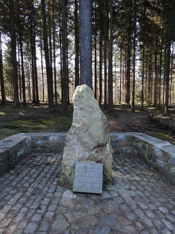 Localisation de ce monument: Dans le bois du Hé du Pouhon, au carrefour de quatre chemins (Vôye di Brâ, le Burnontige/le Thier, Vôye dèl Hé dè Pouhon et le Burnontige/Malboutée). Coordonnées GPS: +50°22'43.11", +5°37'35.86" Inscription figurant sur le monument "ABATTUS PAR LES NAZIS LE 2.9.44 [Trois noms, classés par âge]" Voir les noms gravés sur ce monument |