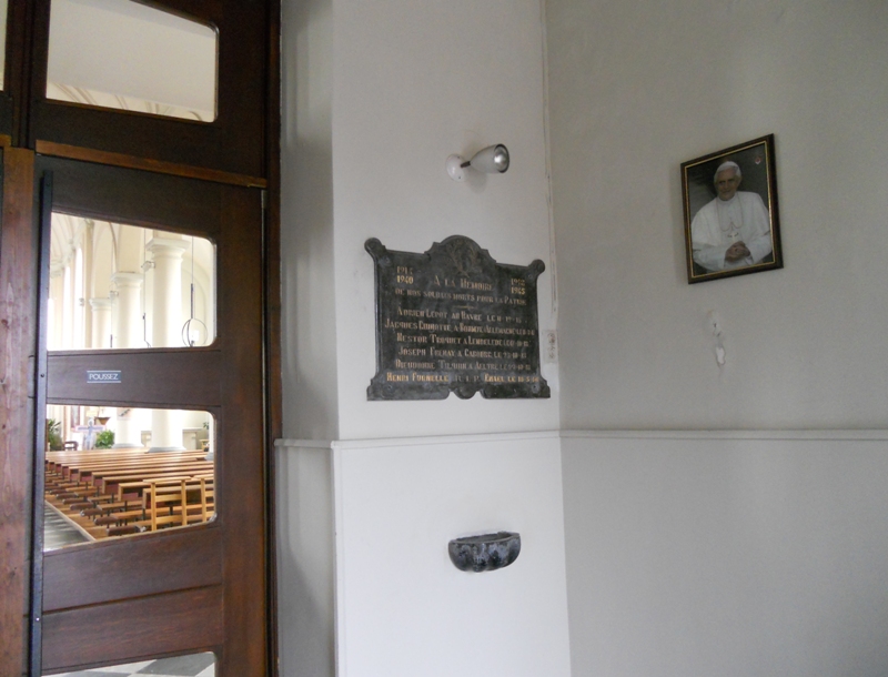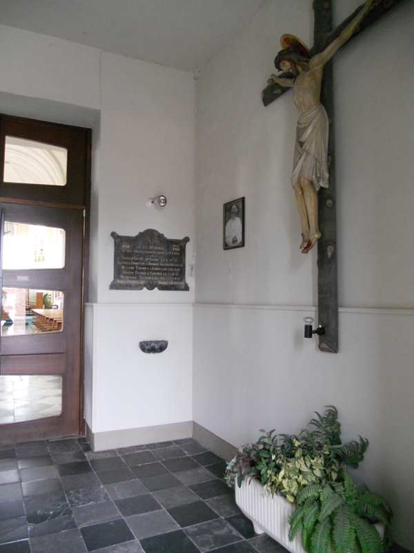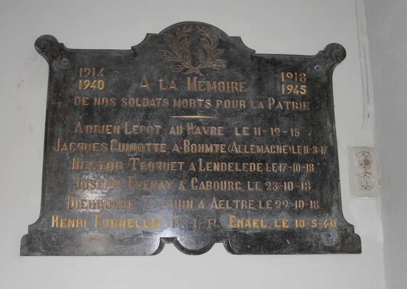 Localisation de cette plaque: Rue Saint-Siméon, dans le porche d'entrée de l'église Saint-Siméon. Coordonnées GPS: +50°44'20.82", +5°36'34.21" Inscriptions figurant sur la plaque "1914 1918 1940 À LA MÉMOIRE 1945 DE NOS SOLDATS MORTS POUR LA PATRIE [Six noms, avec lieu et date de décès, classés par ordre chronologique de décès]" Voir les noms mentionnés sur cette plaque |