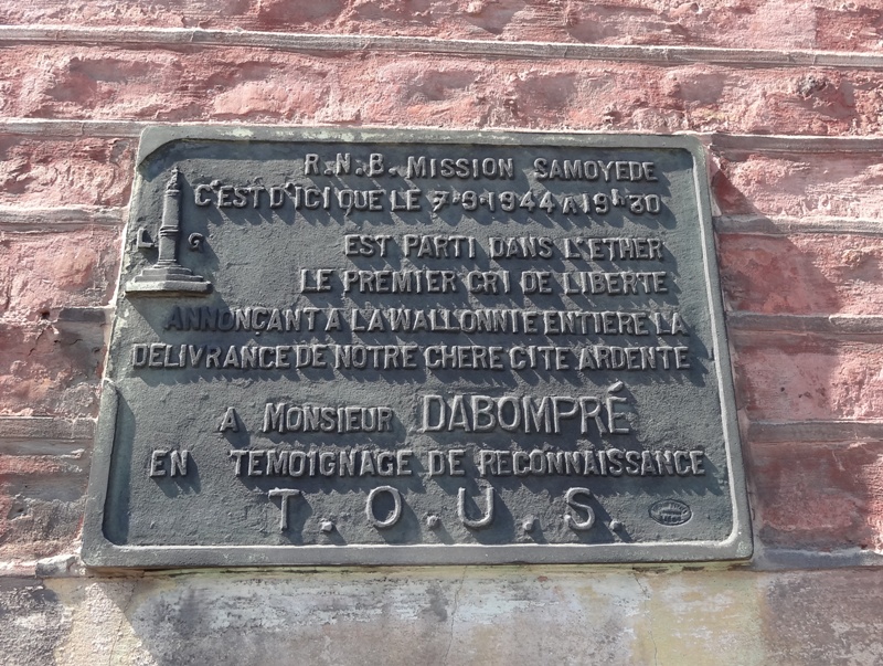 Localisation de cette plaque: Boulevard Jean de Wilde, sur la façade de l'habitation n°53. Coordonnées GPS: +50°39'39.33", +5°34'02.26" Inscription figurant sur la plaque "R.N.B. MISSION SAMOYEDE C'EST D'ICI QUE LE 7-9-1944 À 19H30 EST PARTI DANS L'ÉTHER LE PREMIER CRI DE LIBERTÉ ANNONçANT À LA WALLONNIE ENTIÈRE LA DÉLIVRANCE DE NOTRE CHÈRE CITÉ ARDENTE À MONSIEUR DABOMPRÉ EN TÉMOIGNAGE DE RECONNAISSANCE T.O.U.S." Informations complémentaires: Samoyède avait l’intention, directement après la Libération, de faire fonctionner huit stations d’information : deux à Bruxelles, trois en Flandre et trois en Wallonie. En réalité, on ne parvint à en mettre en service que quatre. Chaque émetteur de province jouit d’une indépendance complète. Les instructions qu’il reçoit lui donne pleins pouvoirs pour faire ses programmes et ses bulletins d’information ; du personnel spécialisé sera adjoint et des disques de phono seront fournis dans les premiers jours de la Libération. De plus, une liaison sur ondes courtes est prévue et chaque émetteur dispose d’un code qui lui permet de demander des instructions au poste central de Bruxelles. Chaque émetteur fonctionne sur cristal et une longueur d’onde propre lui est assignée. Il faut également ajouter à ce dispositif le recrutement d’une équipe pour la défense et la protection des locaux le jour J. Il est à souligner que l’occupant ne trouva jamais le moyen d’infiltrer un seul des agents dans la branche technique du réseau. Seuls des éléments de l’émetteur de Diest tombèrent entre les mains de l’ennemi à la suite d’une dénonciation locale. En réalité, les Allemands n’eurent jamais aucun soupçon sur la réalisation d’une telle entreprise clandestine performante et organisée à l’insu de leurs services de dépistage. À Liège, Arthur Dabompré est désigné responsable de l’équipe liégeoise par François Landrain début juillet 1943. Jean Mertens prend le micro le 8 septembre, jour où les troupes américaines prennent la ville alors que la rive gauche de la Meuse est encore aux mains des Allemands. Les émissions sont cependant interrompues le 9 septembre à la demande du commandant américain et reprises seulement en octobre. L’émetteur fonctionnera sous les bombardements V1 et pendant l’offensive allemande des Ardennes (Source: Blog: Mission Samoyède) L'émetteur Samoyède de Liège fut opérationnel le 8 septembre 1944, à 9 heures, en même temps que la libération de la ville. Il fut installé à la rue Jean De Wilde. Son premier speaker fut Jean Mertens (Source: Archives du journal "Le Soir") Remarque: à noter la faute d'orthographe dans le nom "Wallonie" ! Cette plaque ne comporte pas de noms |