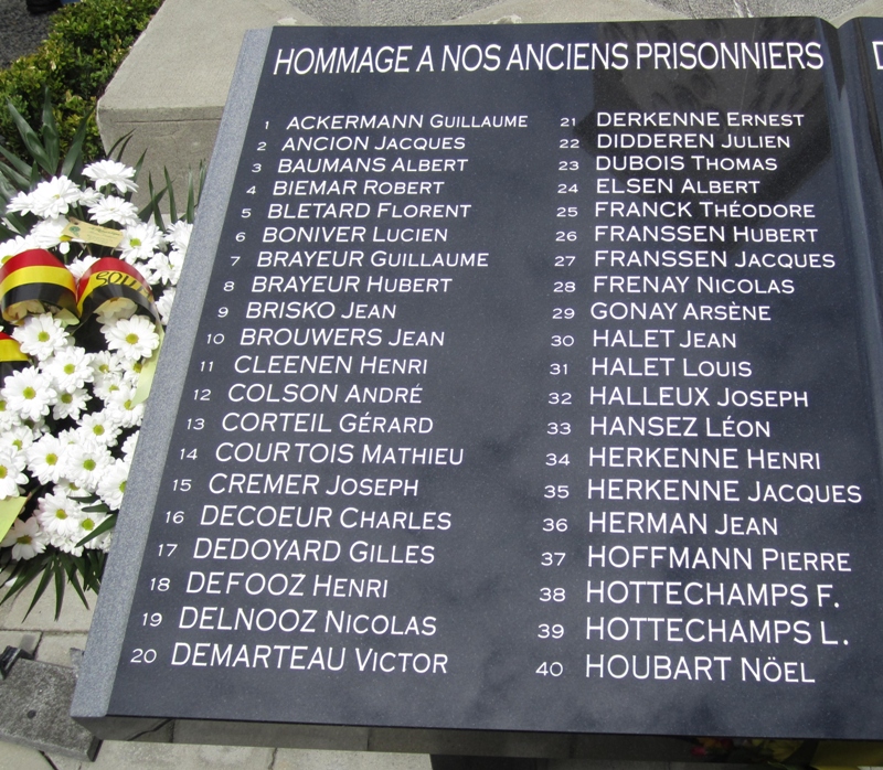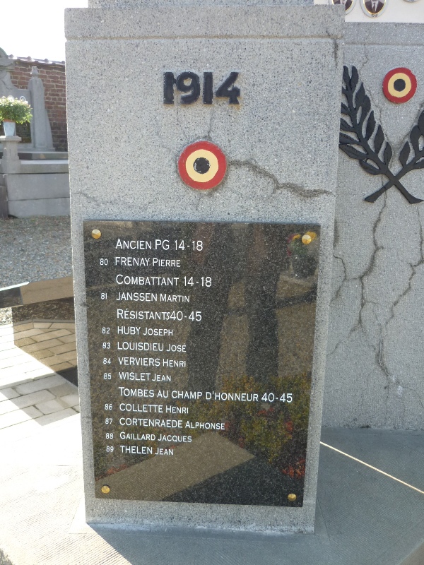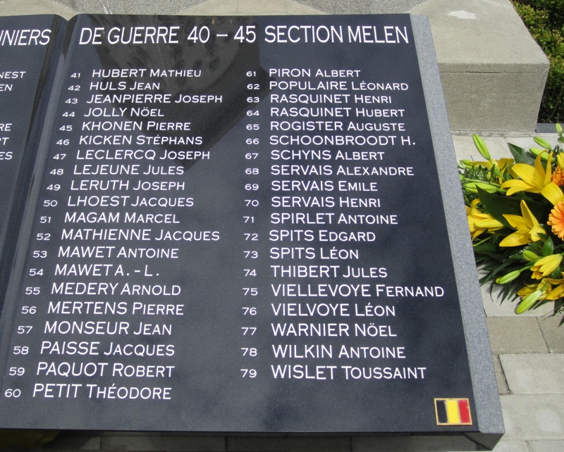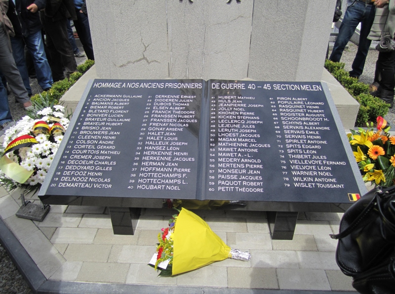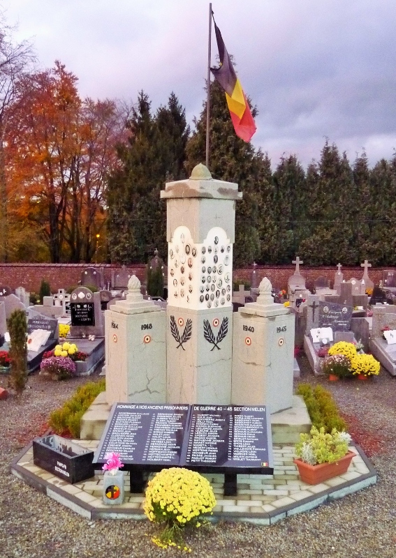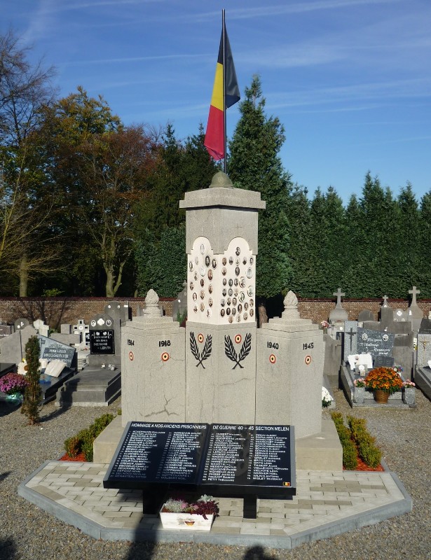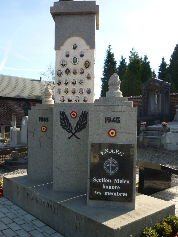 Localisation: Rue de Cerexhe, dans le cimetière communal de Melen. Coordonnées GPS: +50°38'45.41", +5°43'57.67" Inscriptions Sur le bas du monument "SOUVENEZ-VOUS" Sur la plaque commémorative "FNAPG SECTION MELEN HONORE SES MEMBRES" Sur le livre en marbre noir à l'avant du monument "HOMMAGE À NOS ANCIENS PRISONNIERS DE GUERRE 40-45 SECTION MELEN [Septante-neuf noms, sur quatre colonnes, numérotés et classés par ordre alphabétique]" Sur une plaque à l'arrière du monument "ANCIEN PG 14-18 [Un nom] COMBATTANT 14-18 [Un nom] RÉSISTANTS 40-45 [Quatre noms, classés par ordre alphabétique] TOMBÉS AU CHAMP D'HONNEUR 40-45 [Quatre noms, classés par ordre alphabétique]" Informations complémentaires Le 8/5/2012, devant le monument, un livre en marbre noir avec le nom des septante-neuf anciens prisonniers de guerre de Melen a été inauguré. Nonante-deux médaillons sont collés sur les 4 faces du monument (parmi eux, il y en a d'autres que ceux de prisonniers de guerre 40-45). Quatre-vingt-neuf ont été identifiés (Source: Alain PIRON, secrétaire de la FNAPG-FB (Fédération National Anciens Prisonniers de Guerre – Fonds Barbelés) de la section de Melen). Voir les noms mentionnés sur ce monument |