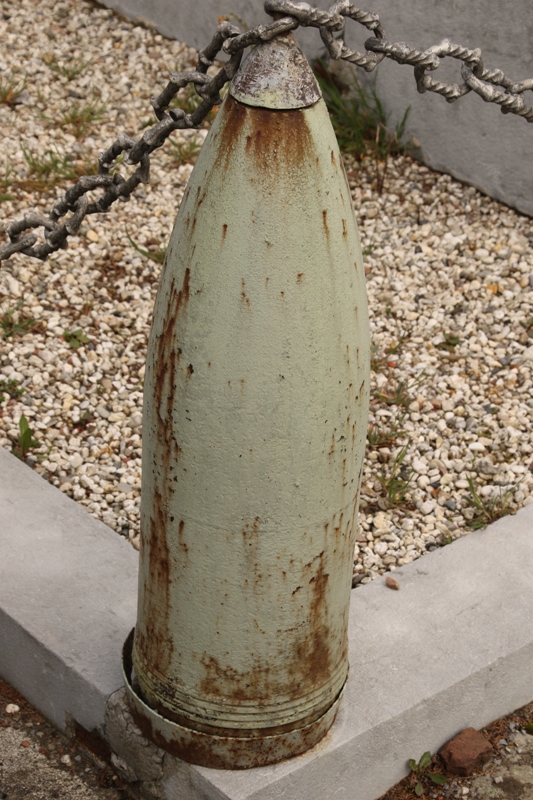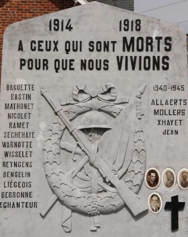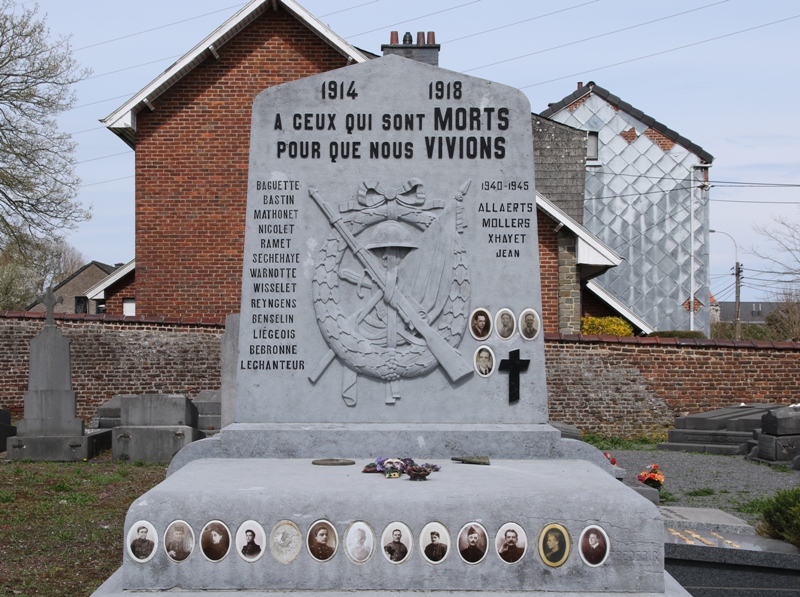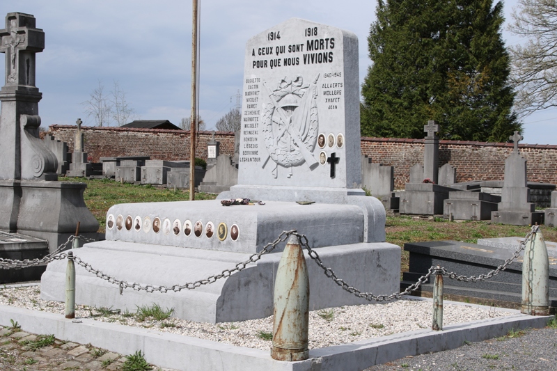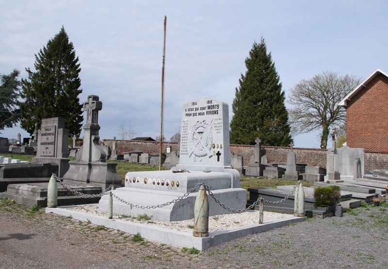 Localisation de ce monument: Cimetière communal, place de la Moinerie. Coordonnées GPS: . Inscription figurant sur le monument "1914 1918 À CEUX QUI SONT MORTS POUR QUE NOUS VIVIONS [À la gauche de la sculpture] [Treize noms de 1914-1918, non classés par ordre alphabétique] [La sculpture représente une couronne de lauriers suspendue à un ruban. La couronne est ornée en son centre d'un drapeau croisé avec un fusil et une baïonnette, le tout surmonté d'un casque] [À la droite de la sculpture] 1940 - 1945 [Quatre noms, non classés par ordre alphabétique, avec photo dans un médaillon en porcelaine] [Sur l'avant du caveau] [Treize photos dans des médaillons en porcelaine]" L'ensemble est entouré d'un parterre recouvert de cailloux blancs, entouré par une chaîne soutenue par des pointes d'obus. Voir les noms gravés sur ce monument |
