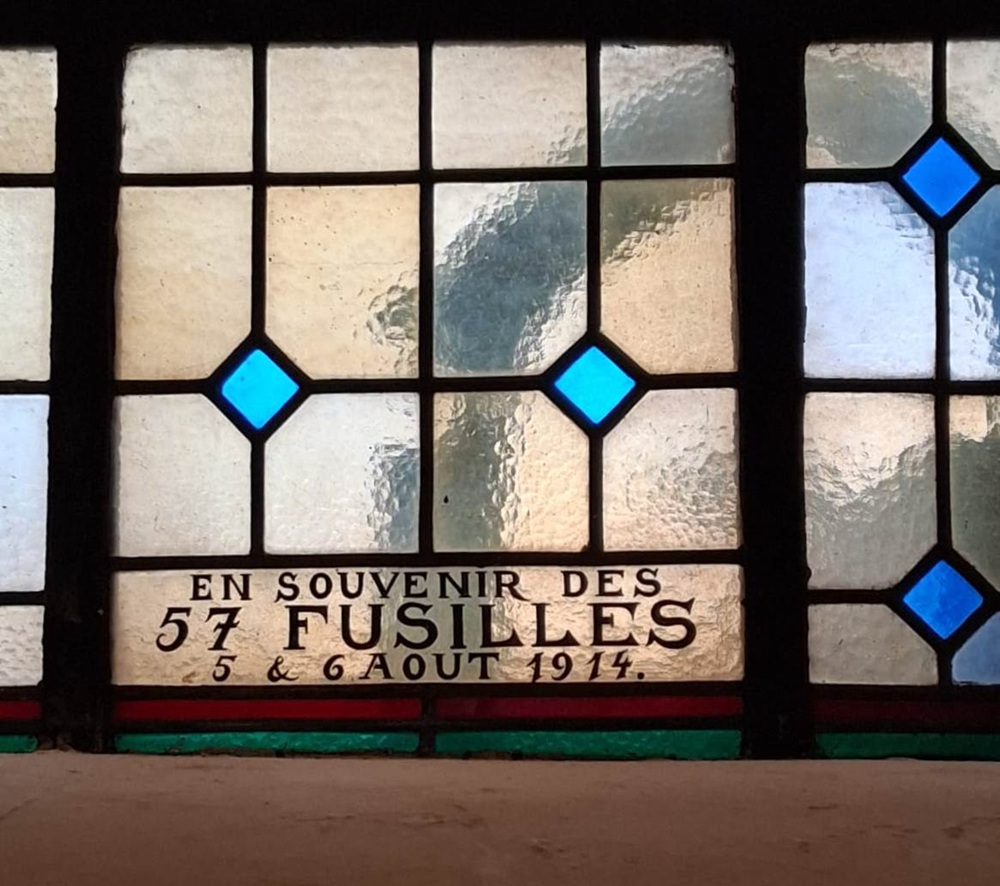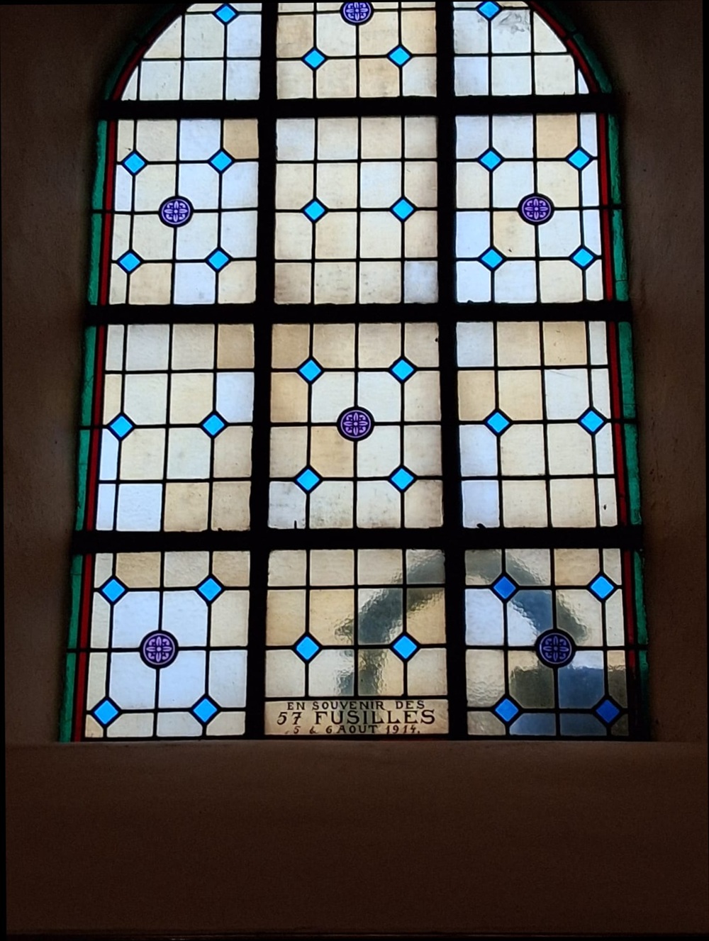 Localisation: Le Fief, à l'intérieur de l'église Saint-Hadelin. Coordonnées GPS: +50°35'31.6", +5°43'08.5" Inscriptions "EN SOUVENIR DES 57 FUSILLÉS 5 & 6 AOÛT 1914" Informations complémentaires Quatre monuments commémorent les fusillés d’Olne. Curieusement, il y a de grandes variations entre eux dans le nombre des victimes : 65 pour le monument de 1919 à Vieux-Sart, 57 pour le vitrail de l’église de Saint-Hadelin et sur le monument du cimetière, 37 puis 65 sur le monument dans la campagne de Vieux-Sart. Dans l’église de Saint-Hadelin, une simple verrière, pareille aux autres vitraux de la nef, porte une dédicace aux fusillés. (Source [276]) Ce monument ne comporte pas de noms de victimes de guerre |