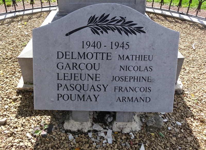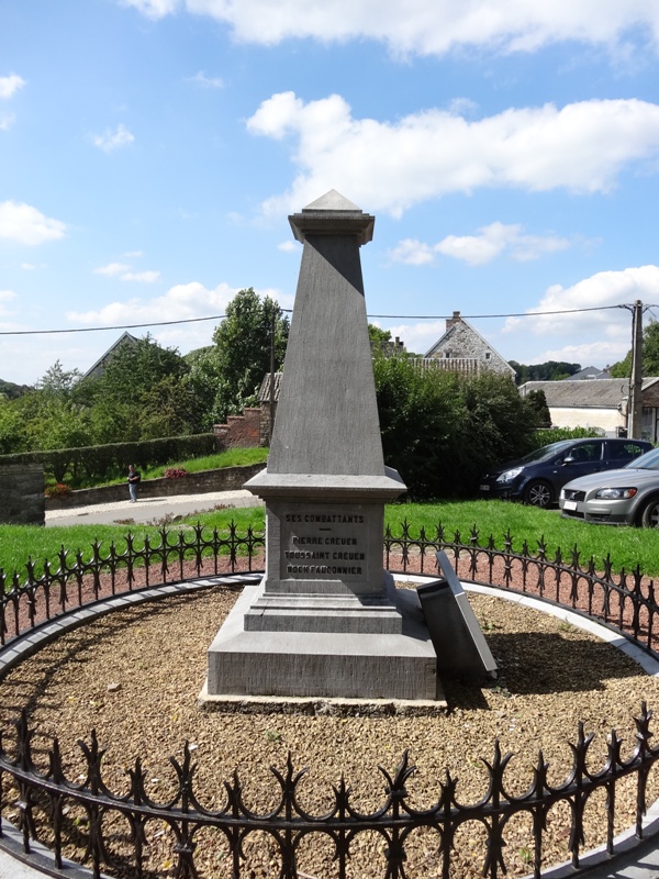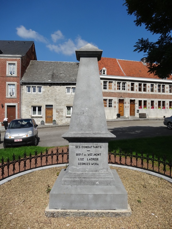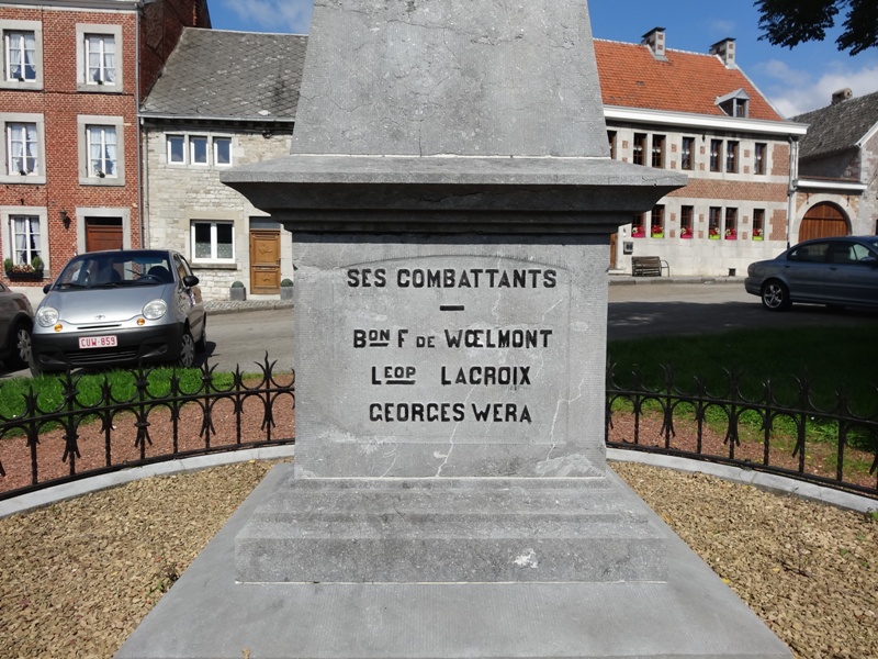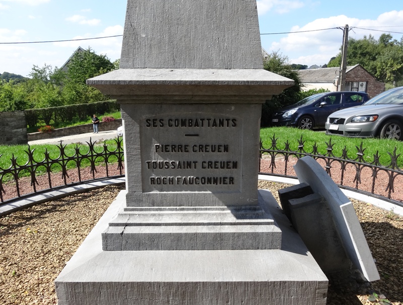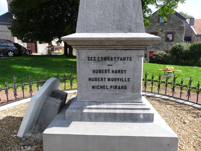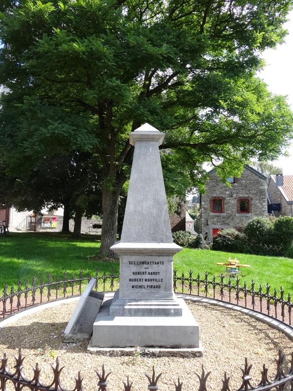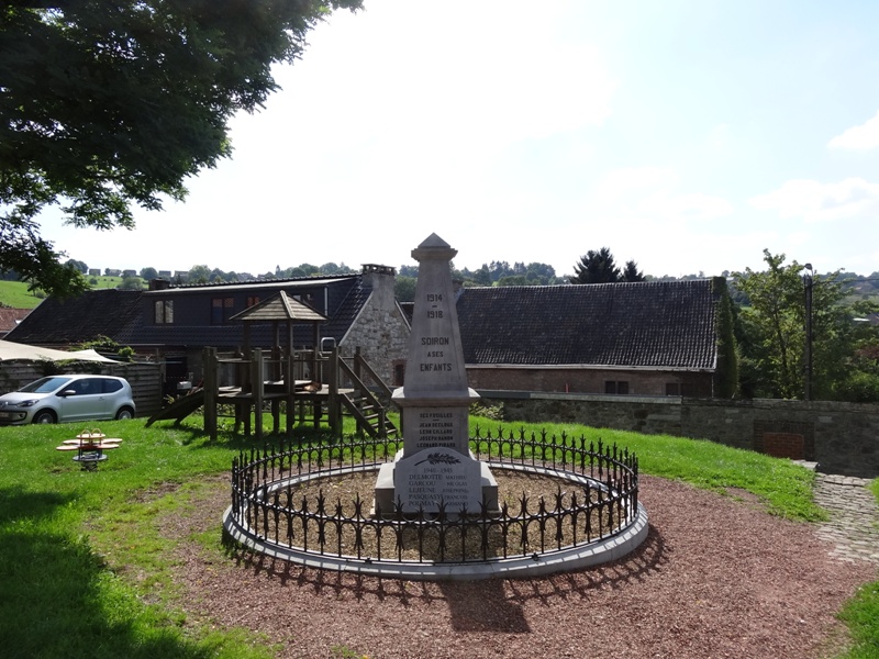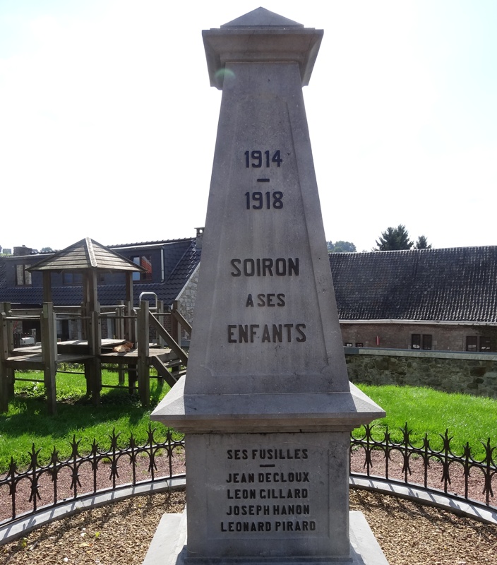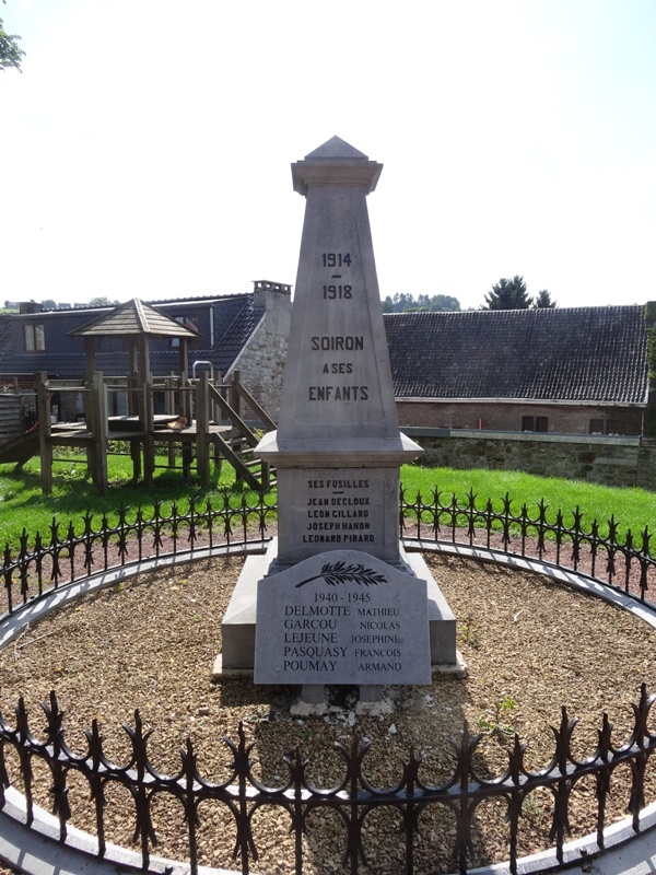 Localisation: Soiron-Centre, à proximité immédiate de l'église. Coordonnées GPS: +50° 35' 32.25", +5° 47' 24.00". Inscriptions Face avant "1914 / 1918 SOIRON À SES ENFANTS SES FUSILLÉS [Quatre noms, classés par ordre alphabétique]" Face latérale droite "SES COMBATTANTS [Trois noms, classés par ordre alphabétique]" Face latérale gauche "SES COMBATTANTS [Trois noms, classés par ordre alphabétique]" Face arrière "SES COMBATTANTS [Trois noms, classés par ordre alphabétique]" Plaque 1940 - 1945, devant le monument proprement dit "1940 - 1945 [Cinq noms, classés par ordre alphabétique]" Décision de construction: 19 mai 1919 (Source [113]) Inauguration: Monument : 16 mai 1920 (Source [113]) Stèle 1940-1945 : 3 mai 1951 (Source: Bulletin des Amis du Ban de Soiron) Architecte: BASTIN, Franz (Source [113]) Sculpteur: DELREZ, Jean (Source [113]) Entrepreneur: DELREZ, Jean (Source [113]) Commanditaire: L'administration communale (Source [113]) Prix: 4.575 francs Financement: Souscriptions publiques et subsides de l’administration communale (Source [113]) Par ailleurs, on trouve dans le cimetière communal la sépulture d'une victime civile de la guerre 1914-1918. Son nom a été ajouté dans la base de données Plus d'informations concernant les deux guerres à Soiron: Soiron à travers les âges Voir les noms mentionnés sur ce monument |
