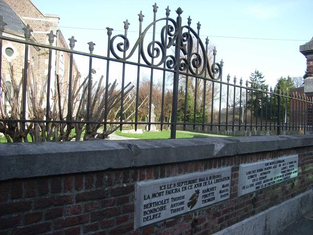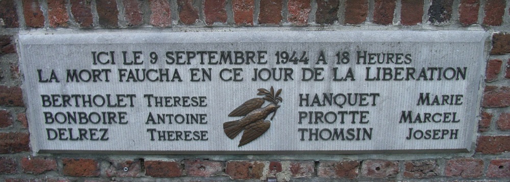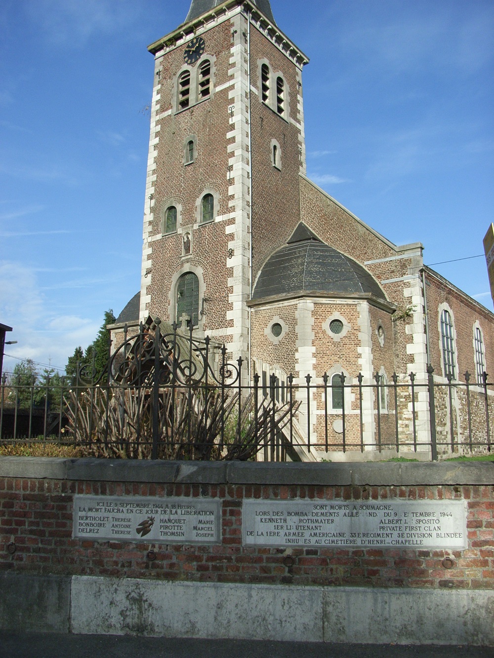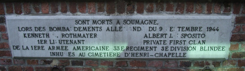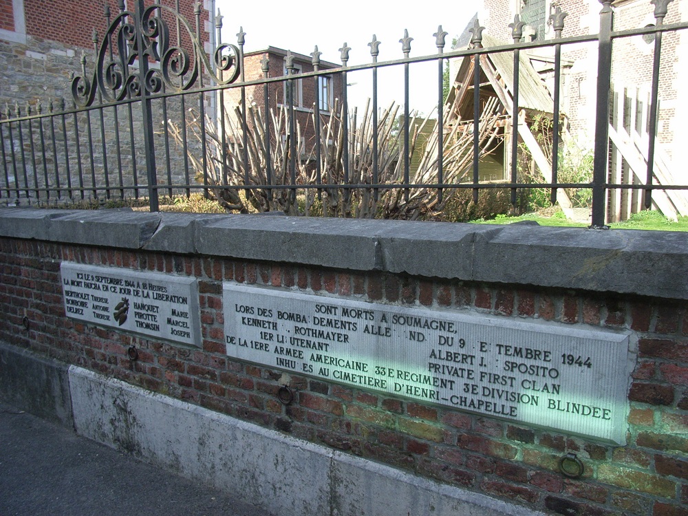 Localisation: Sur le mur d'enceinte de l'église Saint-Lambert, à l'intersection des rues Rosa Luxembourg et Pierre Curie. Coordonnées GPS: +50°36'43.53", +5°44'52.70" Inscriptions Plaque de gauche "ICI LE 9 SEPTEMBRE 1944 À 18 HEURES LA MORT FAUCHA EN CE JOUR DE LA LIBÉRATION [Six noms, classés par ordre alphabétique]" Plaque de droite "SONT MORTS À SOUMAGNE LORS DES BOMBARDEMENTS ALLEMANDS DU 9 SEPTEMBRE 1944 [Deux noms, non classés par ordre alphabétique] DE LA 1ERE ARMÉE AMÉRICAINE 33E RÉGIMENT 3E DIVISION BLINDÉE INHUMÉS AU CIMETIÈRE D'HENRI-CHAPELLE" Voir les noms mentionnés sur ces plaques |