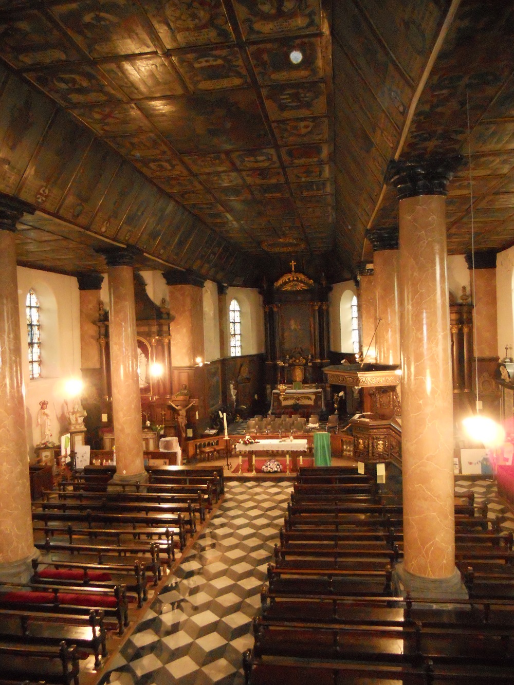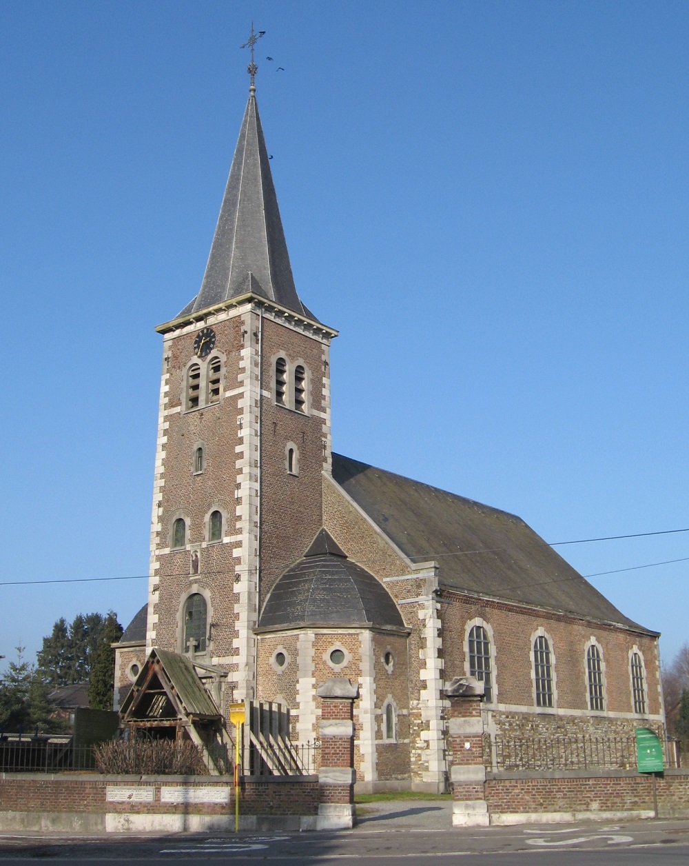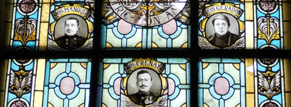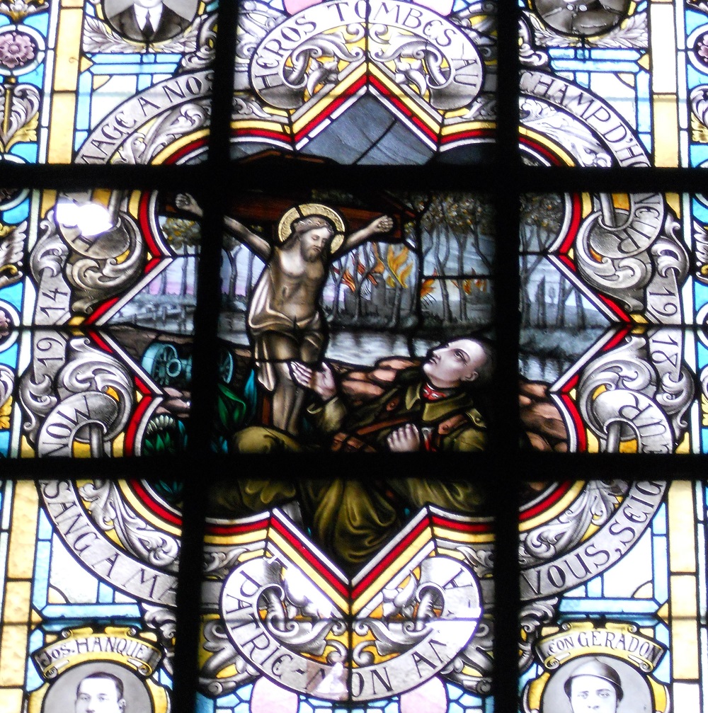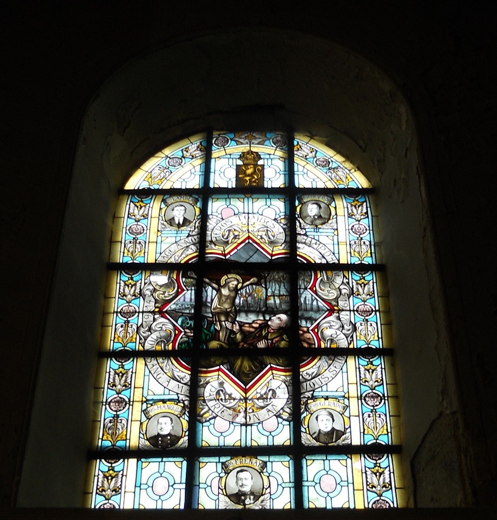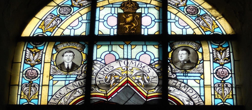 Localisation: Église Saint-Lambert (nef, côté sud), à l'intersection des rues Rosa Luxembourg et Pierre Curie. Coordonnées GPS: +50°36'43.53", +5°44'52.70" Inscriptions "HOMMAGE À NOS HÉROS TOMBÉS AU CHAMP D'HONNEUR 1914 | 1918 MON SANG À MA PATRIE - MON ÂME À VOUS,SEIGNEUR [Cinq noms, non classés par ordre alphabétique, avec portrait]" Description Le Christ en croix apparaît à un soldat mourant sur le champ de bataille. Les portraits avec les noms de cinq victimes sont disposés autour du grand médaillon central polylobé (Source [492]) Réalisation : Atelier Osterrath, 1923 (restauré en 1940 par l'atelier Osterrath) (Source [492]). Dimensions : Hauteur: environ 2,80 mètres (Source [492]). Voir les noms des victimes citées sur le vitrail |