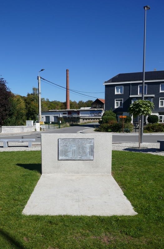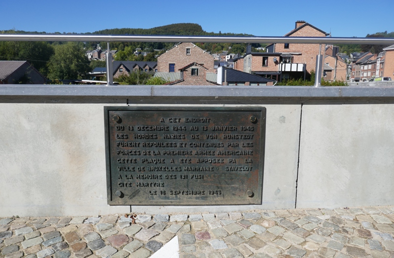 Localisation: Sur la nouvelle esplanade, à côté du pont sur l'Amblève, au carrefour de la Rue des Iles, de la Route de Wanne et de Stockeu. Coordonnées GPS: +50°23'29.21", +5°55'55.26" Inscriptions Sur la plaque en bronze, à proximité du half-track "À CET ENDROIT DU 18 DÉCEMBRE 1944 AU 13 JANVIER 1945 LES HORDES NAZIES DE VON RUNSTEDT FURENT REFOULÉES ET CONTENUES PAR LES FORCES DE LA PREMIÈRE ARMÉE AMÉRICAINE. CETTE PLAQUE A ÉTÉ APPOSÉE PAR LA VILLE DE BRUXELLES MARRAINE DE STAVELOT À LA MÉMOIRE DES 131 FUSILLÉS DE CETTE CITÉ MARTYRE LE 16 SEPTEMBRE 1945" Sur la plaque en plexiglas, à proximité des hampes de drapeaux "POUR LEUR GRANDE CONTRIBUTION À LA MÉMOIRE DE CE LIEU, LA VILLE DE STAVELOT ET SES HABITANTS REMERCIENT JULIA ET MARCEL OZER, RENÉ LEJEUNE ET JOSÉ TOMBEUX" Sur le monument "SUR CES RIVAGES DE L'AMBLÈVE FURENT MASSACRÉES PAR LES ALLEMANDS 26 DE NOS 138 VICTIMES STAVELOTAINES EN SEPTEMBRE 1944 [Un nom, avec âge de décès] EN DÉCEMBRE 1944 [25 noms, avec âge de décès, classés par ordre alphabétique] SOUVENEZ-VOUS" Informations complémentaires: Le M3 Half-track est une autochenille blindée, transport de troupes des forces armées des États-Unis, principalement utilisée lors de la Seconde Guerre mondiale. Voir les noms mentionnés sur le monument |